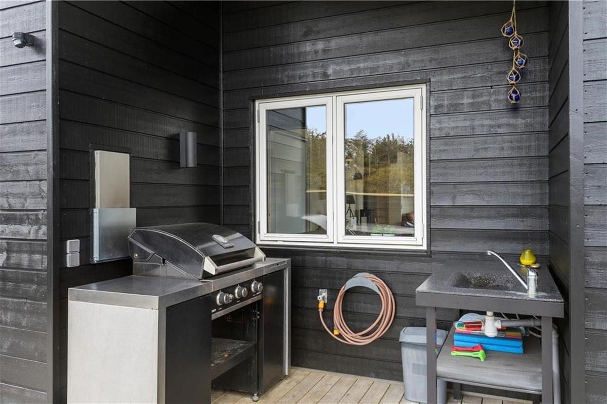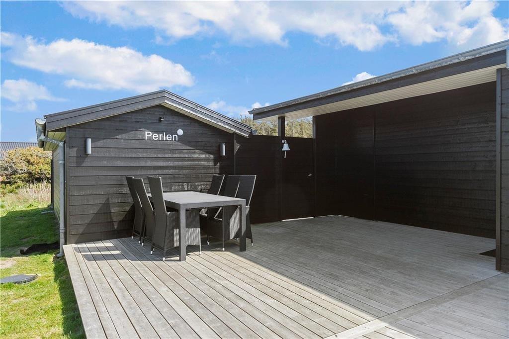 Am Ferienhaus gibt es eine große Terrasse mit reichlich Platz, um das Sommerleben auf Sonnenliegen zu genießen oder leckeres Essen auf dem Grill zuzubereiten. Zusätzlich steht eine Außenküche mit Spüle zur Verfügung. Ein Teil der Terrasse ist abgeschirmt, sodass man dort ganz in Ruhe entspannen kann. In diesem Bereich gibt es auch eine Außendusche mit warmem Wasser sowie Zugang zur Sauna im angrenzenden Annex. Außerdem ist der Garten mit einem 90 cm hohen Hundezaun eingezäunt.