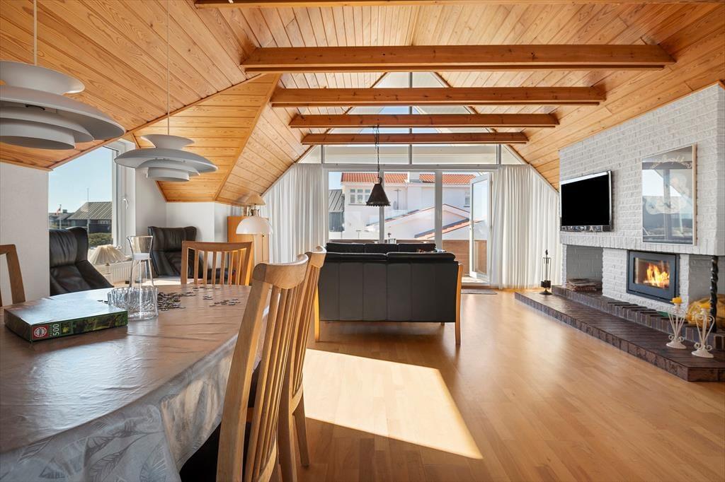 Dieses ältere, aber großteils renovierte zweistöckige Wohnhaus bietet Ihnen einen einzigartigen Ausgangspunkt für Ihren nächsten Urlaub in Løkken, mit Aussicht über die Dächer des Ortes, dem berühmten Küstendenkmal und der Nordsee. Das ältere Erdgeschoss ist mit drei Schlafzimmern und zwei Badezimmern eingerichtet und bietet Platz für bis zu 8 Personen. Zwei der Schlafzimmer sind mit Doppelbetten ausgestattet und eines mit zwei Hochbetten, wovon das eine sich am besten für Kinder eignet. Die Oberetage ist vollkommen renoviert und lädt zum gemütlichen Beisammensein ein – hier befinden sich Küche, Essbereich und das Wohnzimmer mit gemütlichen Qualitätsmöbeln und einem großen Kamin, der an kühlen Abenden schnell wohlige Wärme verbreitet. Sowohl in Richtung Osten, als auch in Richtung Westen gibt es fantastische Terrassenbereiche mit Aussicht über den Badeort Løkken und die tiefblaue Nordsee.