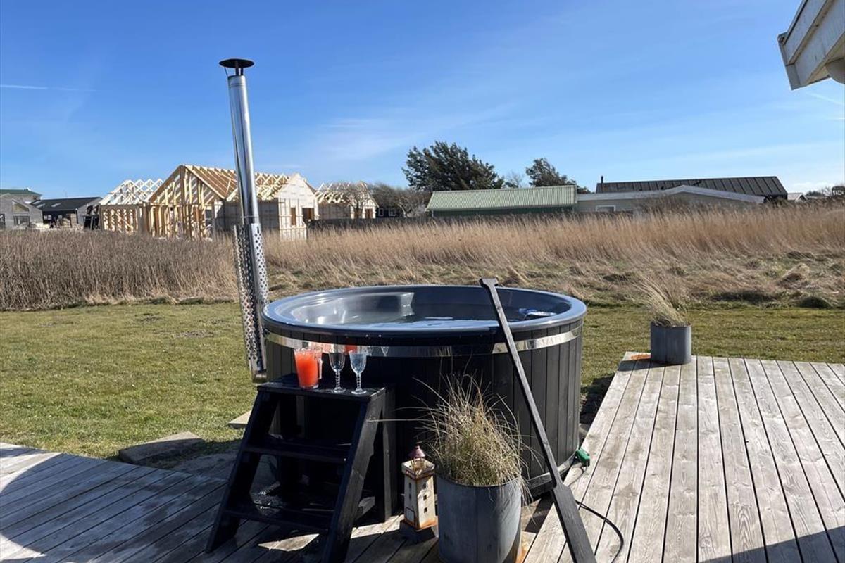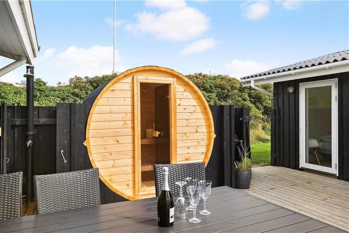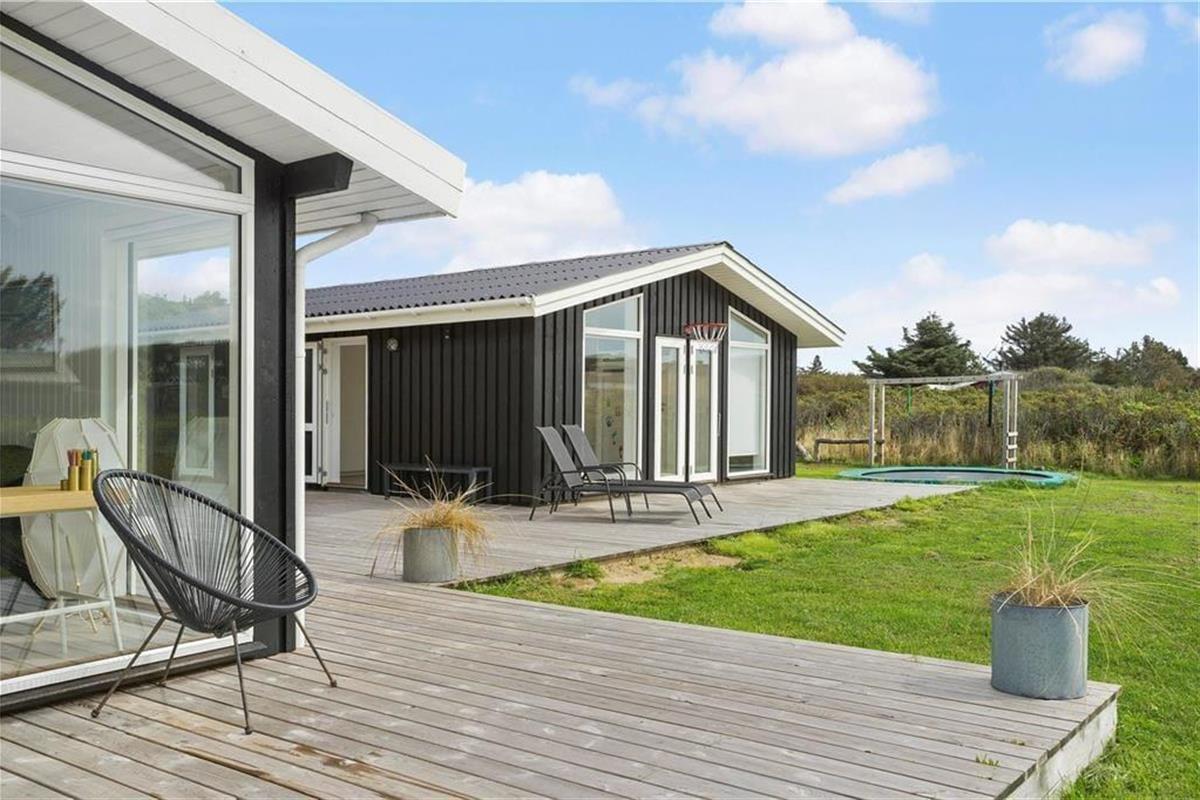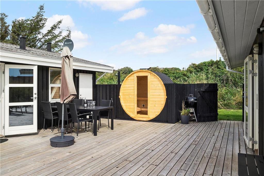 Draußen habt ihr auch viele Möglichkeiten zum Spielen und Genießen des Ferienlebens, denn es gibt unter anderem einen Trampolin und ein Fußballtor auf dem 2000 m² großen Grundstück. Wenn ihr lieber einfach in der Sonne entspannen möchtet, ist die große Holzterrasse perfekt dafür geeignet. Je nach Sonneneinstrahlung und euren Vorlieben könnt ihr euch auf dem nach Süden ausgerichteten Terrassenbereich oder im „Smørhullet“ zwischen dem Sommerhaus und dem Annek niederlassen – dort steht sogar eine Außensauna bereit, um euch aufzuwärmen, wenn ihr nach einem erfrischenden Bad im Vesterhavet zurückkommt.