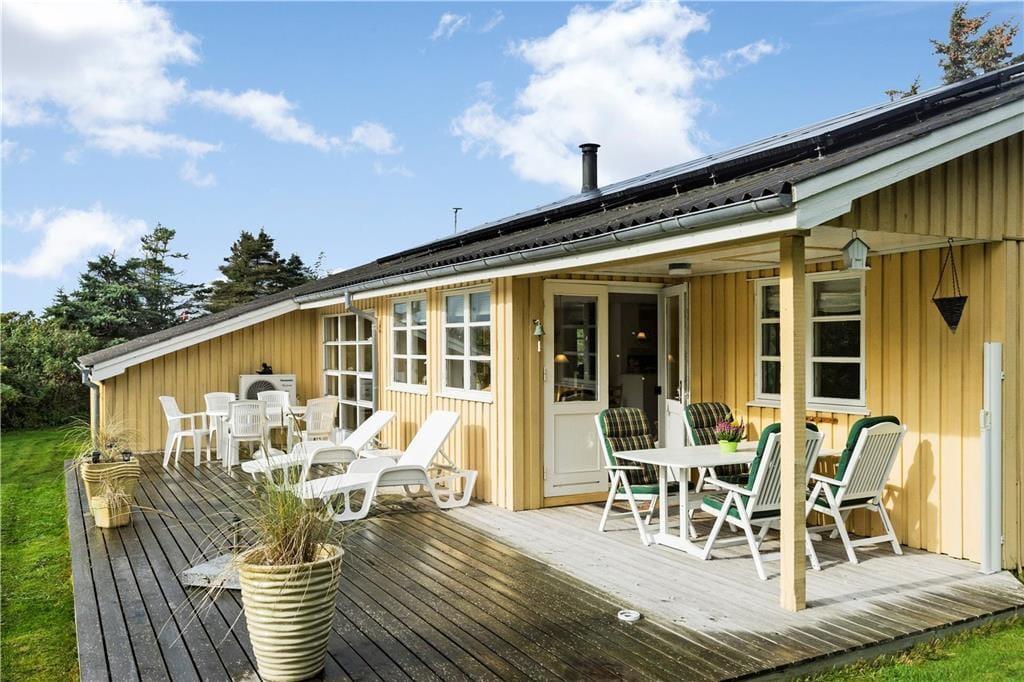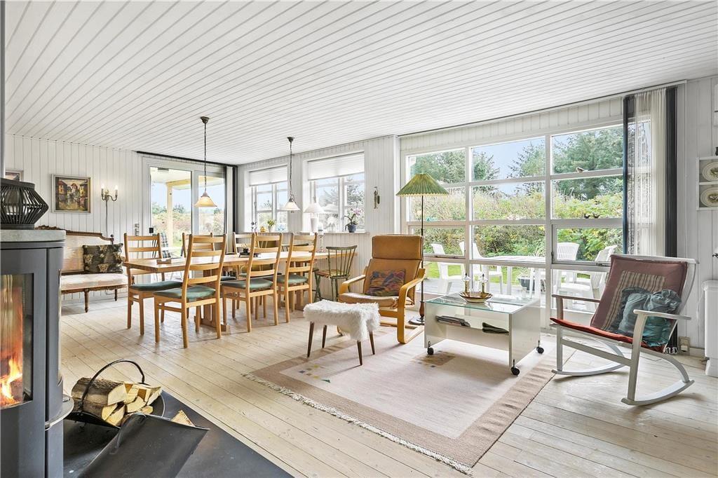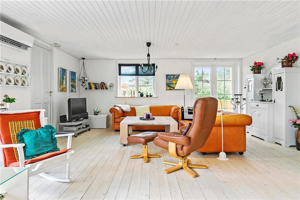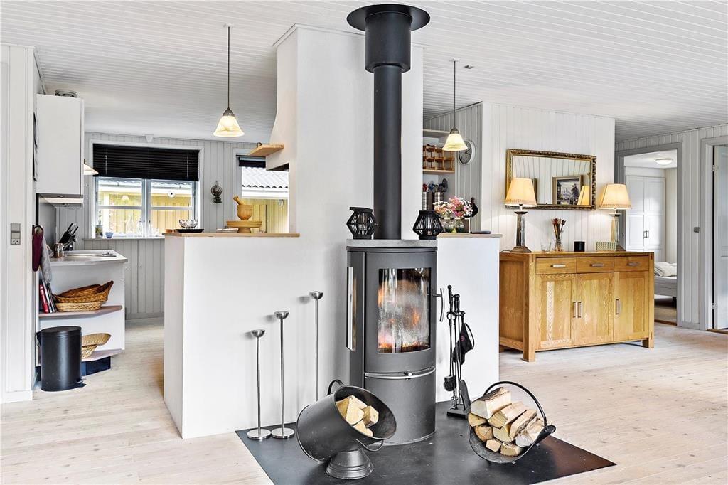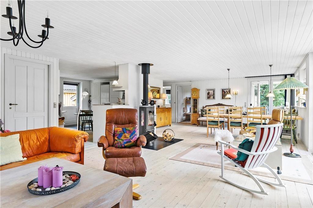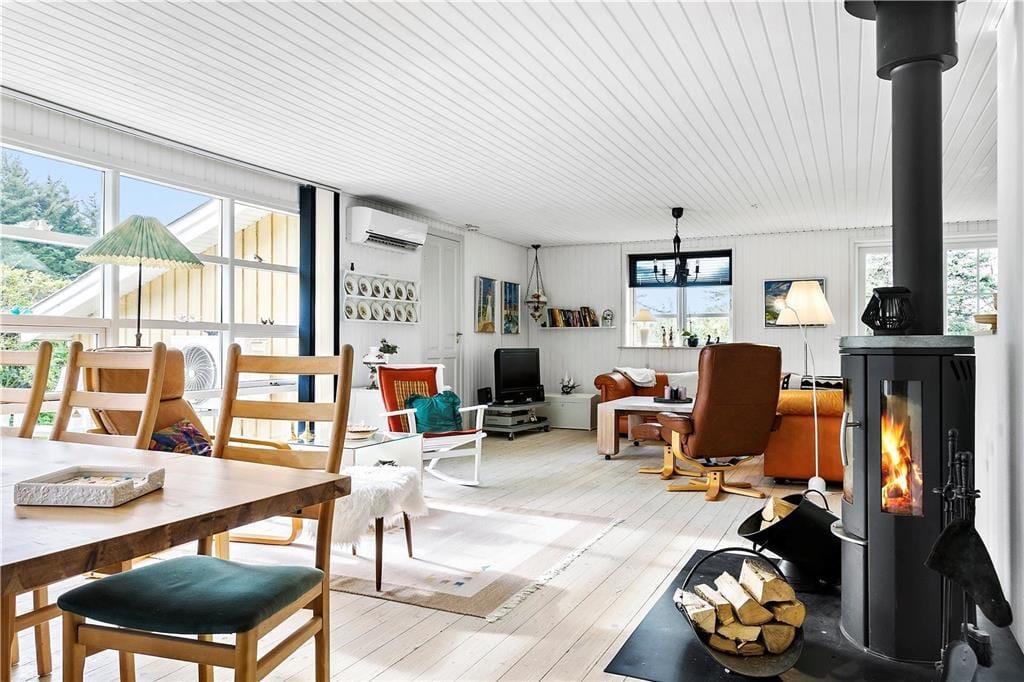 Im Inneren des gelb gestrichenen Holz-Sommerhauses passen die Möbel perfekt zu den hellen Räumen, die aus drei Schlafzimmern, zwei Badezimmern und einem gemütlichen Wohnzimmer mit integrierter Küche bestehen. Insgesamt stehen Ihnen großzügige 130 m² zur Verfügung, besonders der Wohnbereich ist angenehm geräumig mit vielen Sitzplätzen und gemütlichen Ecken. Zum Beispiel kann der Morgenkaffee am kleinen Esstisch in der gut ausgestatteten Küche genossen werden, während das Abendessen am langen Tisch im Wohnzimmer serviert werden kann – vielleicht sogar mit Feuer im Kaminofen, wenn das Wetter dazu einlädt. Wenn Sie sich ordentlich aufwärmen möchten, können Sie auch die Sauna nutzen, die sich direkt an eines der Badezimmer anschließt.