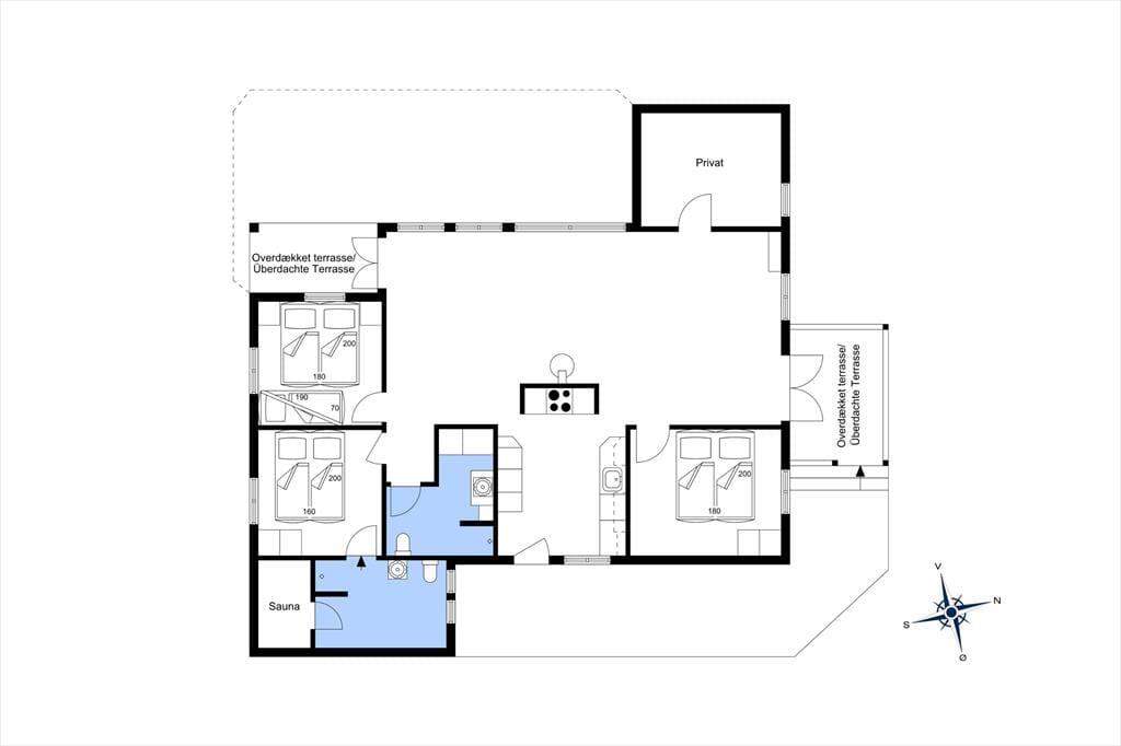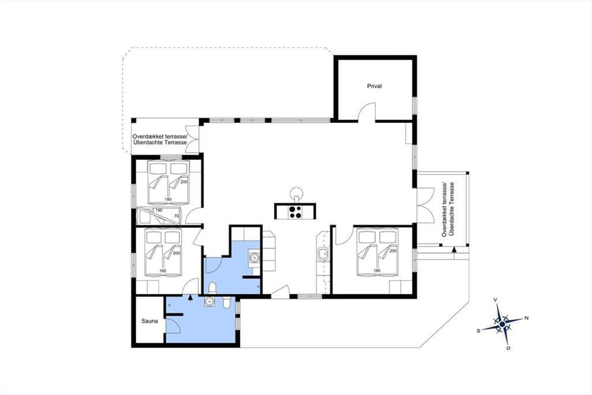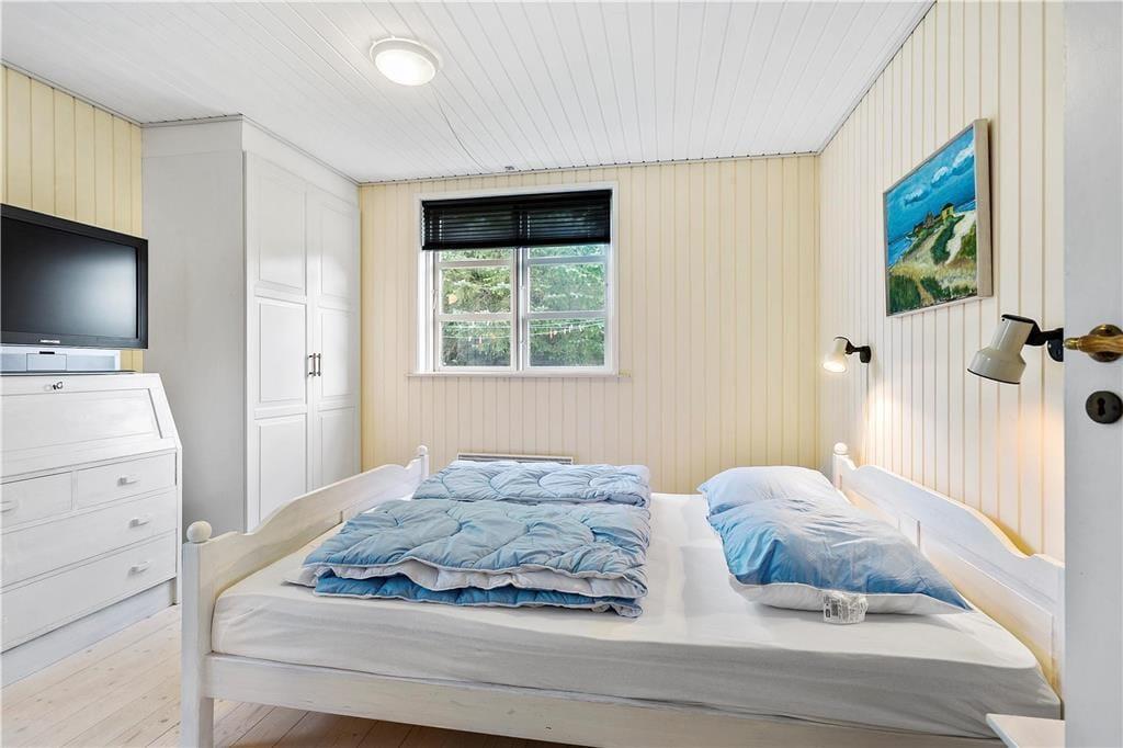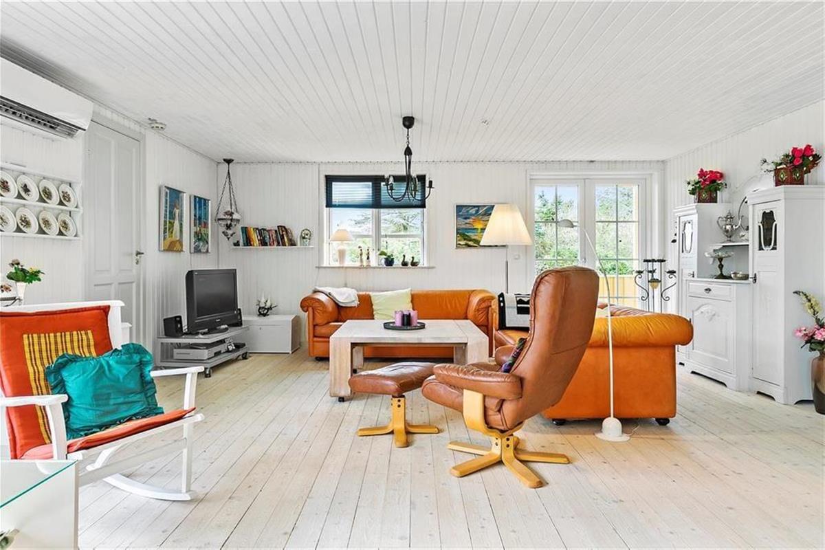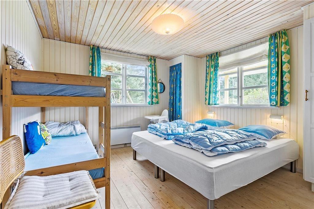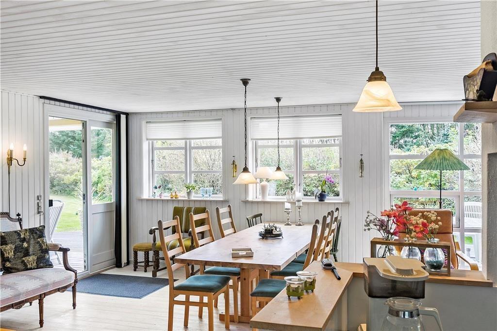 Im Inneren des gelb gestrichenen Holz-Sommerhauses passen die Möbel perfekt zu den hellen Räumen, die aus drei Schlafzimmern, zwei Badezimmern und einem gemütlichen Wohnzimmer mit integrierter Küche bestehen. Insgesamt stehen Ihnen großzügige 130 m² zur Verfügung, besonders der Wohnbereich ist angenehm geräumig mit vielen Sitzplätzen und gemütlichen Ecken. Zum Beispiel kann der Morgenkaffee am kleinen Esstisch in der gut ausgestatteten Küche genossen werden, während das Abendessen am langen Tisch im Wohnzimmer serviert werden kann – vielleicht sogar mit Feuer im Kaminofen, wenn das Wetter dazu einlädt. Wenn Sie sich ordentlich aufwärmen möchten, können Sie auch die Sauna nutzen, die sich direkt an eines der Badezimmer anschließt.