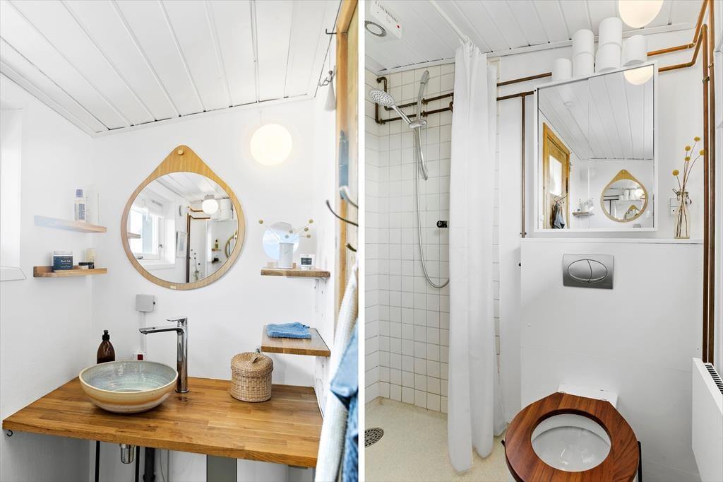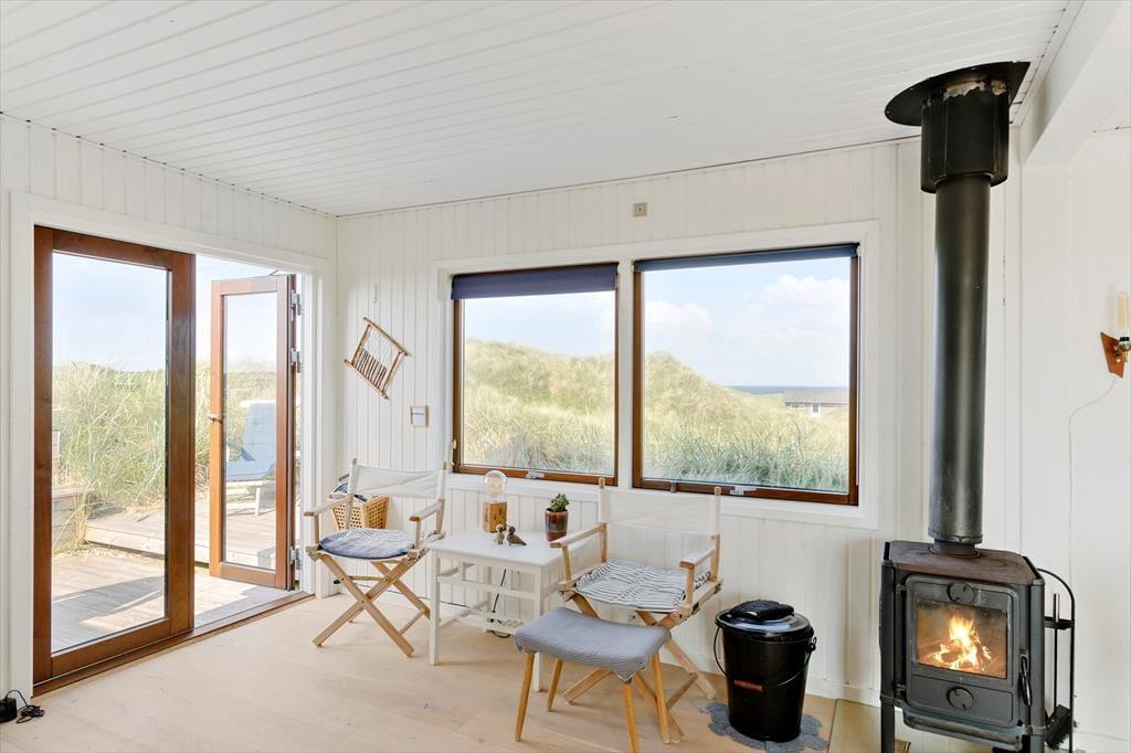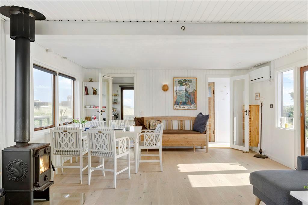 Das hübsche Holzsommerhaus liegt seit 1936 hier in den Dünen, und sowohl innen als auch außen ist deutlich zu erkennen, dass es seitdem liebevoll gepflegt wurde. Die gut erhaltenen Räume wurden geschmackvoll modernisiert, und die Einrichtung passt perfekt zur klassischen Architektur und den wunderschönen Naturumgebungen, die sich durch die Fensteröffnungen von allen Seiten offenbaren. Überall herrscht eine gemütliche Atmosphäre, auch in den drei Schlafzimmern und der Küche – ja, selbst das Badezimmer ist mit hellen Farbtönen und einladenden Details stilvoll eingerichtet. Fast noch schöner als alle anderen Räume ist das Wohnzimmer, ein herrlicher Aufenthaltsraum mit Kaminofen, großen Fenstern, einem wundervollen Lichteinfall und sogar Meerblick.