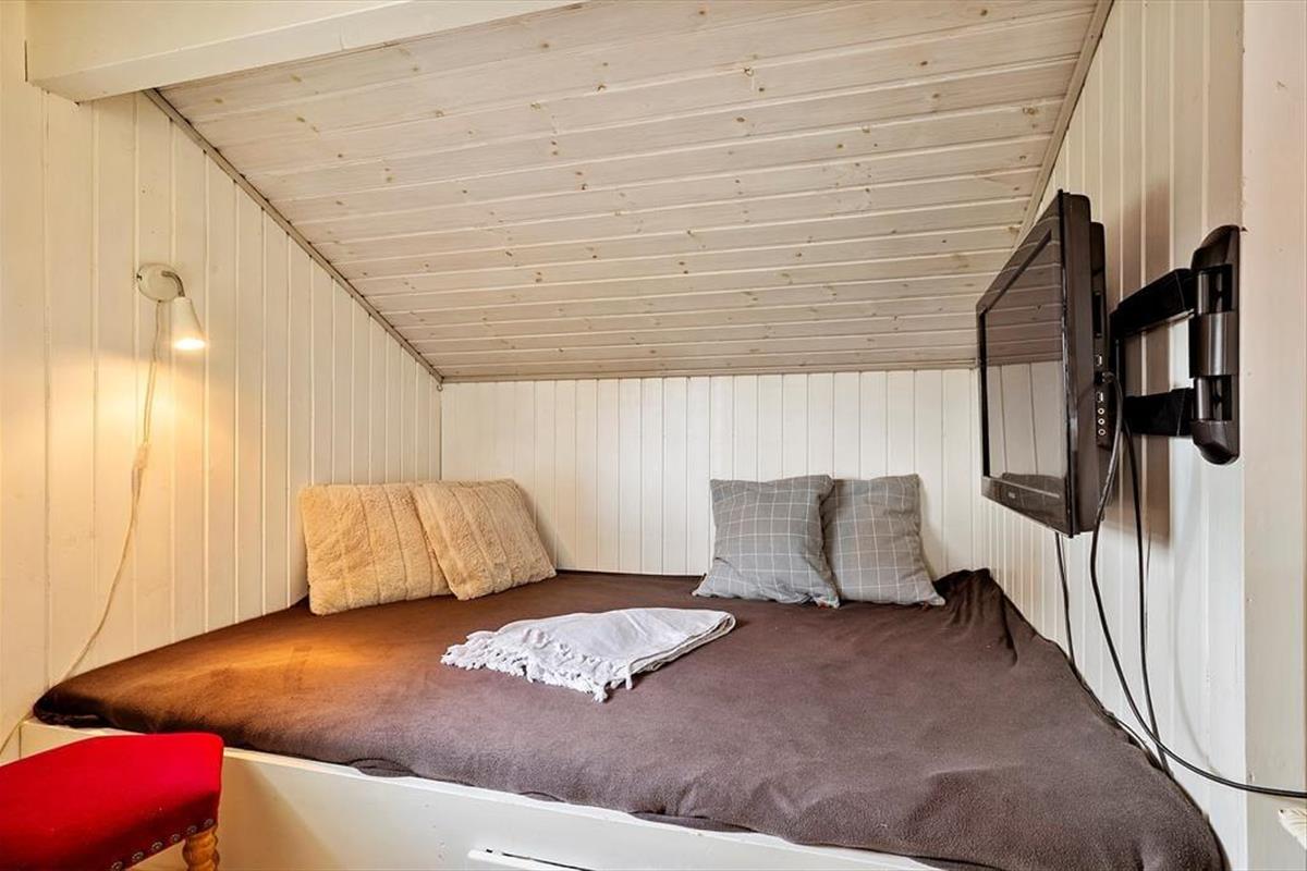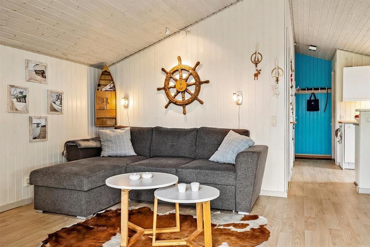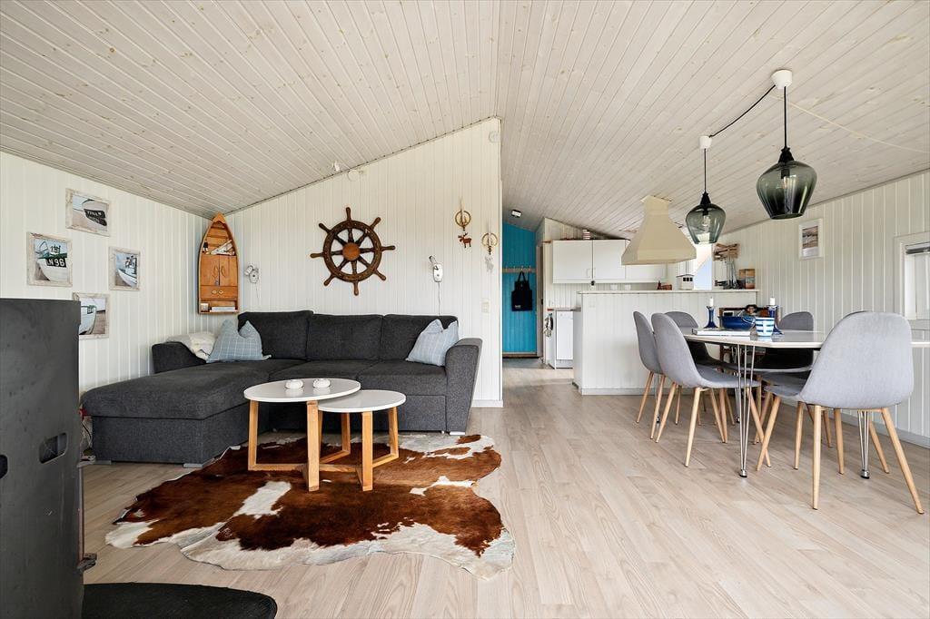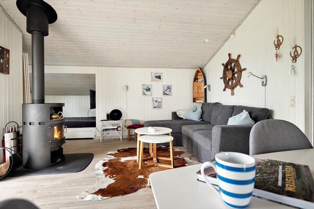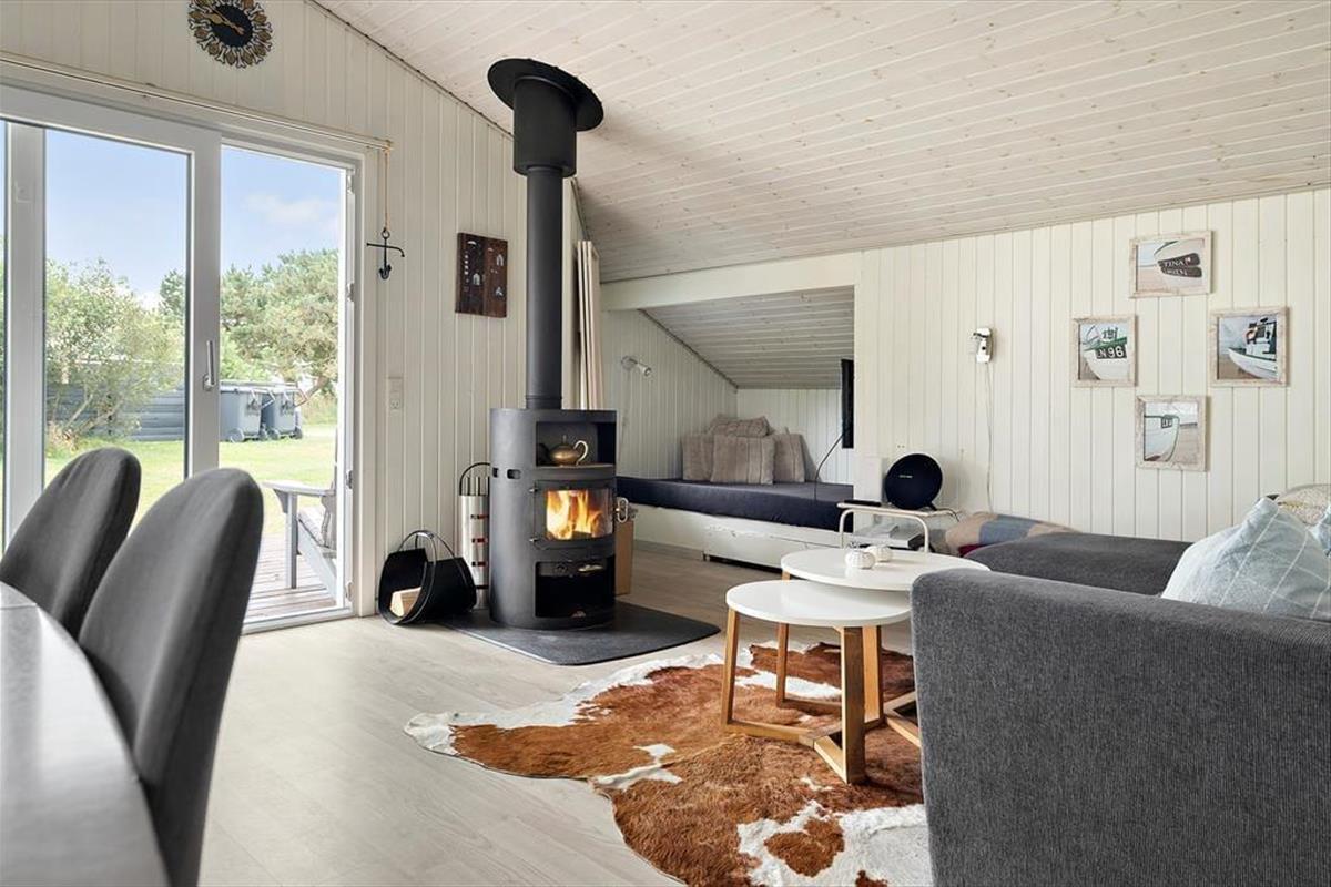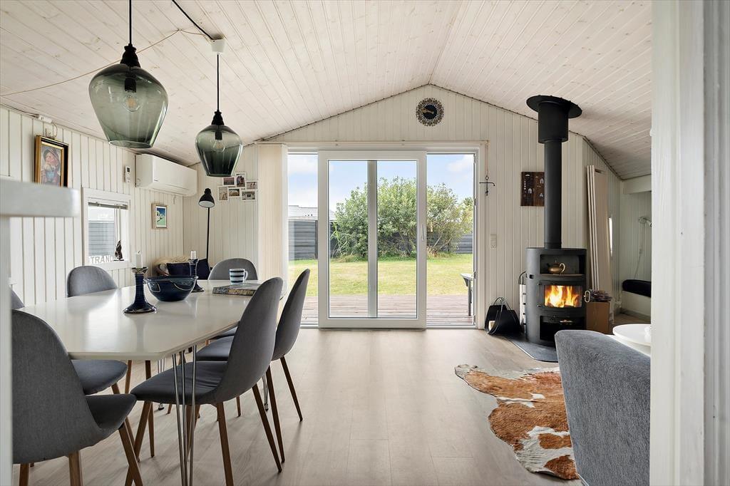 Vom Küchenbereich aus gibt es einen offenen Übergang zum Essbereich und zum Wohnzimmer. Das gesamte Haus ist schön hell und einfach eingerichtet. Sollte das Wetter an einem Tag etwas ungemütlich sein, kann man ein gutes Buch lesen oder mit den Kindern ein Kartenspiel spielen, während man die Wärme des schönen, großen Kaminofens genießt. Direkt am Wohnzimmer befindet sich das 3. Schlafzimmer, das eine Schlafnische mit Doppelbett umfasst. Auch hier gibt es einen Zugang zur großen, schönen Terrasse.