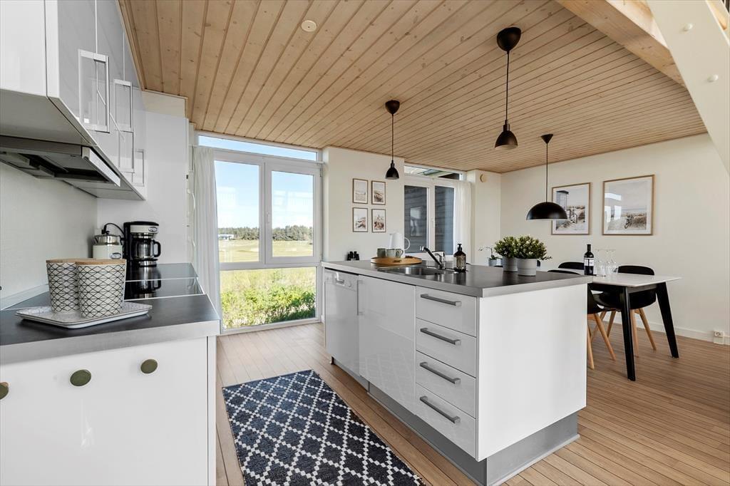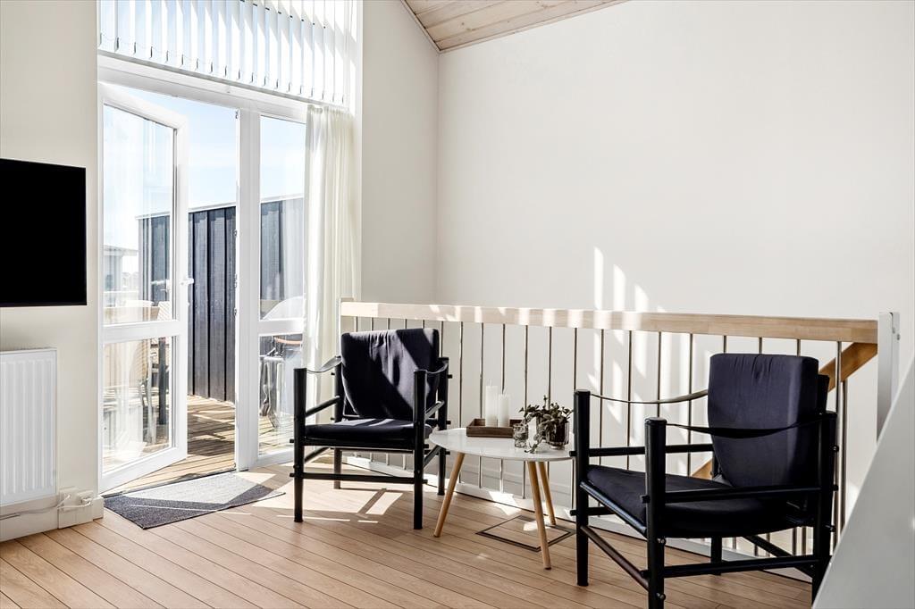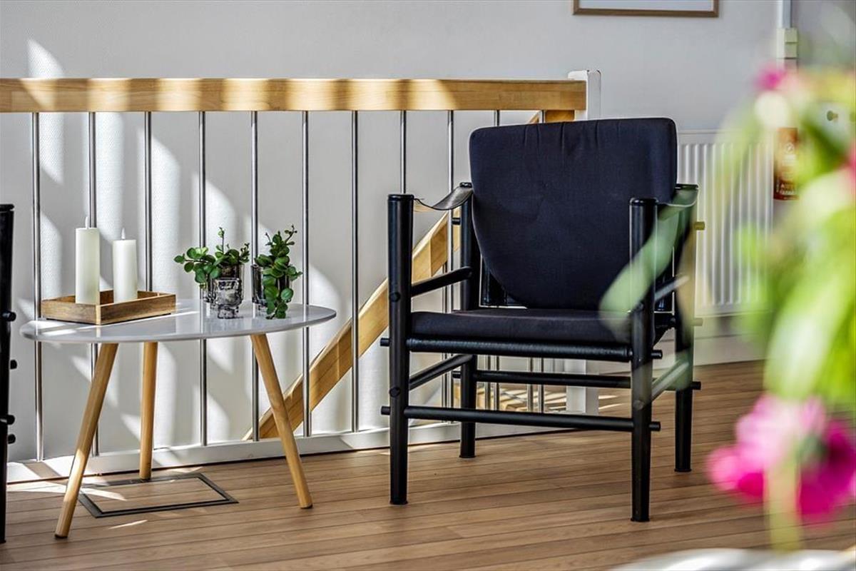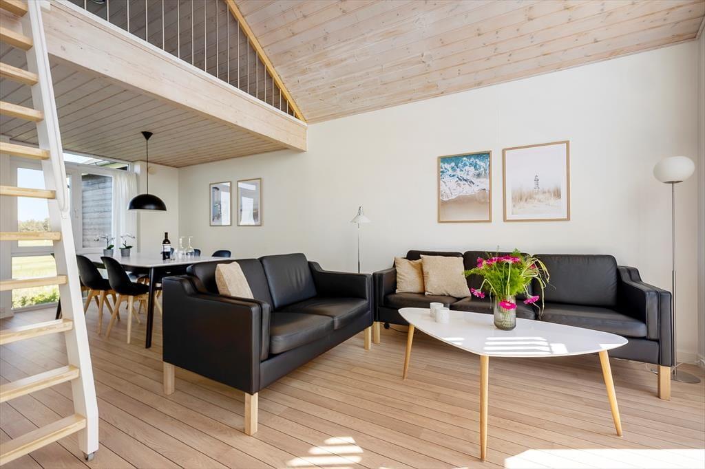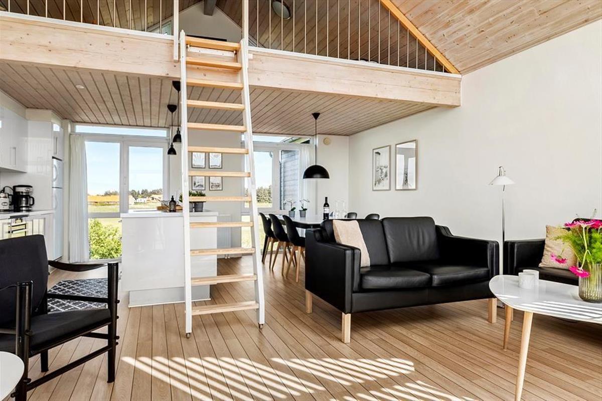 Im Inneren der Wohnung könnt ihr euch auf 96 m² ausbreiten. Diese umfassen unter anderem drei Schlafzimmer, ein Badezimmer und ein großes Wohnzimmer mit integrierter Küche. Die Schlafzimmer befinden sich alle im Erdgeschoss, während das Wohnzimmer das gesamte Obergeschoss einnimmt – und von dort führt sogar eine Treppe zu einem kleinen Dachboden, der schnell zum Lieblingsplatz der jüngsten Urlaubsgäste werden könnte. Das Wohnzimmer ist ein wunderbarer Treffpunkt mit viel Platz zum Spielen, Lesen, Filme schauen und vielem mehr auf dem Sofa und in den übrigen stilvollen Möbeln. Dank der beeindruckenden Deckenhöhe und der großen Fensterfronten ist die Atmosphäre hell und freundlich, und der Ausblick auf die grüne Umgebung ist hervorragend.