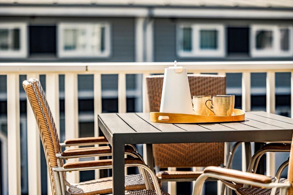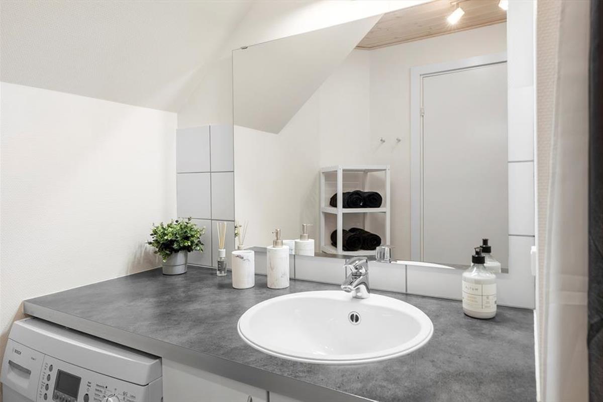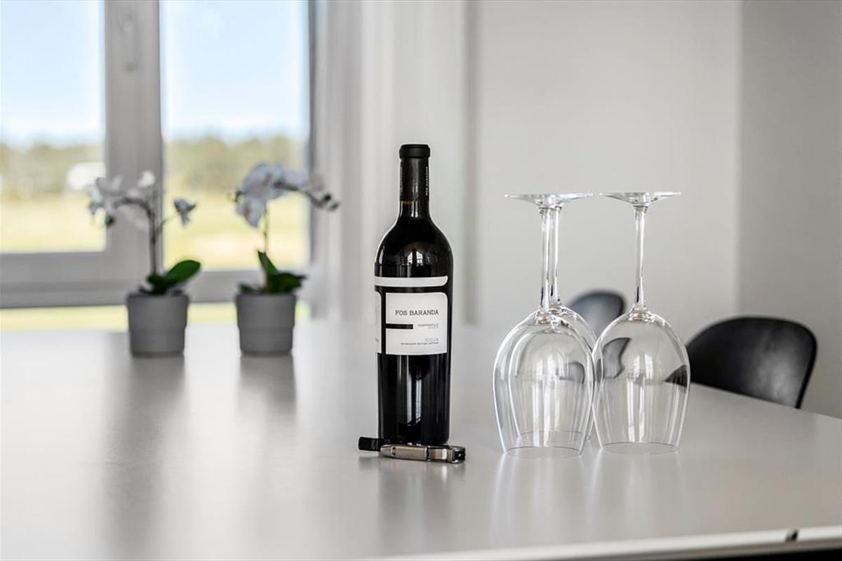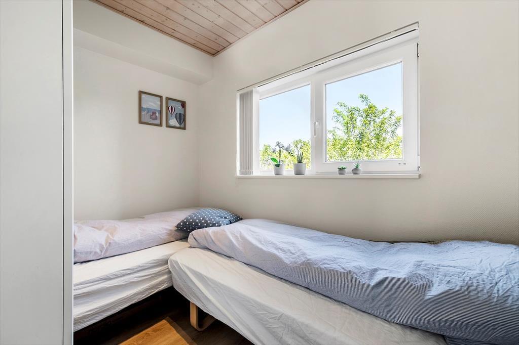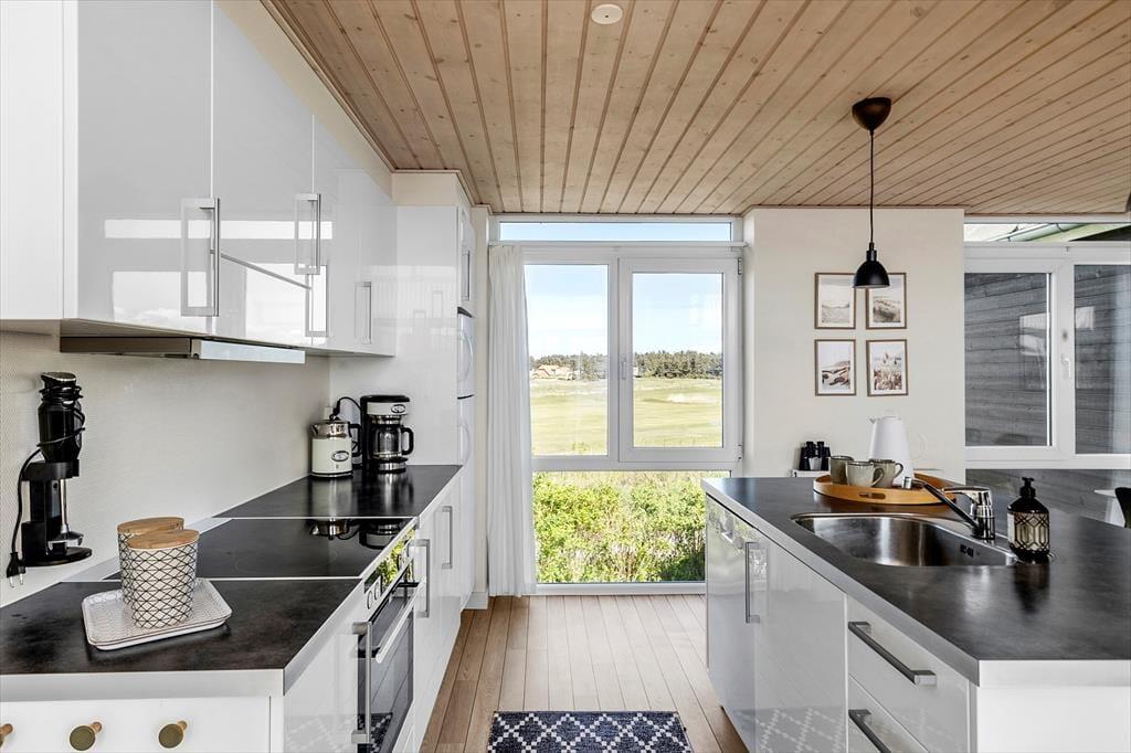 Im Inneren der Wohnung könnt ihr euch auf 96 m² ausbreiten. Diese umfassen unter anderem drei Schlafzimmer, ein Badezimmer und ein großes Wohnzimmer mit integrierter Küche. Die Schlafzimmer befinden sich alle im Erdgeschoss, während das Wohnzimmer das gesamte Obergeschoss einnimmt – und von dort führt sogar eine Treppe zu einem kleinen Dachboden, der schnell zum Lieblingsplatz der jüngsten Urlaubsgäste werden könnte. Das Wohnzimmer ist ein wunderbarer Treffpunkt mit viel Platz zum Spielen, Lesen, Filme schauen und vielem mehr auf dem Sofa und in den übrigen stilvollen Möbeln. Dank der beeindruckenden Deckenhöhe und der großen Fensterfronten ist die Atmosphäre hell und freundlich, und der Ausblick auf die grüne Umgebung ist hervorragend.