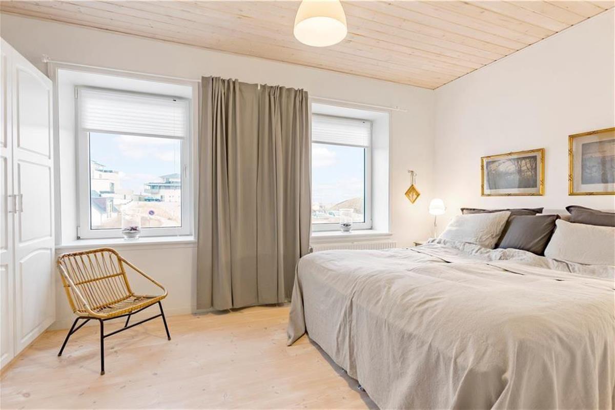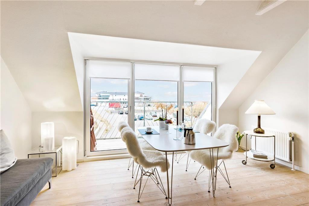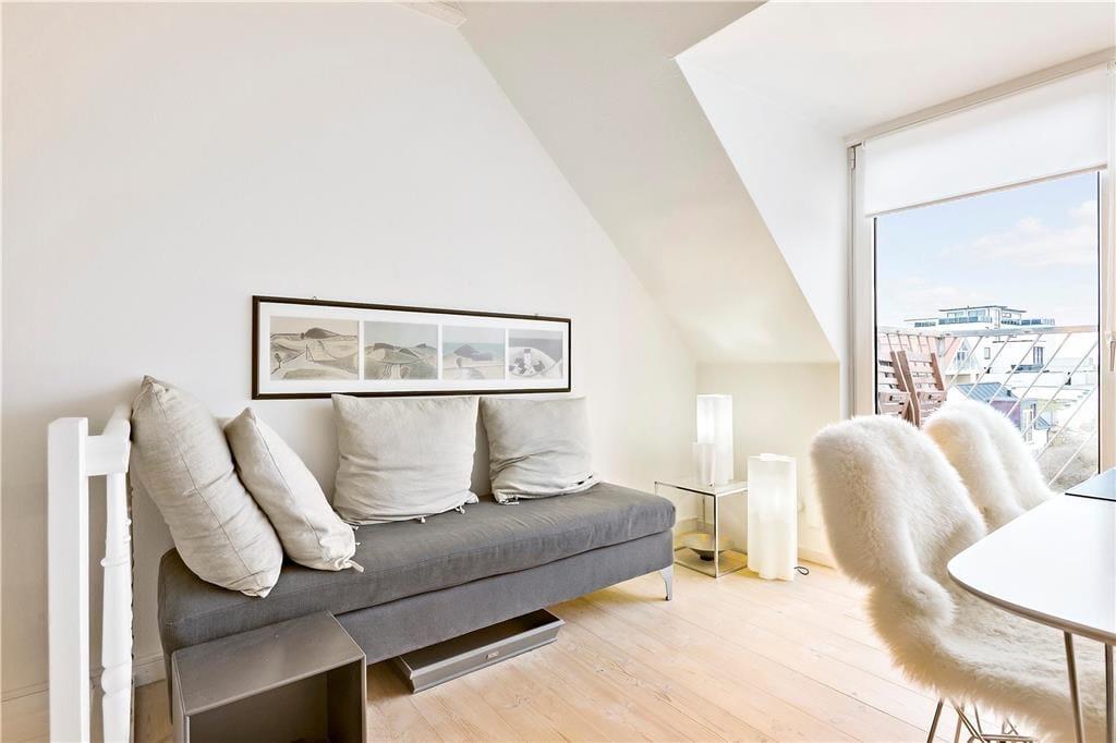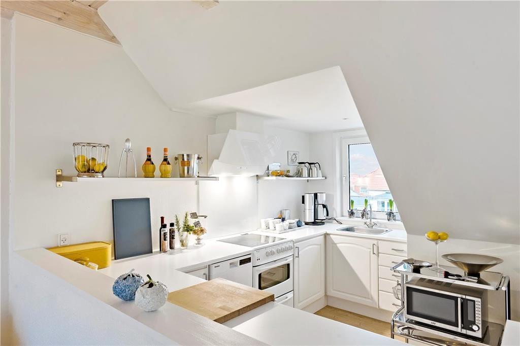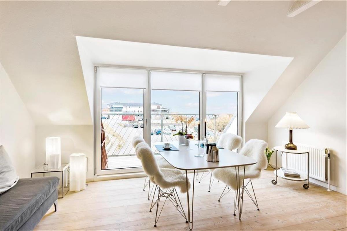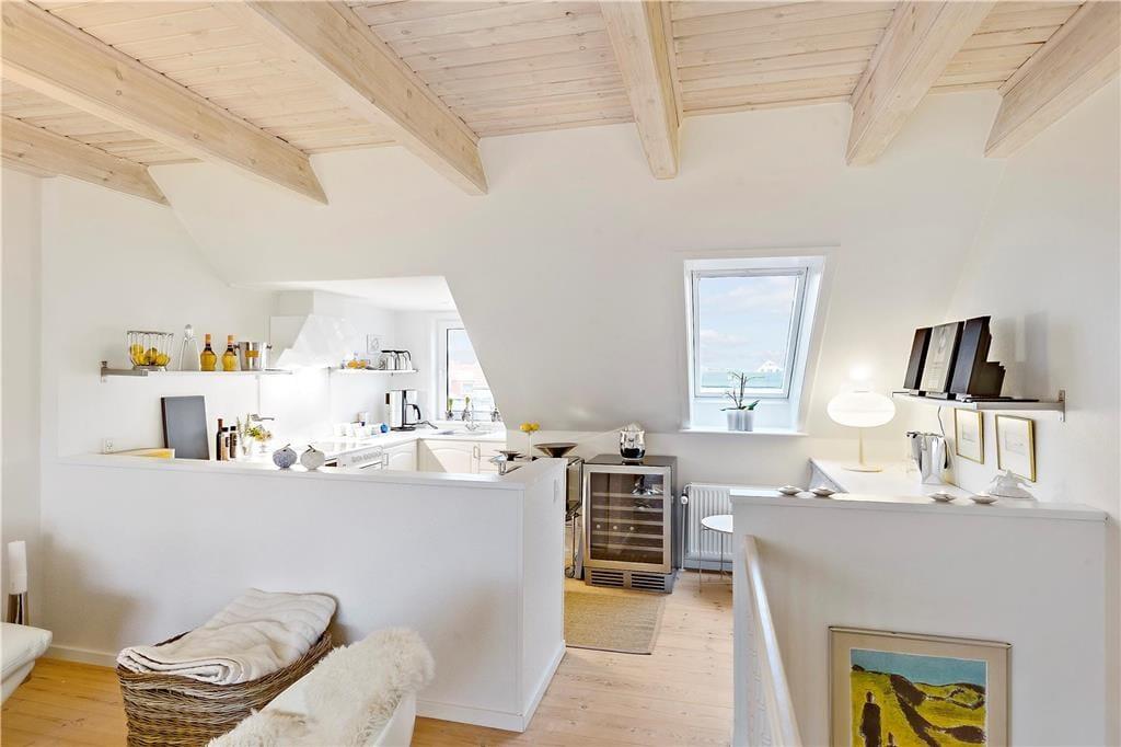 Der Meerblick kann auch drinnen genossen werden – zum Beispiel, wenn Sie am Esstisch im Wohnzimmer mit Ihrem Morgenkaffee, der Tageszeitung und frischen Brötchen vom lokalen Bäcker sitzen. Das Frühstück sowie alle anderen Mahlzeiten können im gut ausgestatteten Küchenbereich zubereitet werden, der offen mit dem elegant eingerichteten Wohnzimmer verbunden ist. Der offene Wohnbereich bildet das gesamte obere Stockwerk der Wohnung, während der Eingang, das Badezimmer und ein großes Schlafzimmer mit Doppelbett im unteren Bereich liegen. Überall ist der Stil hell und einladend, sodass man sich sofort wohl fühlt.
