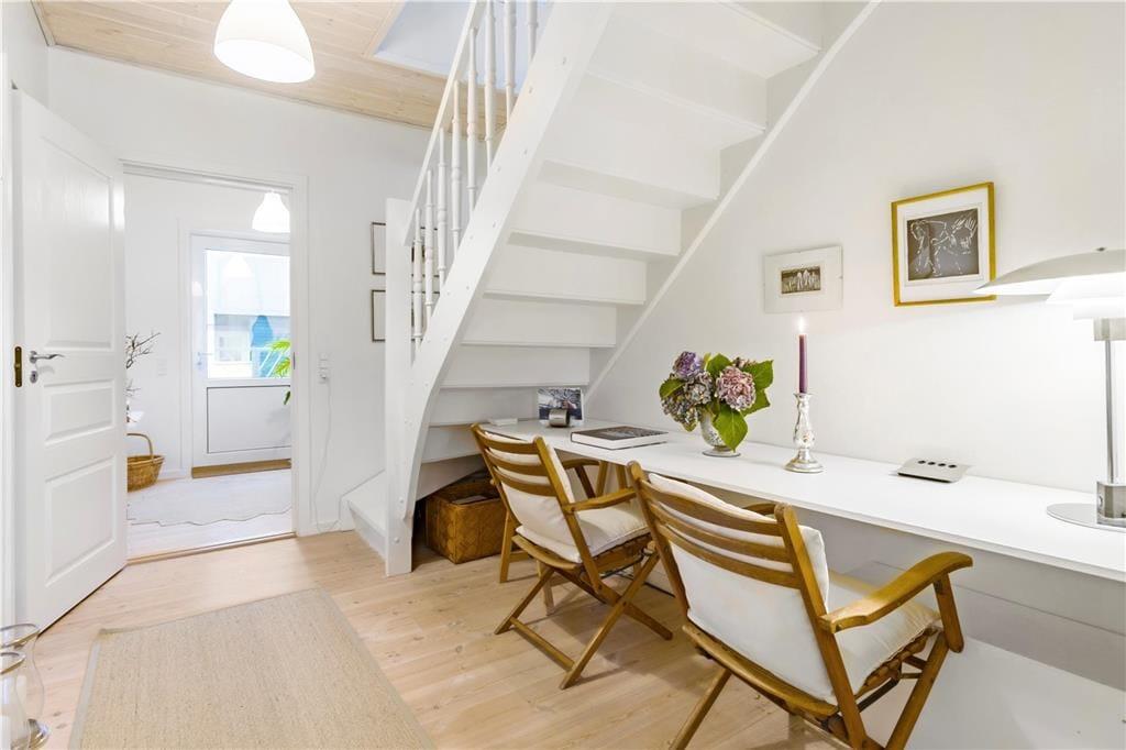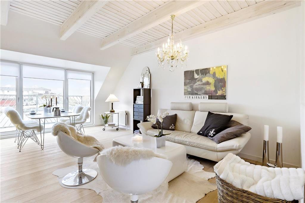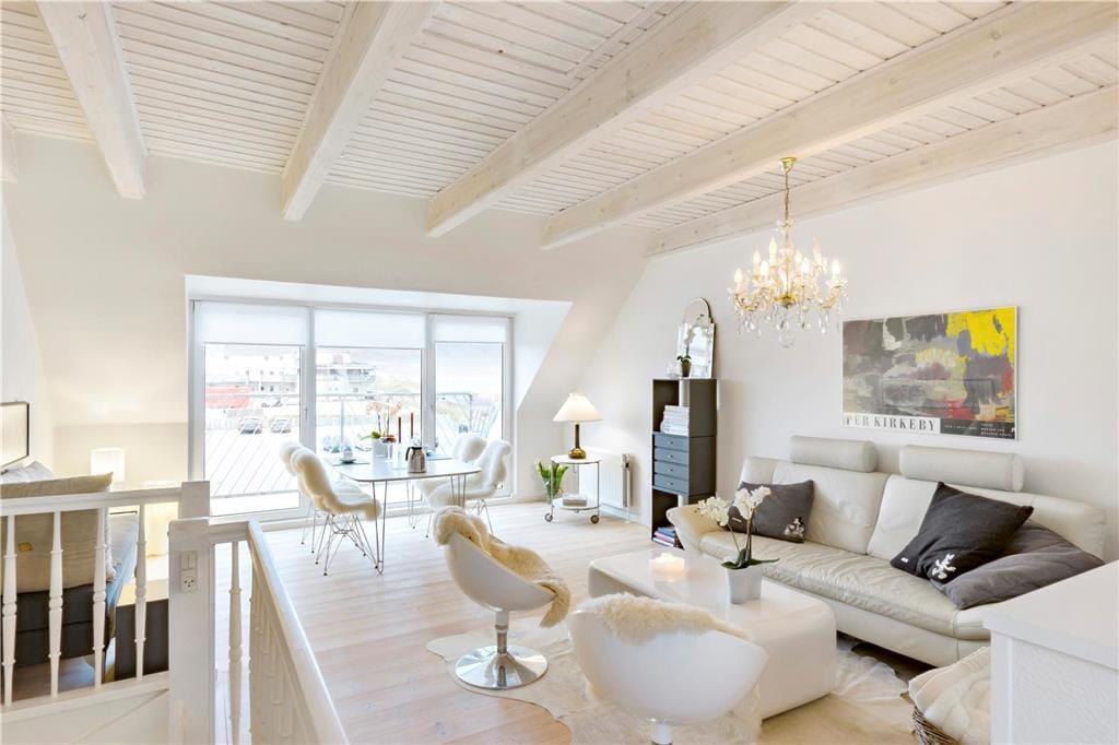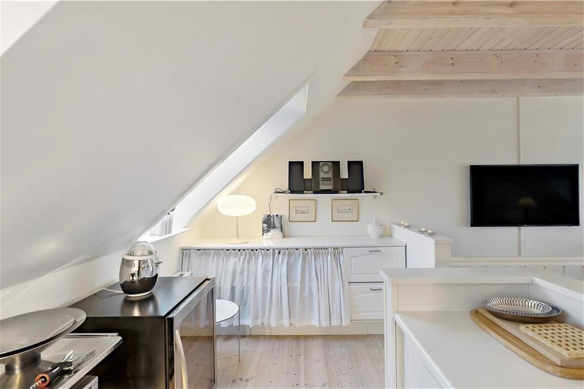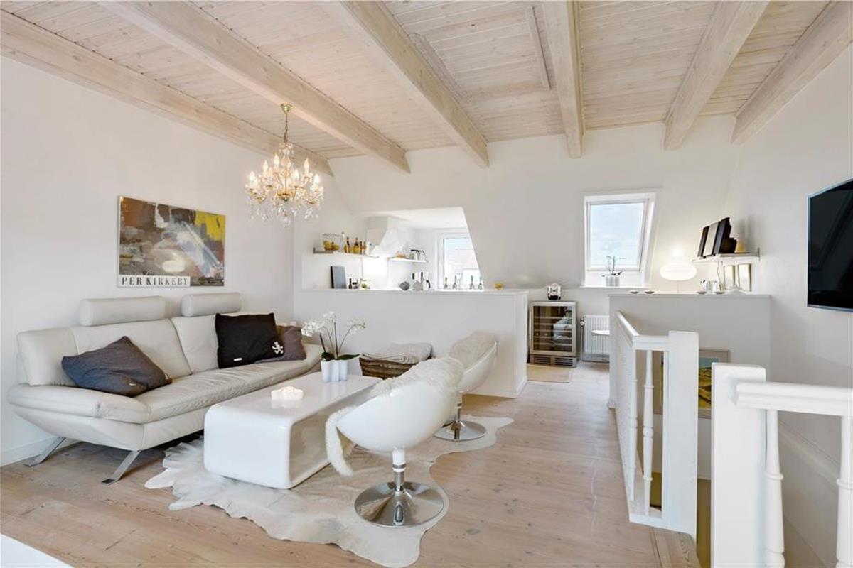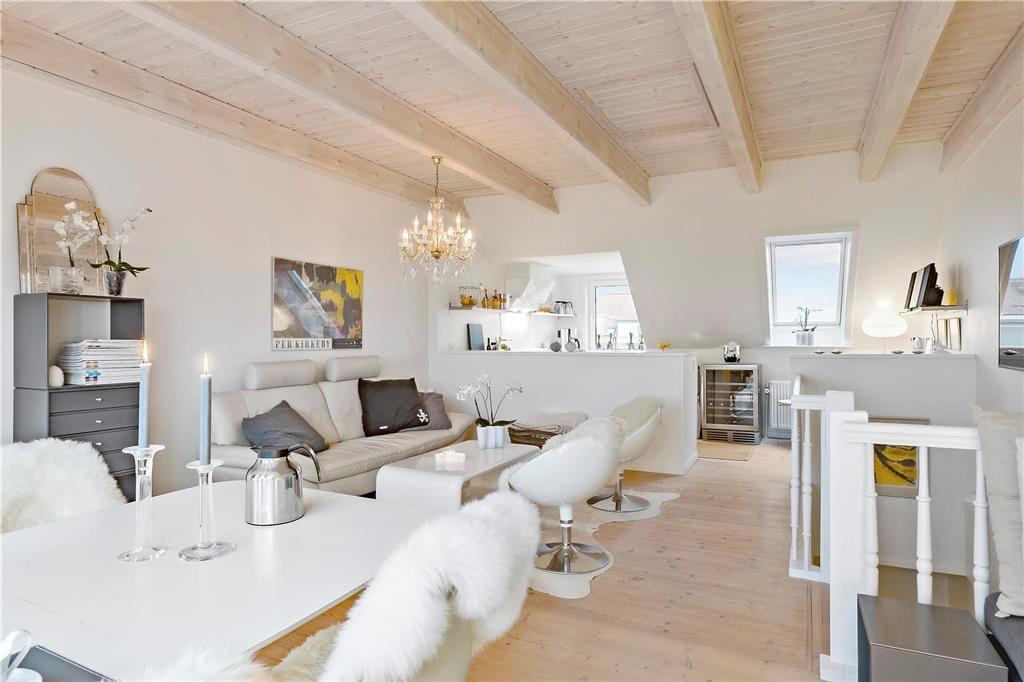 Der Meerblick kann auch drinnen genossen werden – zum Beispiel, wenn Sie am Esstisch im Wohnzimmer mit Ihrem Morgenkaffee, der Tageszeitung und frischen Brötchen vom lokalen Bäcker sitzen. Das Frühstück sowie alle anderen Mahlzeiten können im gut ausgestatteten Küchenbereich zubereitet werden, der offen mit dem elegant eingerichteten Wohnzimmer verbunden ist. Der offene Wohnbereich bildet das gesamte obere Stockwerk der Wohnung, während der Eingang, das Badezimmer und ein großes Schlafzimmer mit Doppelbett im unteren Bereich liegen. Überall ist der Stil hell und einladend, sodass man sich sofort wohl fühlt.