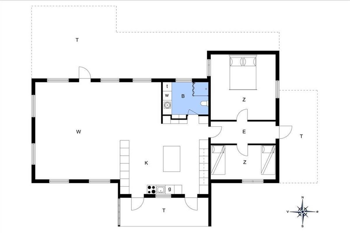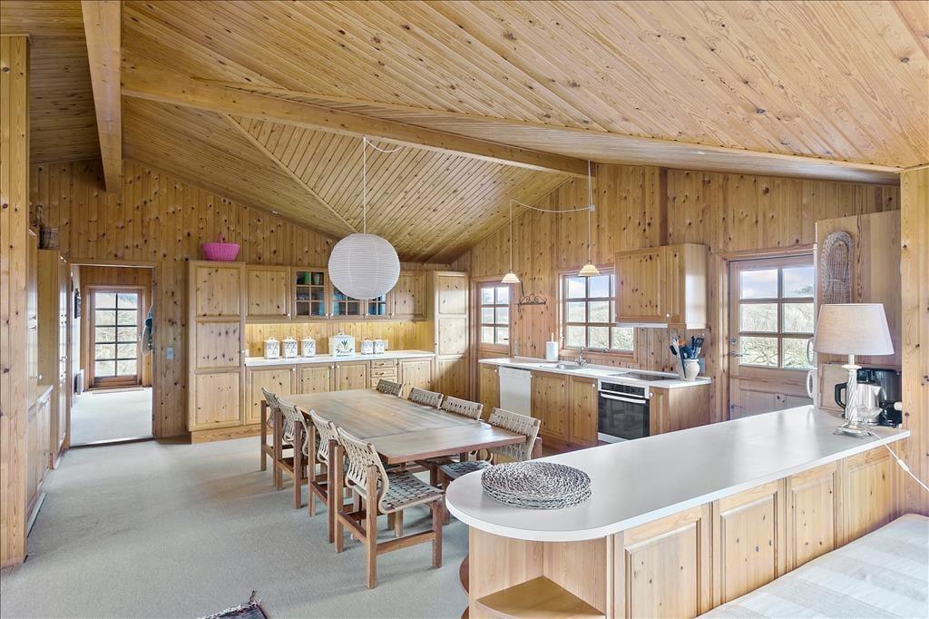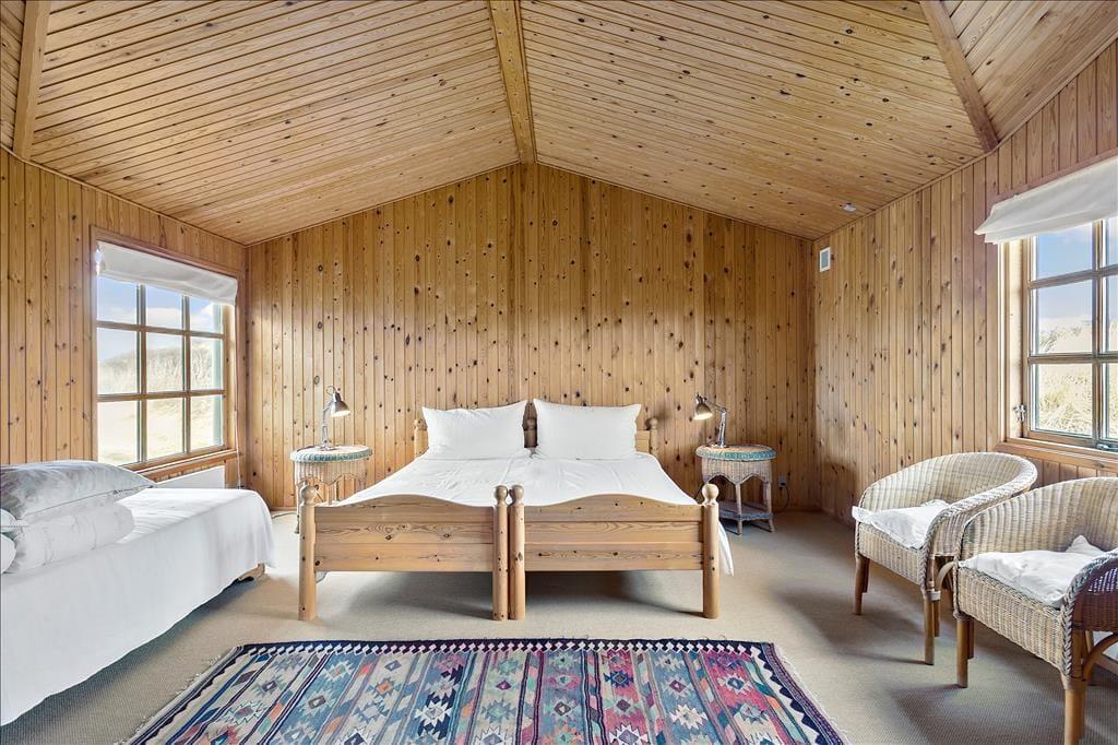 Wenn ihr das 146 m² große Ferienhaus betretet, spürt ihr sofort die gemütliche Atmosphäre. Die Holzleisten an den Wänden sind unbehandelt, die Decke ist klassisch bis zum First geführt, und aus allen Fenstern könnt ihr die schöne Aussicht genießen, die euch daran erinnert, dass ihr weit entfernt von den Alltagsroutinen seid. Am einen Ende des Hauses befindet sich ein großes und geräumiges Wohnzimmer, in dem ihr euch in den weichen Sitzmöbeln entspannen und beim Kochen und den Mahlzeiten im offenen Küchenbereich wohlfühlen könnt. Auch die beiden Schlafzimmer sind großzügig, ebenso das Badezimmer, das mit einer Dusche, Waschmaschine und Trockner ausgestattet ist.