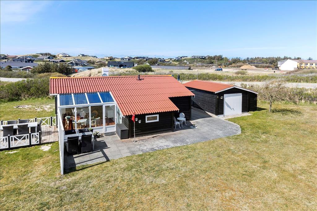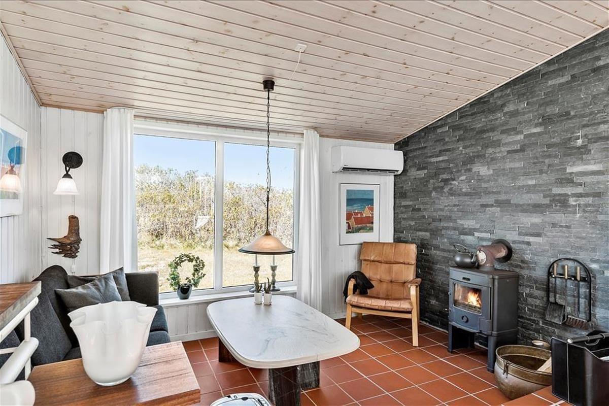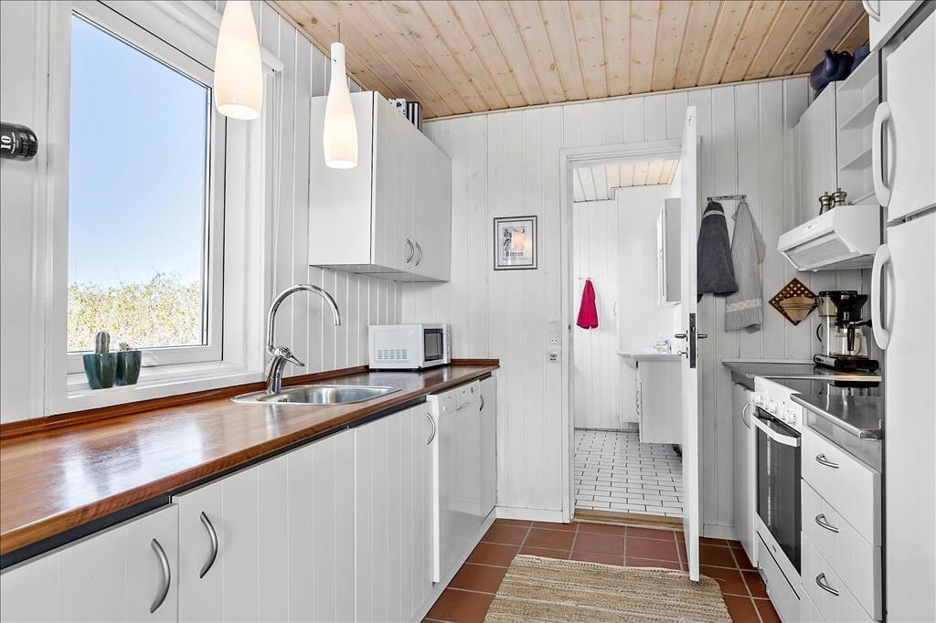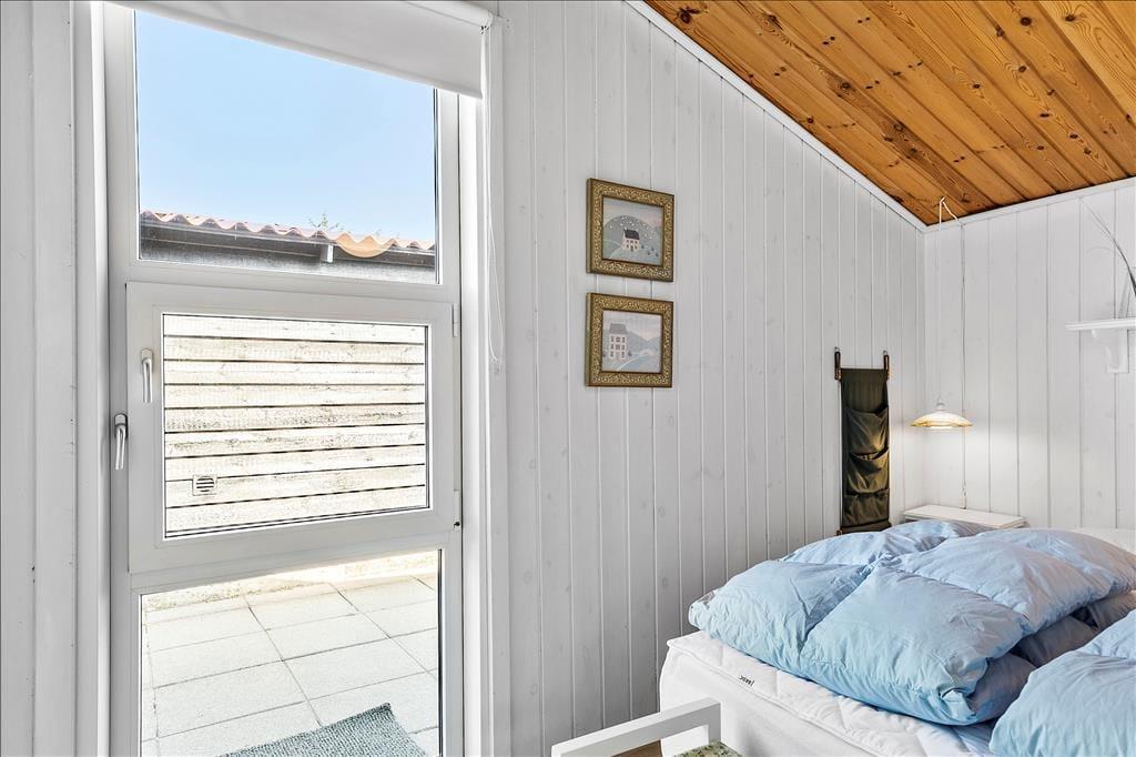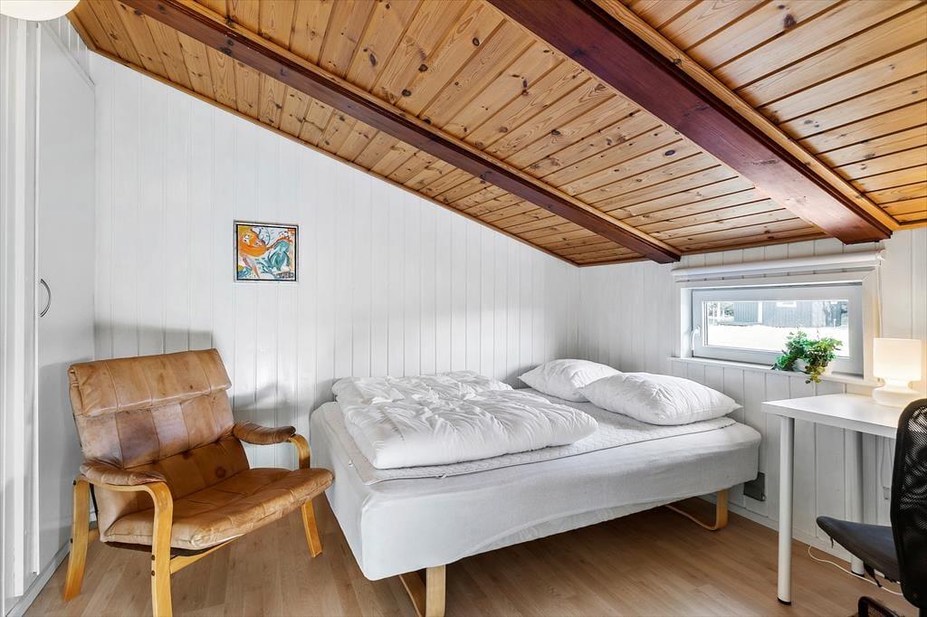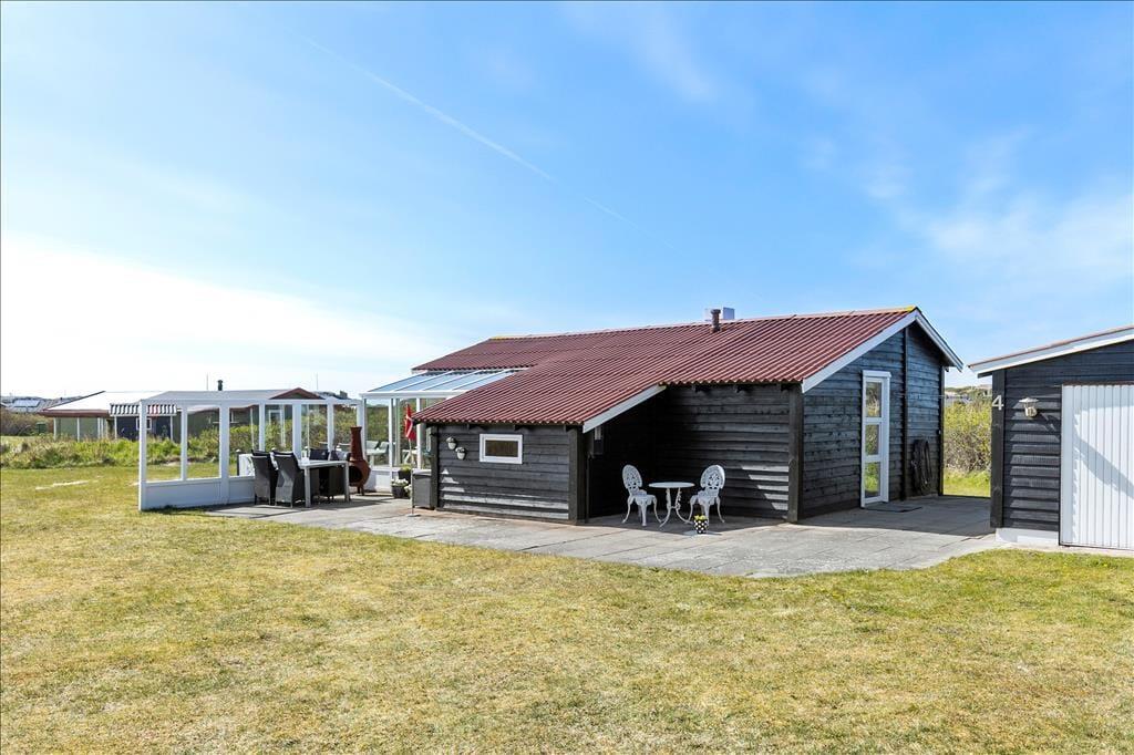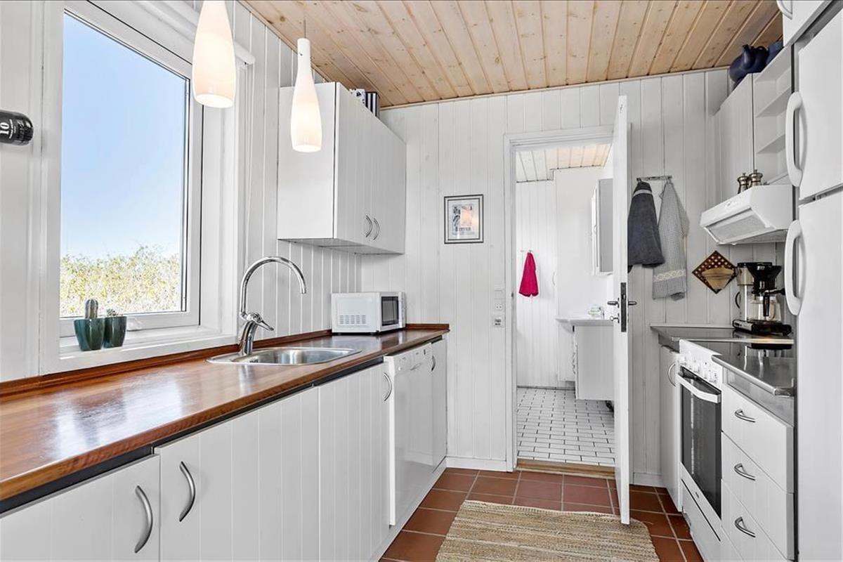 Mit dem Baujahr 1956 kann man es sicher als ein älteres Ferienhaus bezeichnen, aber im Laufe der Jahre wurde es gut gepflegt, sodass es gut erhalten und einladend wirkt. Drinnen können sechs Feriengäste es sich gemütlich machen – unter anderem im Wohnbereich, der aus einem niveaugetrennten Wohnzimmer und einer gut funktionierenden Küche besteht. Im Wohnzimmer steht ein Kaminofen, und nach Süden sorgt ein großes Fenster für zusätzliches Sonnenlicht während des Tages. Das Badezimmer des Ferienhauses ist hell, schlicht und funktional, und schließlich bietet das Haus drei Schlafzimmer, die jeweils mit Doppelbetten und einem Etagenbett ausgestattet sind.