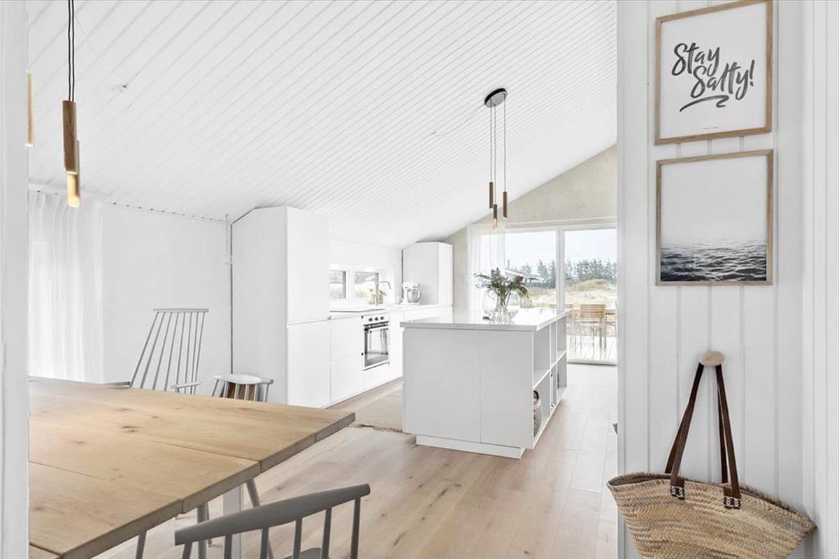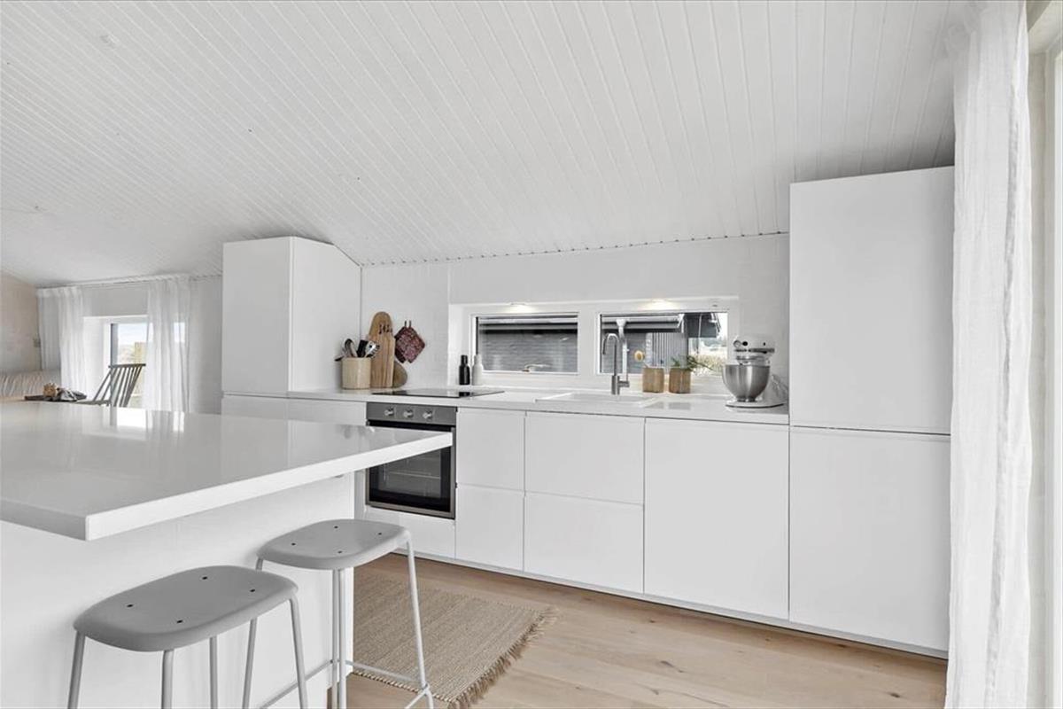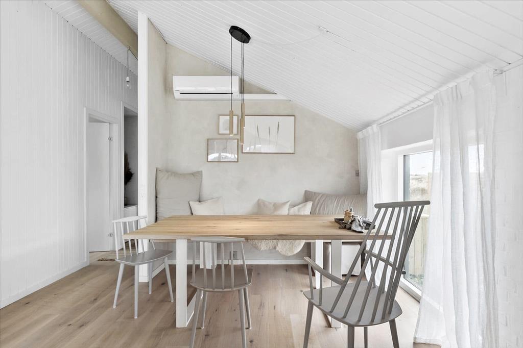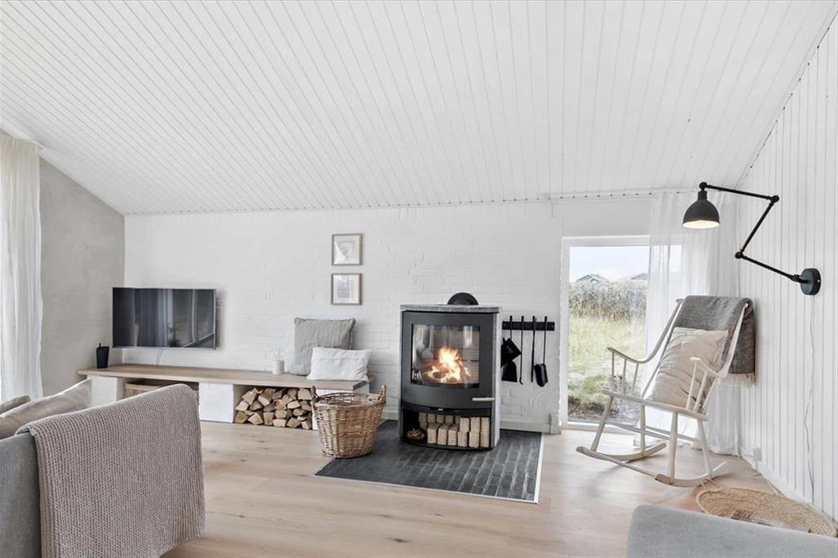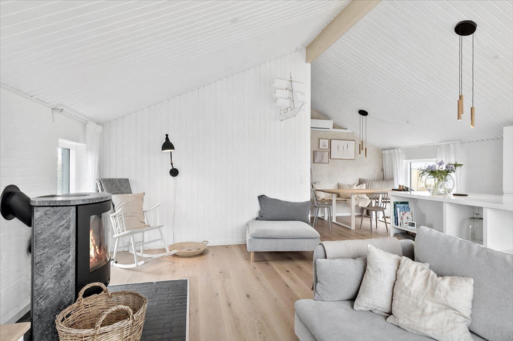 Das Ferienhaus verfügt über eine helle, skandinavische Einrichtung, die perfekt zur Küstenlandschaft und den weiten, offenen Flächen passt. Und aufgrund der angenehmen Atmosphäre und der gemütlichen Details fühlt man sich drinnen sofort zu Hause. Zum Beispiel ist es herrlich, sich rund um den Esstisch im Wohnzimmer zu versammeln oder sich in der Sofa-Lounge zu entspannen, wo ein Flachbildfernseher mit Chromecast bereitsteht, um Unterhaltung zu bieten. Wenn es draußen kühl ist, können Sie den Kamin anzünden, und wenn der Hunger kommt, können Sie im schönen offenen Küchenbereich anfangen zu kochen. Der Rest des Ferienhauses präsentiert sich ebenfalls einladend, sowohl das Badezimmer als auch die drei Schlafzimmer, die insgesamt Schlafplätze für fünf Personen bieten.