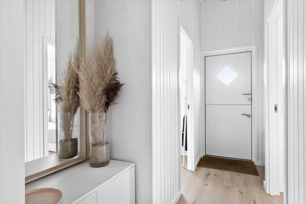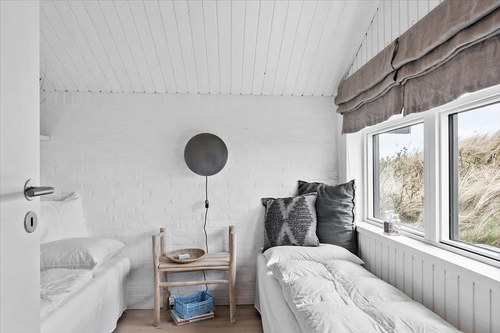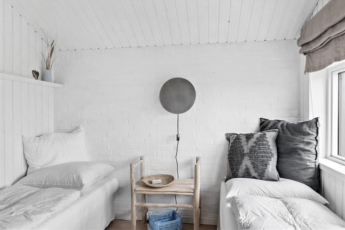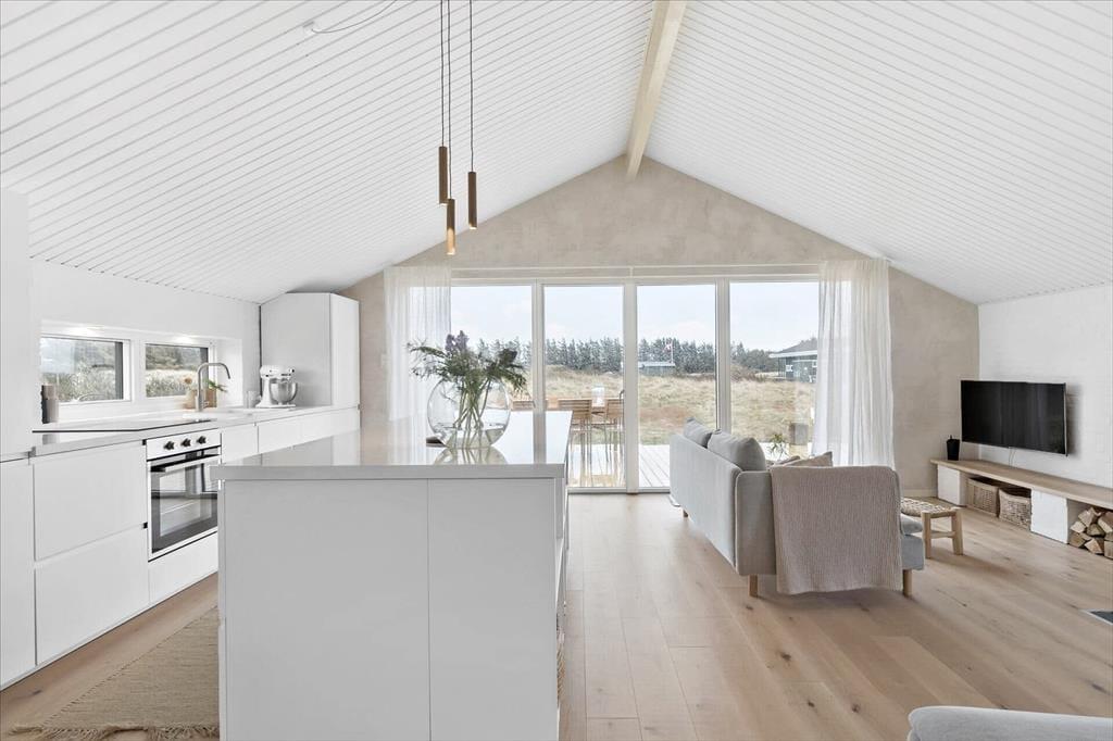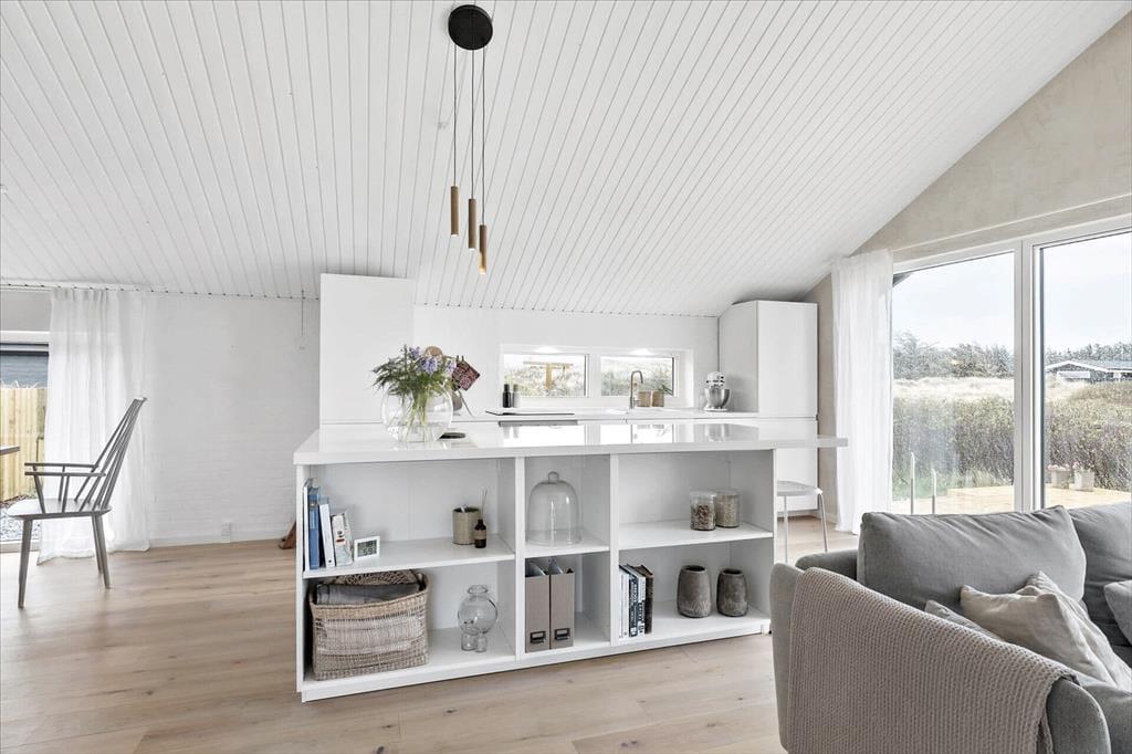 Das Ferienhaus verfügt über eine helle, skandinavische Einrichtung, die perfekt zur Küstenlandschaft und den weiten, offenen Flächen passt. Und aufgrund der angenehmen Atmosphäre und der gemütlichen Details fühlt man sich drinnen sofort zu Hause. Zum Beispiel ist es herrlich, sich rund um den Esstisch im Wohnzimmer zu versammeln oder sich in der Sofa-Lounge zu entspannen, wo ein Flachbildfernseher mit Chromecast bereitsteht, um Unterhaltung zu bieten. Wenn es draußen kühl ist, können Sie den Kamin anzünden, und wenn der Hunger kommt, können Sie im schönen offenen Küchenbereich anfangen zu kochen. Der Rest des Ferienhauses präsentiert sich ebenfalls einladend, sowohl das Badezimmer als auch die drei Schlafzimmer, die insgesamt Schlafplätze für fünf Personen bieten.