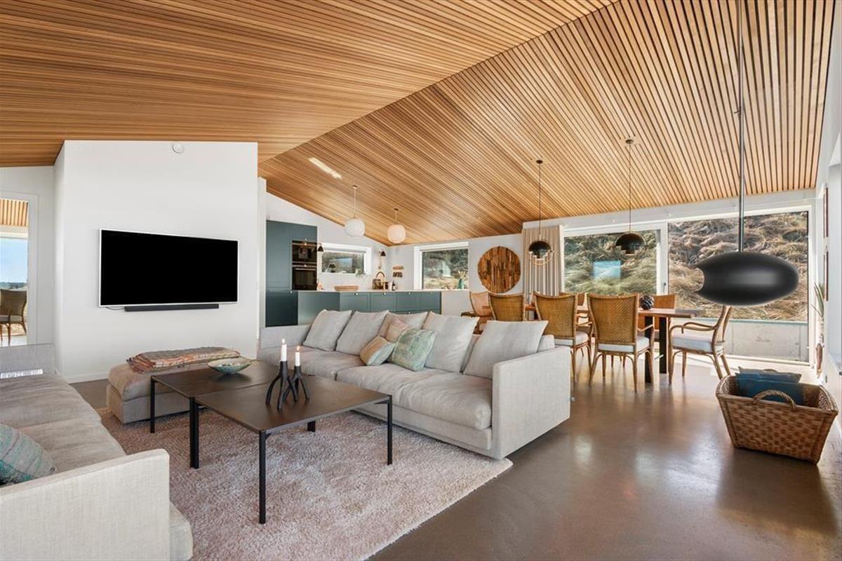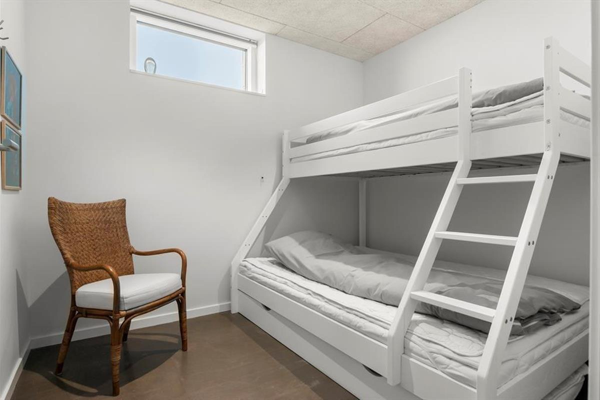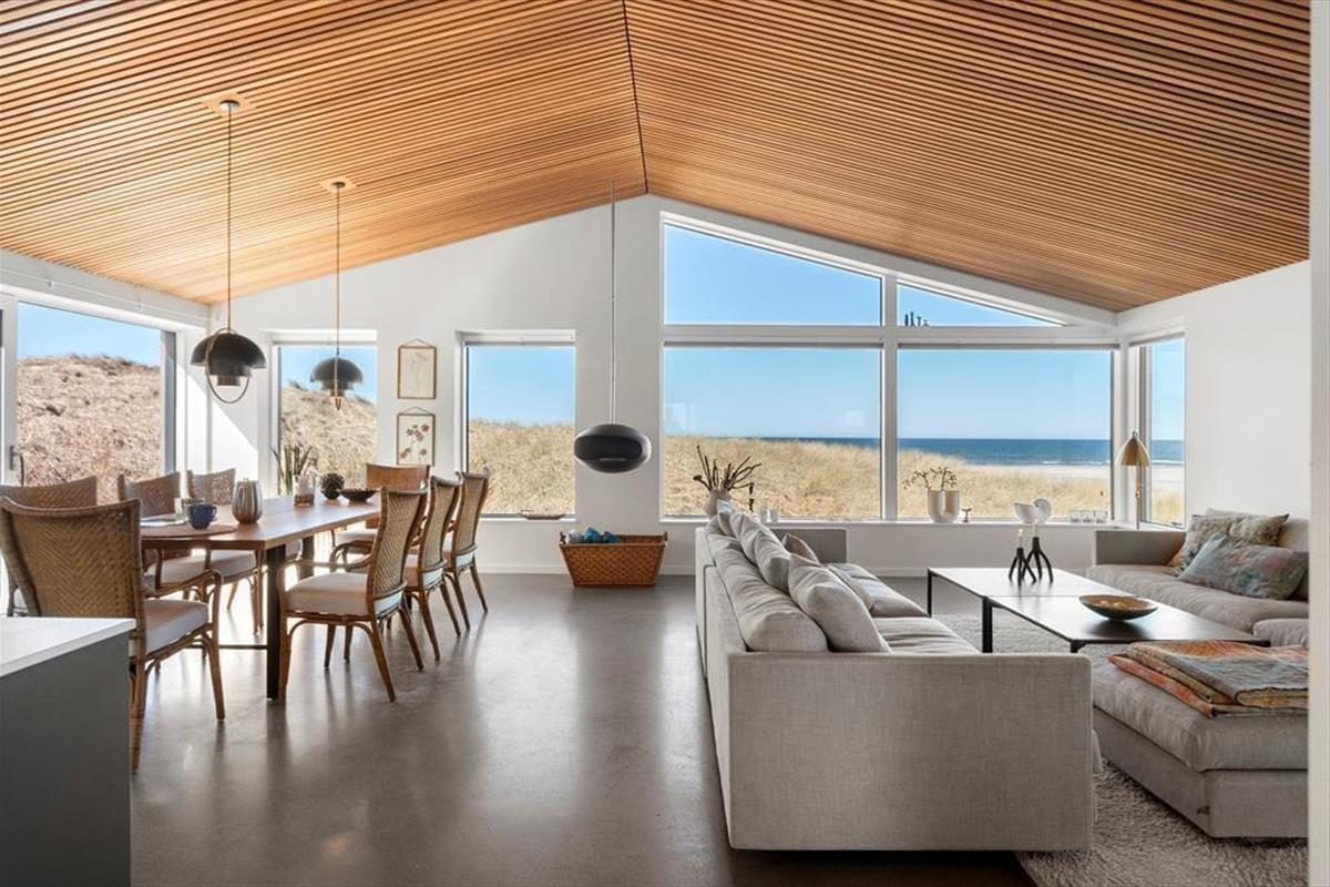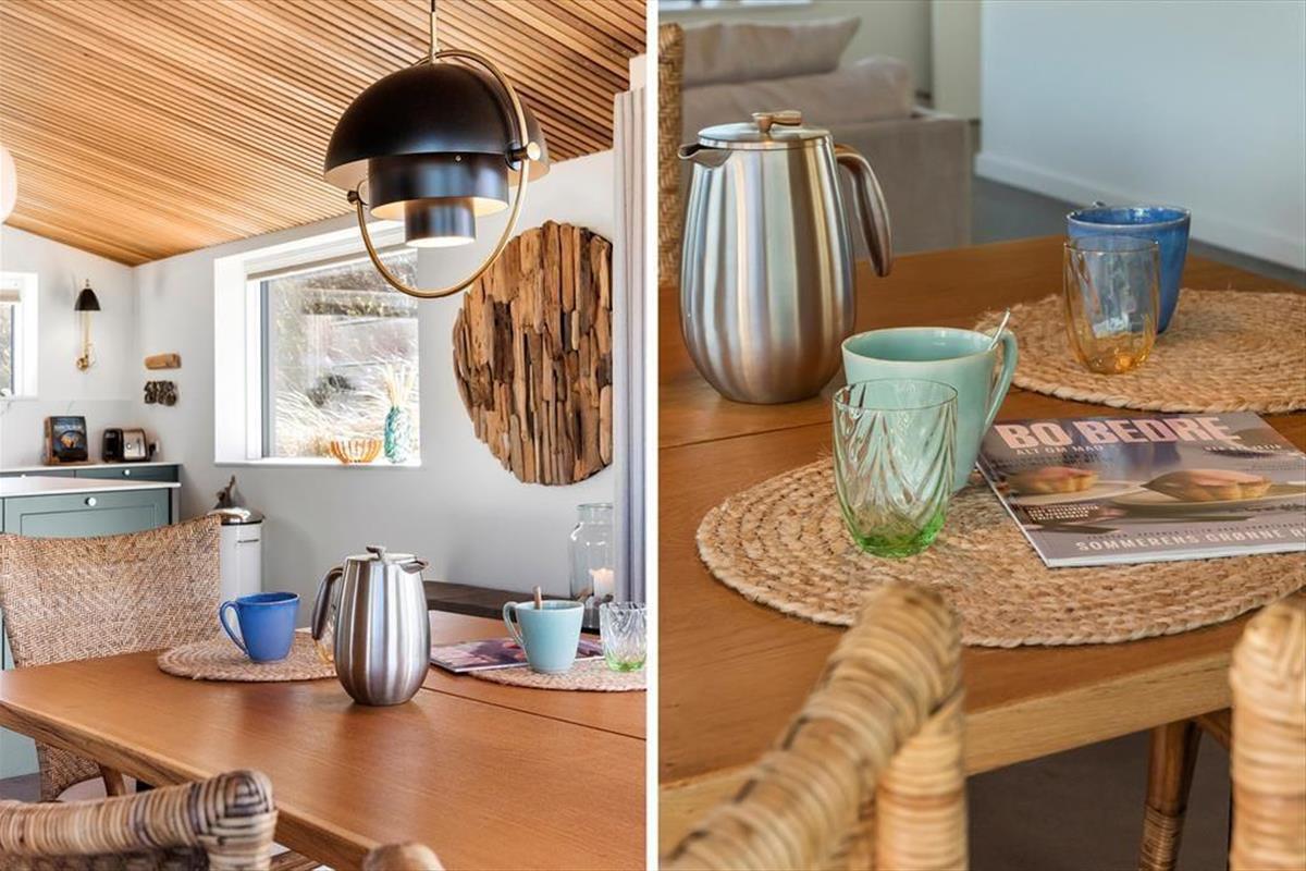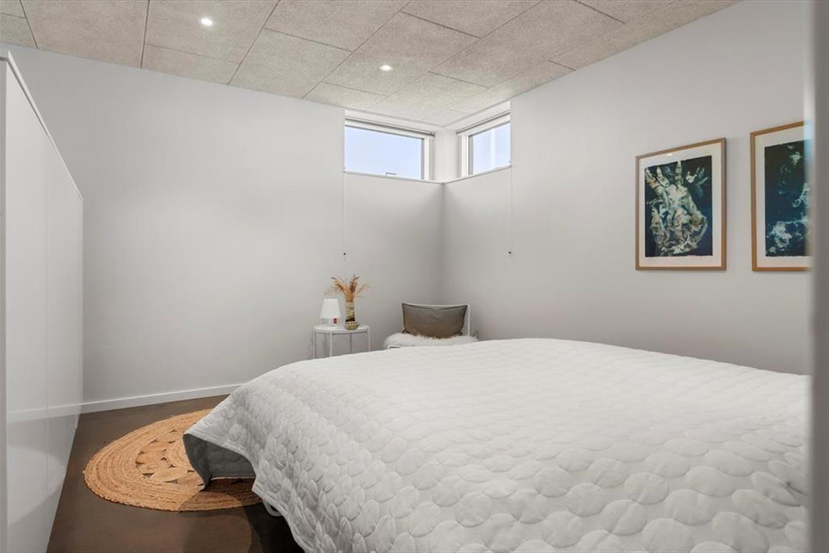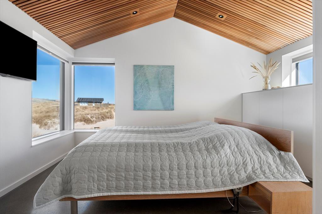 Wie die Bilder zeigen, ist das Ferienhaus eine Klasse für sich: Der Wohnbereich ist elegant mit einem offenen Wohnzimmer und einer Küche eingerichtet, und alles – von den Küchenelementen und dem freistehenden Bio-Kamin bis hin zu den schönen Holzbalkendecken – strahlt Großzügigkeit und Qualität aus. Der Lichteinfall ist hervorragend, und nach Westen hin sorgen die großen Fenster dafür, dass Sie einen freien Blick auf die Nordsee haben – und auf die weißen Badehäuser am Strand, die so typisch für Løkken sind. Der Meerblick kann auch vom Doppelbett im Master-Schlafzimmer des Ferienhauses bewundert werden, das ein großes und schönes Zimmer mit eigenem Badezimmer ist. Wenn Sie die Treppe ins untere Stockwerk nehmen, finden Sie drei weitere Schlafzimmer, zwei Badezimmer und einen Nutzraum mit Waschmöglichkeiten.