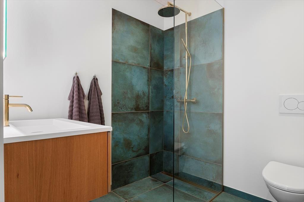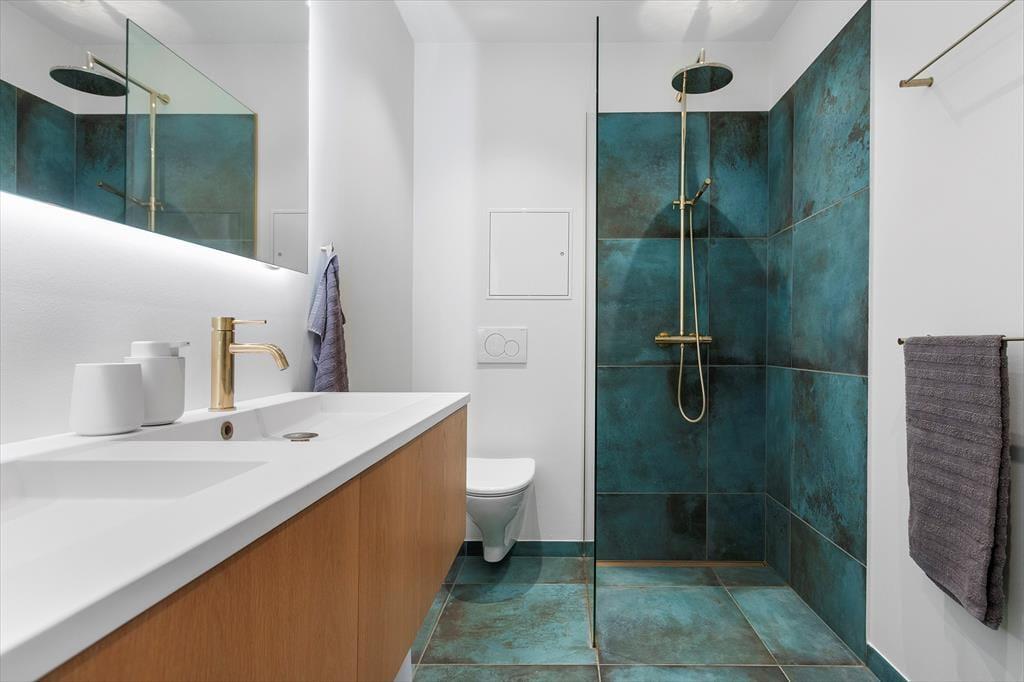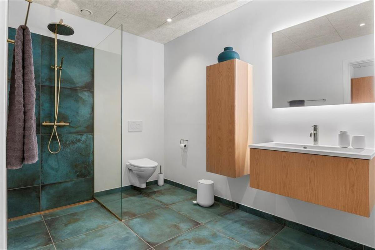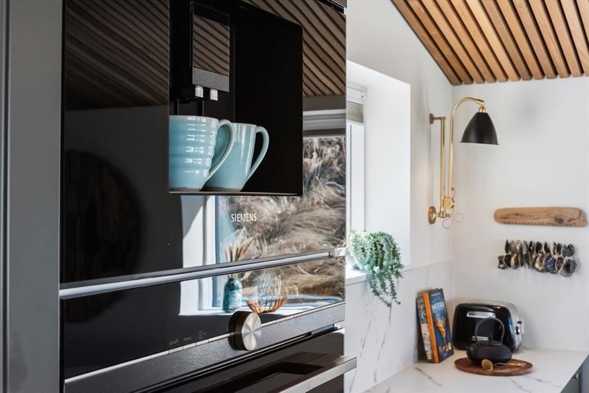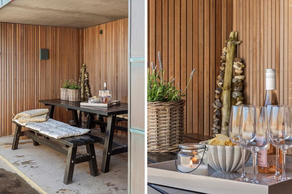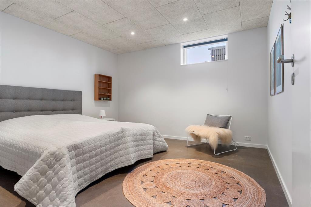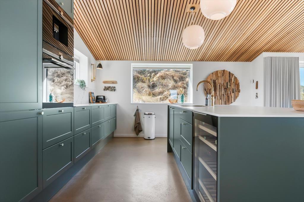 Wie die Bilder zeigen, ist das Ferienhaus eine Klasse für sich: Der Wohnbereich ist elegant mit einem offenen Wohnzimmer und einer Küche eingerichtet, und alles – von den Küchenelementen und dem freistehenden Bio-Kamin bis hin zu den schönen Holzbalkendecken – strahlt Großzügigkeit und Qualität aus. Der Lichteinfall ist hervorragend, und nach Westen hin sorgen die großen Fenster dafür, dass Sie einen freien Blick auf die Nordsee haben – und auf die weißen Badehäuser am Strand, die so typisch für Løkken sind. Der Meerblick kann auch vom Doppelbett im Master-Schlafzimmer des Ferienhauses bewundert werden, das ein großes und schönes Zimmer mit eigenem Badezimmer ist. Wenn Sie die Treppe ins untere Stockwerk nehmen, finden Sie drei weitere Schlafzimmer, zwei Badezimmer und einen Nutzraum mit Waschmöglichkeiten.