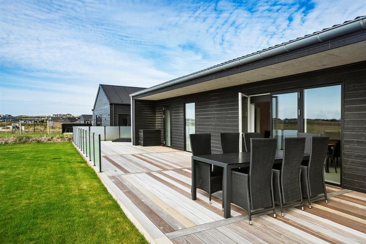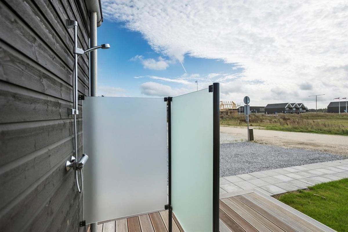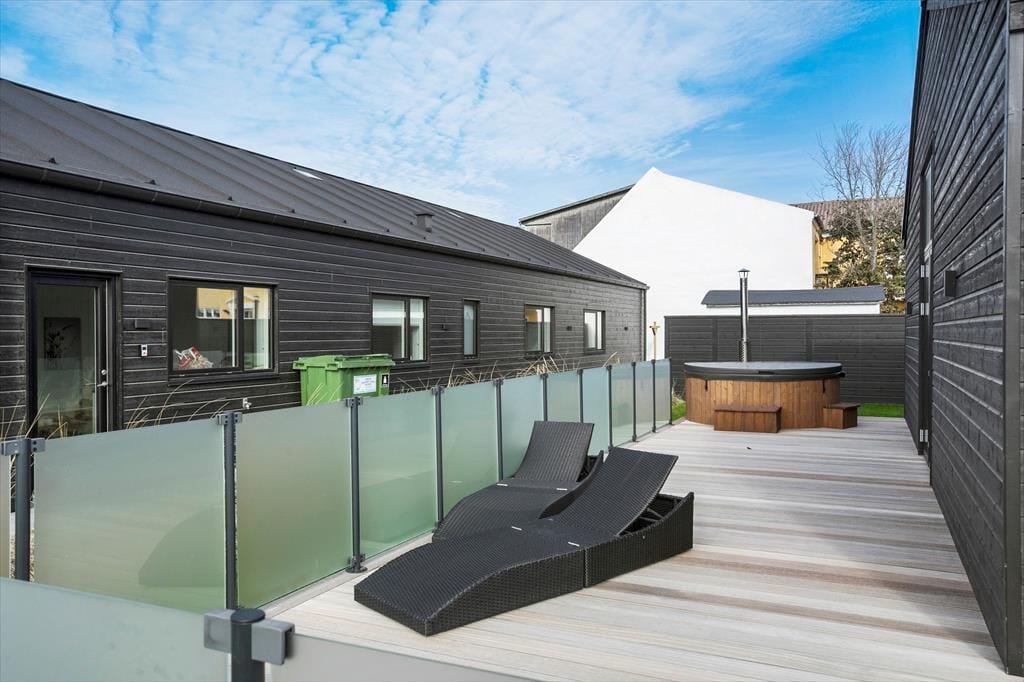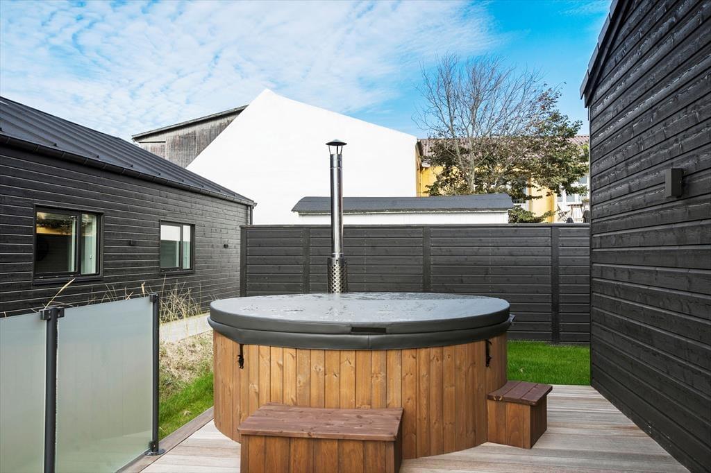 Die Entspannungsmomente können auch gut draußen genossen werden – beispielsweise im herrlichen Hot Tub, wo Sie mit Blick auf den Sternenhimmel im warmen Wasser sitzen können. Wenn das Wetter eher dazu einlädt, in einem Liegestuhl zu entspannen, bietet die große, teilweise überdachte und abgeschirmte Terrasse ebenfalls beste Voraussetzungen. Am Haus gibt es außerdem eine Außendusche und eine Rasenfläche, auf der Sie Ball spielen oder mit Ihrem Hund spielen können, falls Sie einen mitgebracht haben.