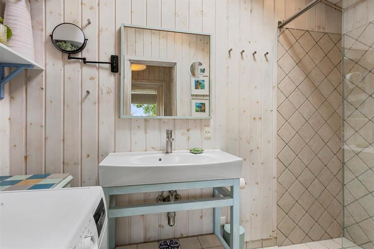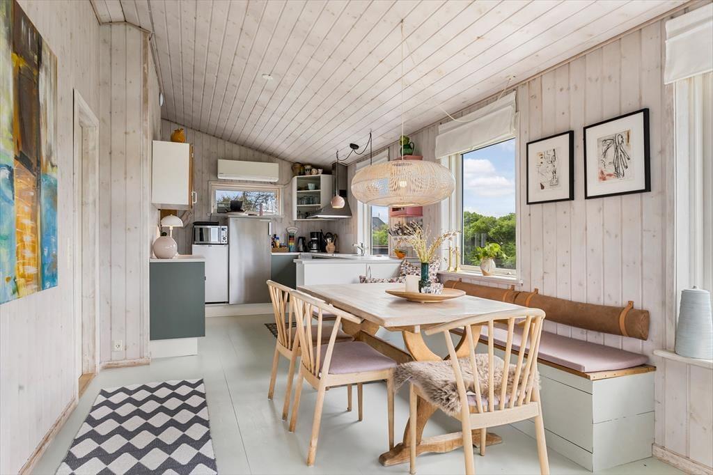 Die hellen Holzwände, die geschmackvolle Einrichtung und der gemütliche Kaminofen schaffen eine angenehme Atmosphäre, sodass ihr euch schnell wie zu Hause fühlt und die Urlaubsruhe genießen könnt. Die Sommerhausromantik wird durch den Blick auf die Hagebuttensträucher im Garten, die ihr durch die großen Wohnzimmerfenster sehen könnt, noch verstärkt – und diese sorgen zudem für ein gutes Tageslicht. Ein Flachbildfernseher direkt neben dem Sofa lädt zu entspannten Filmabenden ein, und am Esstisch könnt ihr euch stundenlang unterhalten oder Karten spielen. In der offenen Küche gibt es eine Spülmaschine, eine Mikrowelle und weitere nützliche Geräte, die es euch erleichtern, kleine und große Mahlzeiten zuzubereiten. Ein Badezimmer mit Dusche und Waschsäule befindet sich direkt neben dem Eingangsbereich, und wenn es Zeit fürs Bett ist, stehen euch drei gemütliche Schlafzimmer zur Verfügung.