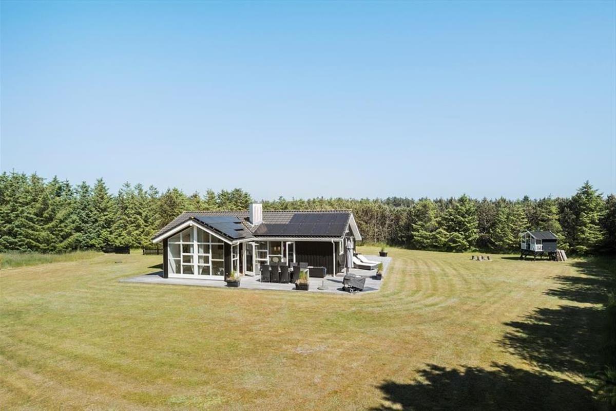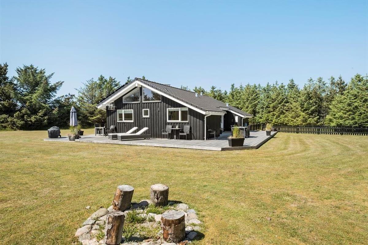 Rund um das Ferienhaus erstreckt sich eine große Holzterrasse, ausgestattet mit Liegestühlen und hochwertigem Gartenmobiliar. Ein Grill steht ebenfalls zur Verfügung, und an sonnigen Sommertagen haben Sie vielleicht Lust, im Schatten unter dem Sonnenschirm zu entspannen, während die langen Abende am Lagerfeuer oder bei einem Ballspiel auf dem Rasen verbracht werden können.