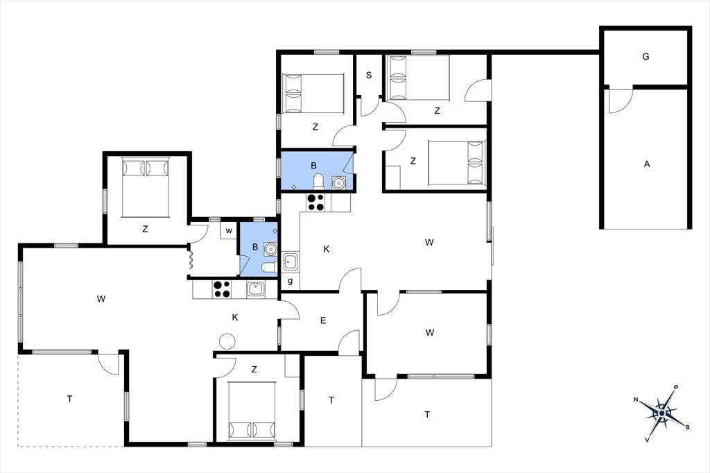 Das 120 m2 große Ferienhaus ist in zwei voll ausgestattete Wohneinheiten unterteilt, die jeweils über eine Küche, ein Wohnzimmer, ein Badezimmer und Schlafzimmer verfügen – eine Einheit hat zwei Schlafzimmer und die andere drei. Darüber hinaus haben Sie Zugang zu einem 15 m2 großen Anbau, der neben zusätzlichen Schlafplätzen auch eine kleine Kochnische und ein eigenes WC bietet. Kurz gesagt, es ist die perfekte Basis, wenn Sie in großer Runde zusammen sein möchten, aber zwischendurch auch etwas Privatsphäre benötigen. Die Räume sind hell und freundlich eingerichtet, und es ist einfach, eine gemütliche Ecke zu finden, sei es für ein Brettspiel am Kamin, um einen Film zu schauen oder in der Veranda zu entspannen.