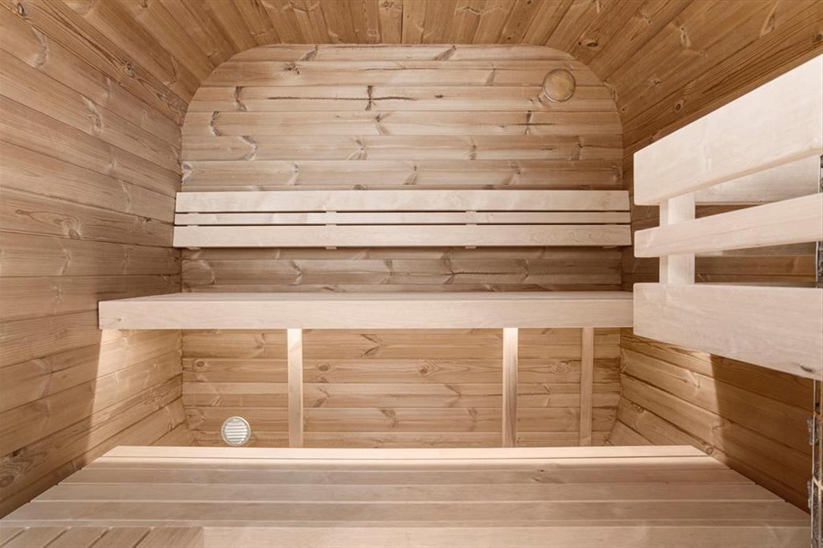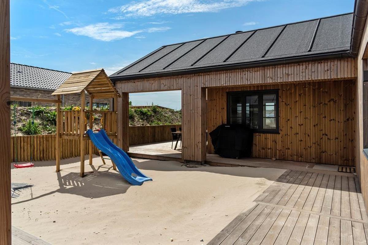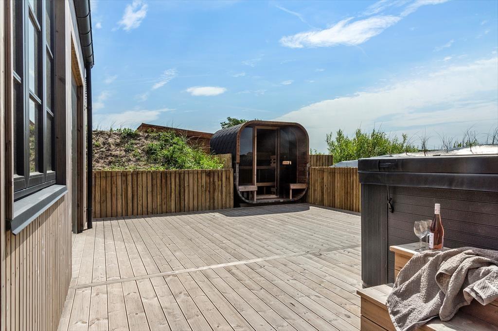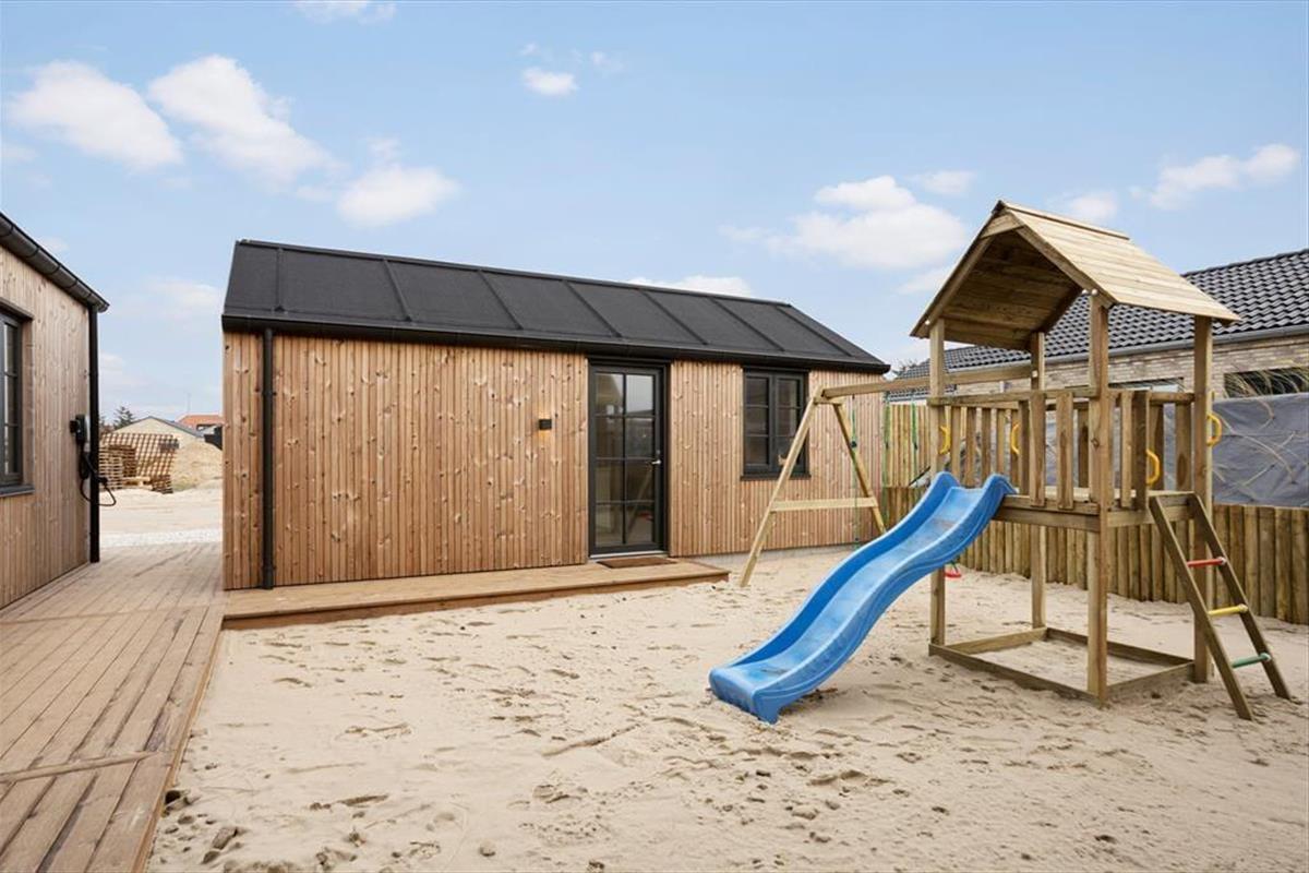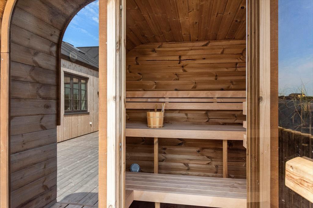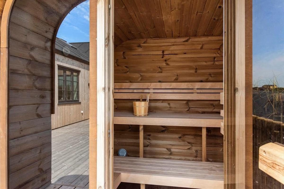 Auch im Freien bekommst du hervorragende Bedingungen, denn das schöne Terrassenumfeld bietet mehrere gemütliche Sitzplätze – darunter einen großen überdachten Bereich, der gegen den Westwind mit Glaswänden geschützt ist. Der Garten ist mit Sand bedeckt, sodass die Kinder im großen Sandkasten spielen können, wo nur die Fantasie Grenzen setzt. Es gibt auch einen Spielturm mit Rutsche und Schaukeln. In der Nähe des Poolraums steht eine Sauna und ein Outdoor-Whirlpool, der mit 30 Grad warmem Wasser gefüllt werden kann, sodass er schnell bereit ist. Das Haus wird von Sand und Seegras umgeben, was eine schöne Erinnerung daran ist, wie nah du am Strand bist.