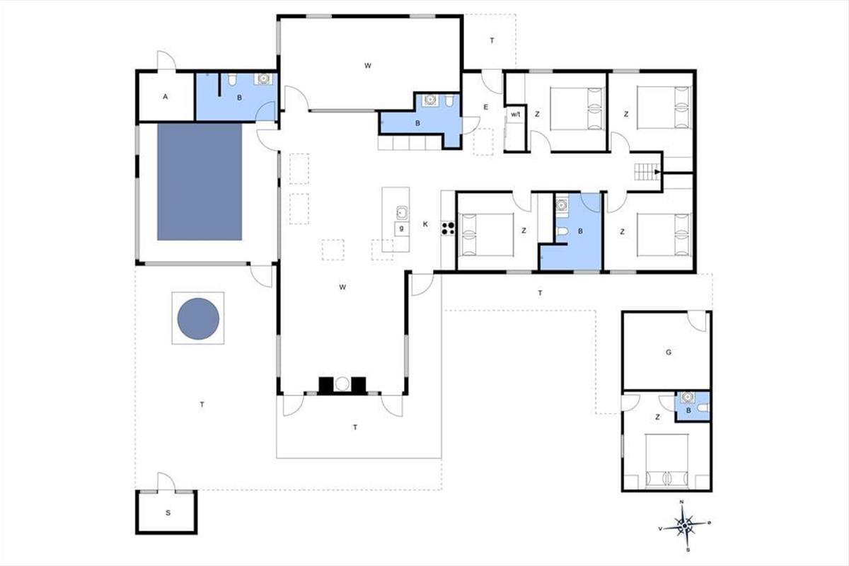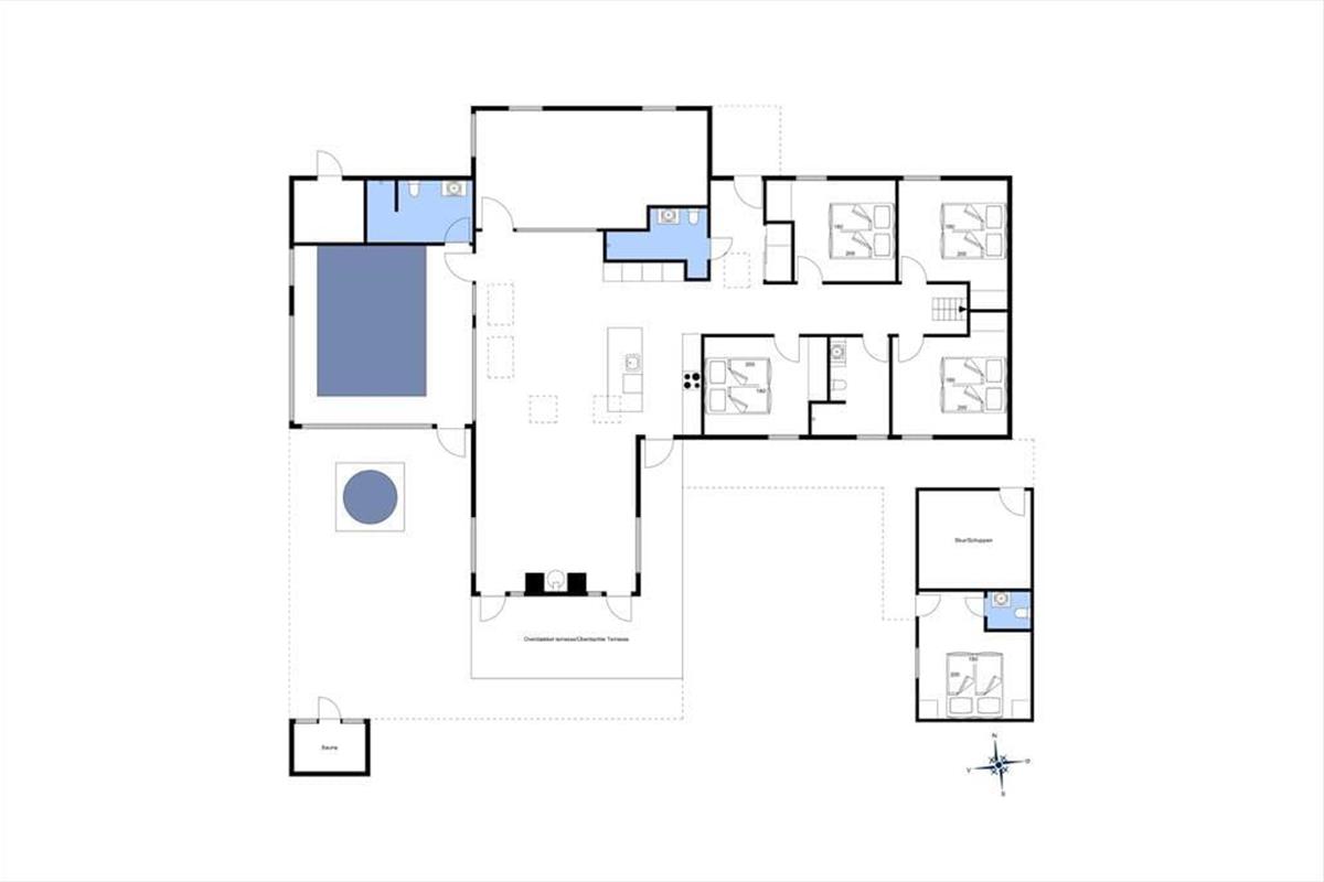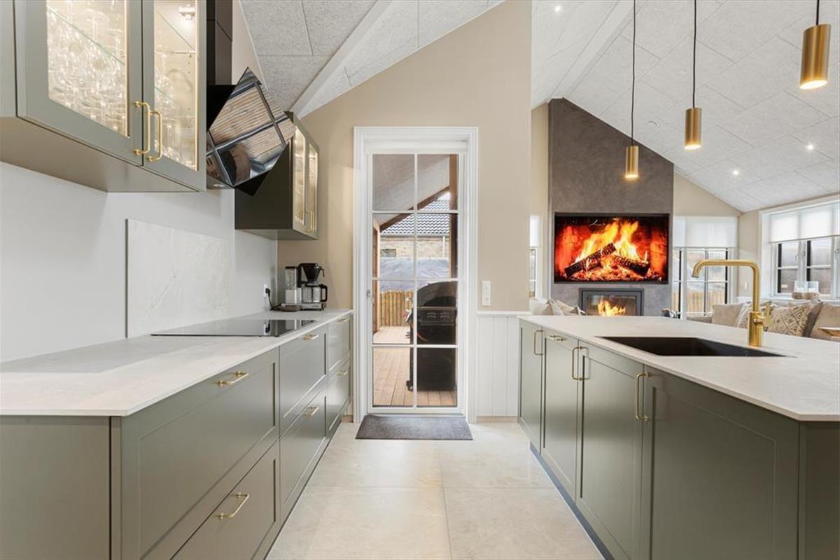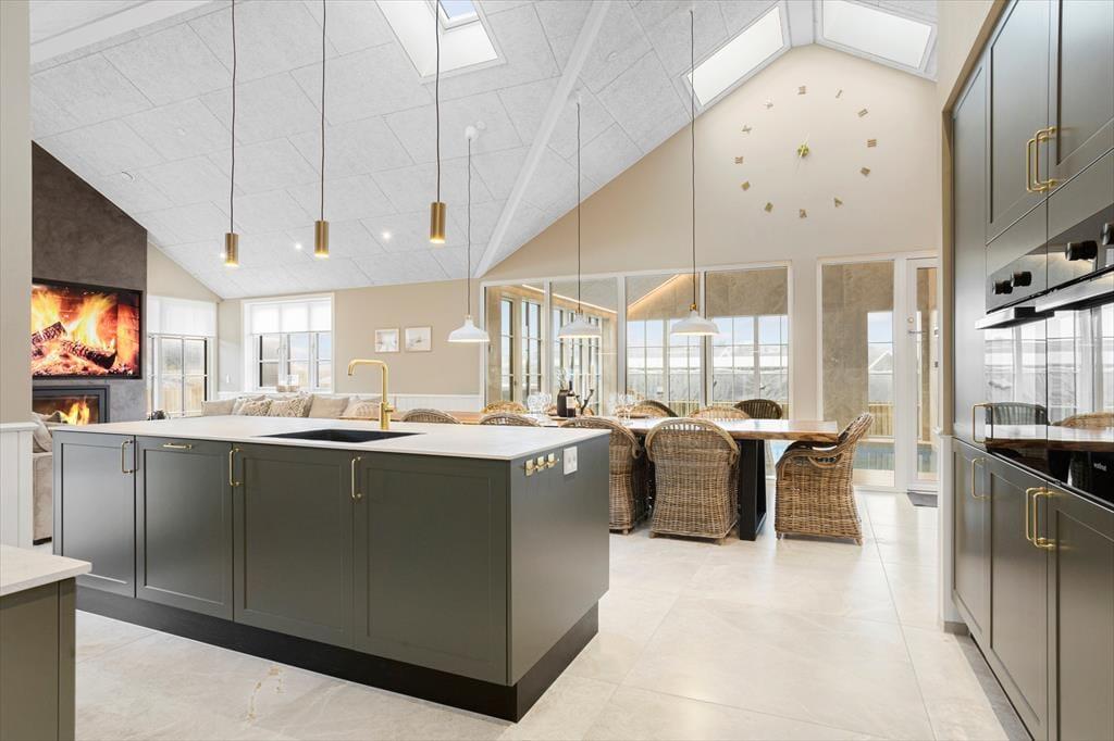 Das Ferienhaus ist brandneu. Wenn du es jetzt buchst, kannst du einer der ersten sein, die in die großen, hellen und stilvoll eingerichteten Räume einziehen, um sich zu entspannen und den Urlaub zu genießen – mit Schwimmen im Salzwasserpool, Spaß im Aktivitätsraum und Entspannung vor dem 85-Zoll-Flachbildschirm im Wohnzimmer. Der Pool hat immer eine angenehme Temperatur von 30 Grad, und das Aktivitätszimmer bietet viele Stunden Unterhaltung. Mit vier Schlafzimmern, zwei Hems und einem Annex mit eigenem WC eignet sich die Raumaufteilung hervorragend für bis zu 14 Personen – und überall kannst du dich auf hochwertige Betten freuen. Es gibt drei Badezimmer und ein WC im Annex, und die offene Küche ist natürlich ebenfalls von höchster Qualität. Mit gleich zwei Öfen und zwei Kühl-Gefrierkombinationen wird es nie ein Problem sein, Vorräte für die große Familie zu lagern. So hast du die besten Voraussetzungen, um zu kochen. Unter den großen Fliesen im Boden gibt es eine Fußbodenheizung, und als unsichtbares, aber tolles Detail gibt es isolierte Innenwände, sodass es zwischen den Zimmern nicht zu laut ist.