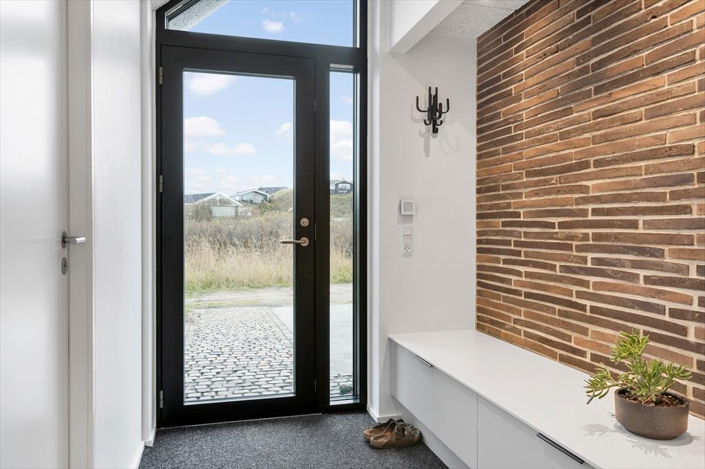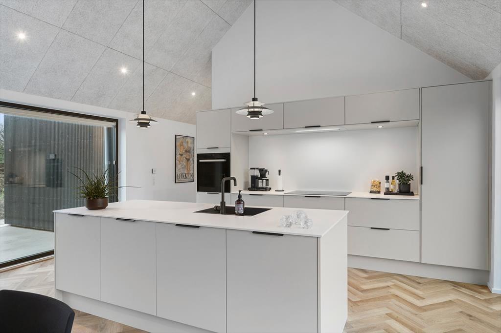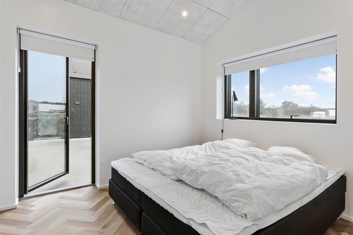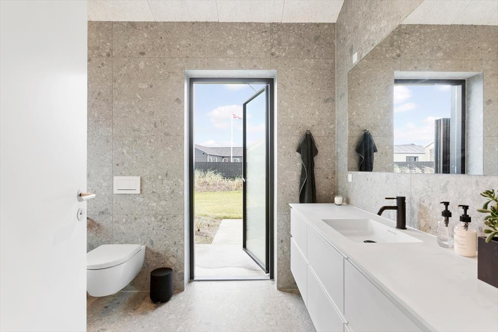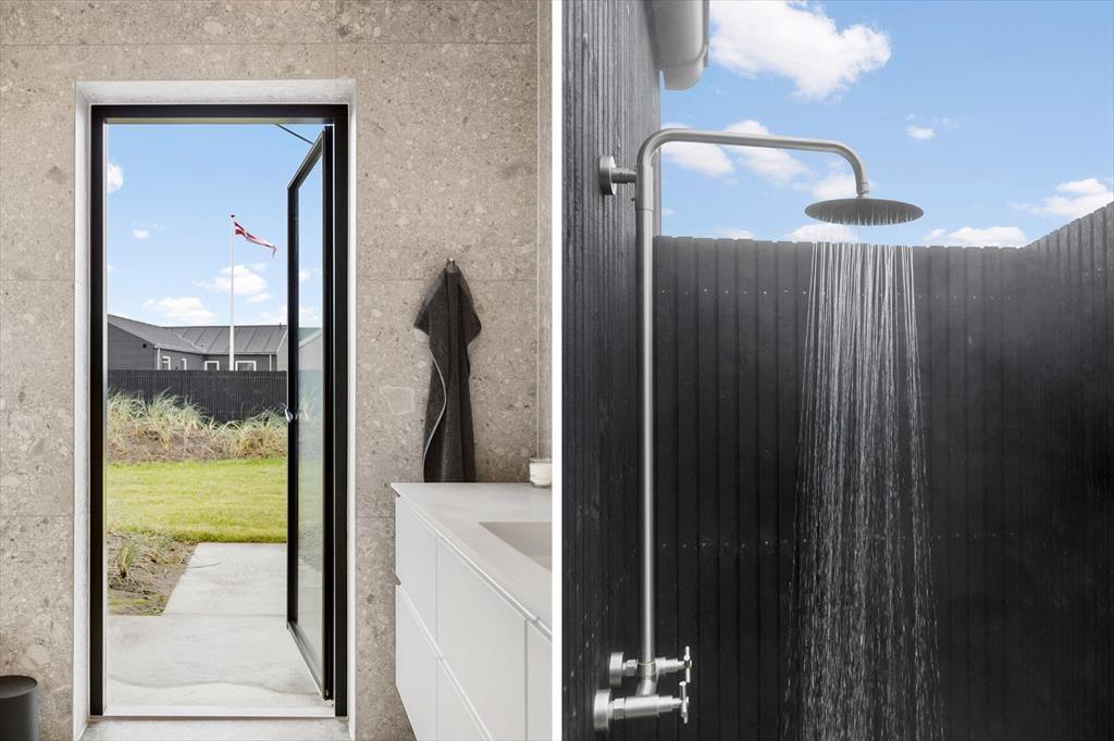 Das Grundstück ist ruhig am Ende des geschlossenen Junivej gelegen. Wenn Sie sich also entspannen und die Sonne genießen möchten, ist dies ein großartiger Ort zum Wohnen. Rund um das Haus gibt es mehrere sonnenverwöhnte Terrassen, und die Glastüren machen es einfach, nach draußen zu gehen. Sogar von einem der Badezimmer aus können Sie eine Tür öffnen und direkt nach draußen treten - und gleich daneben finden Sie eine Außendusche, wenn Sie morgens ein Bad an der frischen Luft nehmen oder sich abspülen möchten, wenn Sie vom Strand zurückkommen. Für Ihr Auto gibt es eine Garage, wenn Sie es nicht nur in der Einfahrt parken möchten.