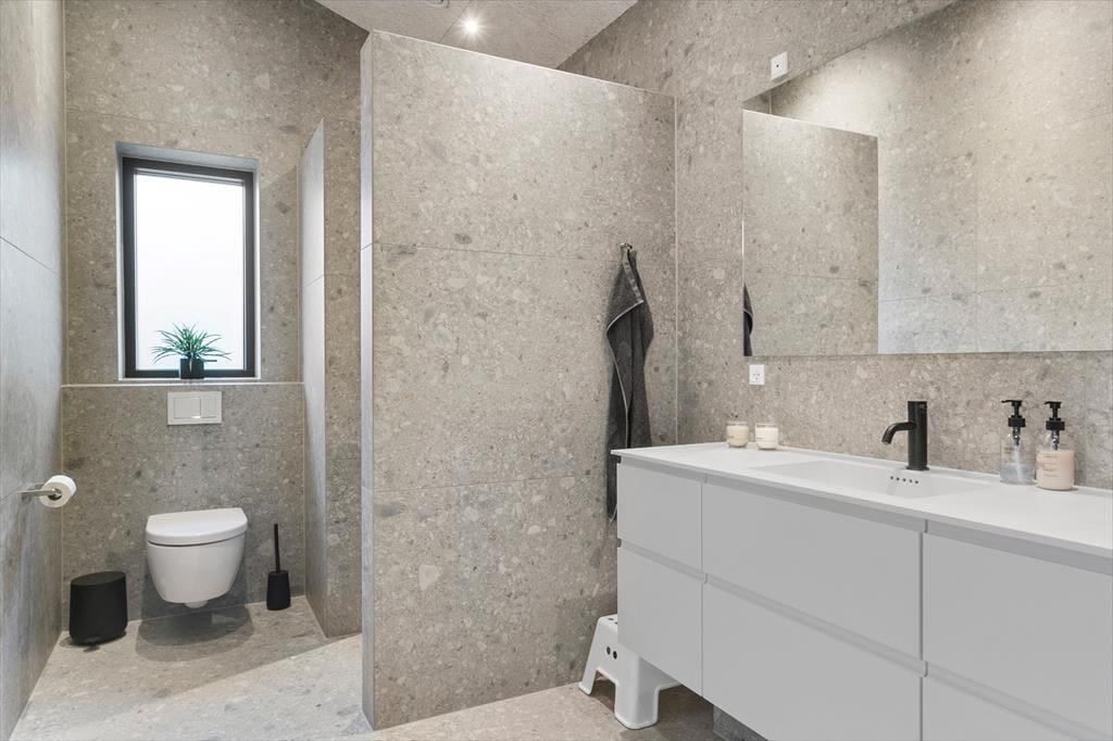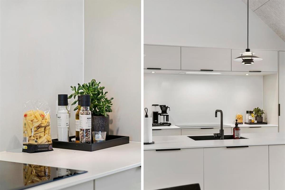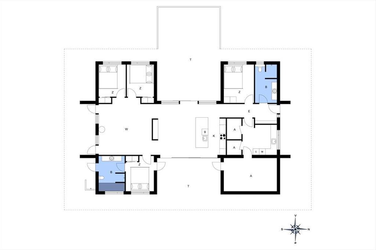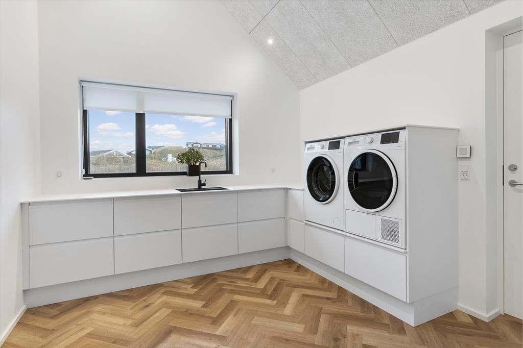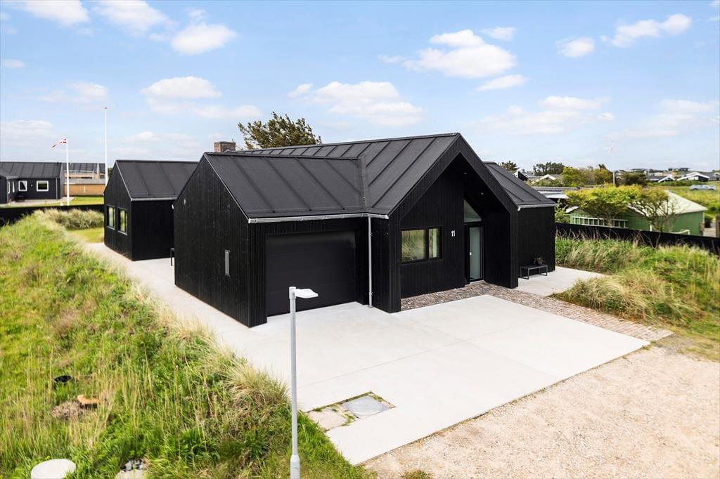Das Grundstück ist ruhig am Ende des geschlossenen Junivej gelegen. Wenn Sie sich also entspannen und die Sonne genießen möchten, ist dies ein großartiger Ort zum Wohnen. Rund um das Haus gibt es mehrere sonnenverwöhnte Terrassen, und die Glastüren machen es einfach, nach draußen zu gehen. Sogar von einem der Badezimmer aus können Sie eine Tür öffnen und direkt nach draußen treten - und gleich daneben finden Sie eine Außendusche, wenn Sie morgens ein Bad an der frischen Luft nehmen oder sich abspülen möchten, wenn Sie vom Strand zurückkommen. Für Ihr Auto gibt es eine Garage, wenn Sie es nicht nur in der Einfahrt parken möchten.