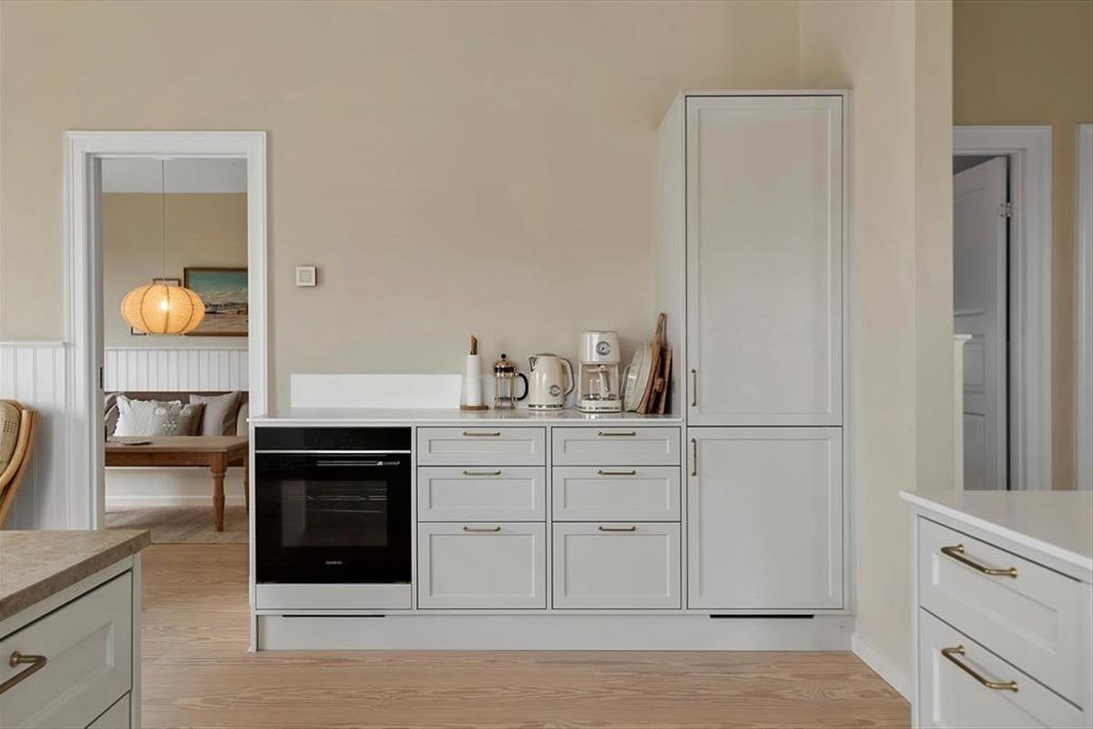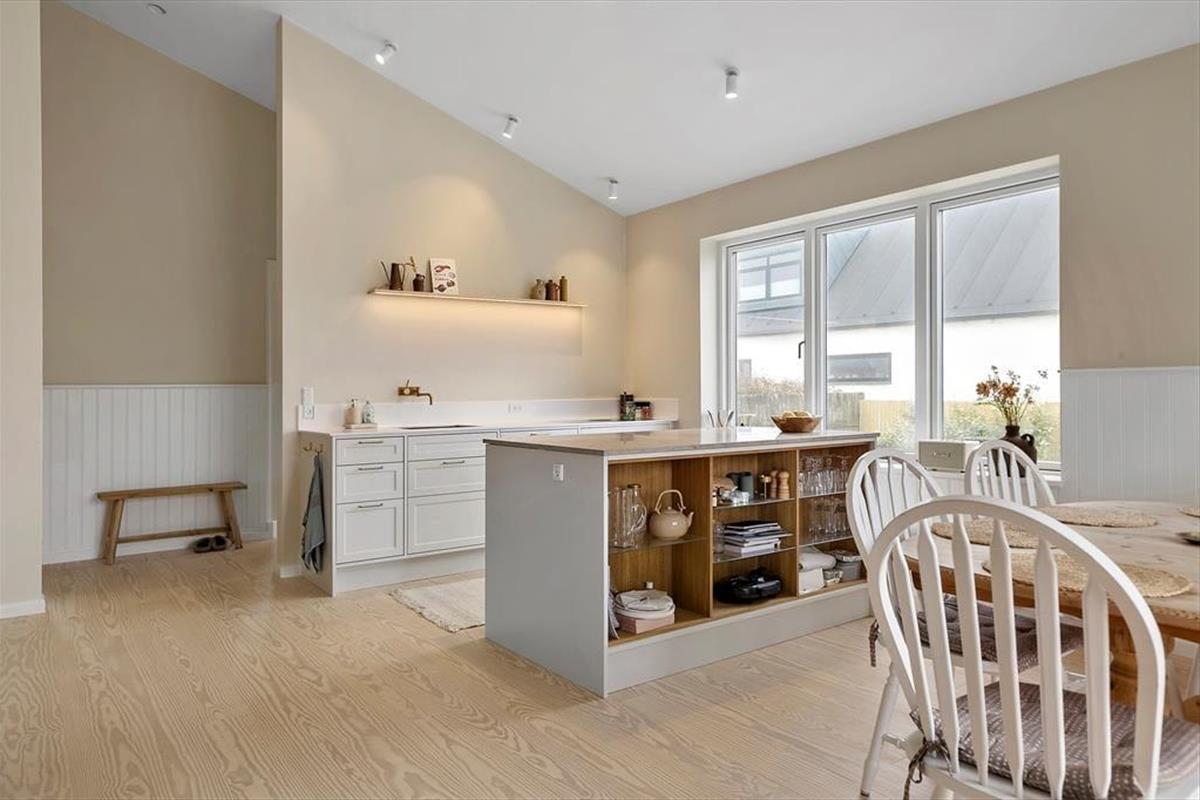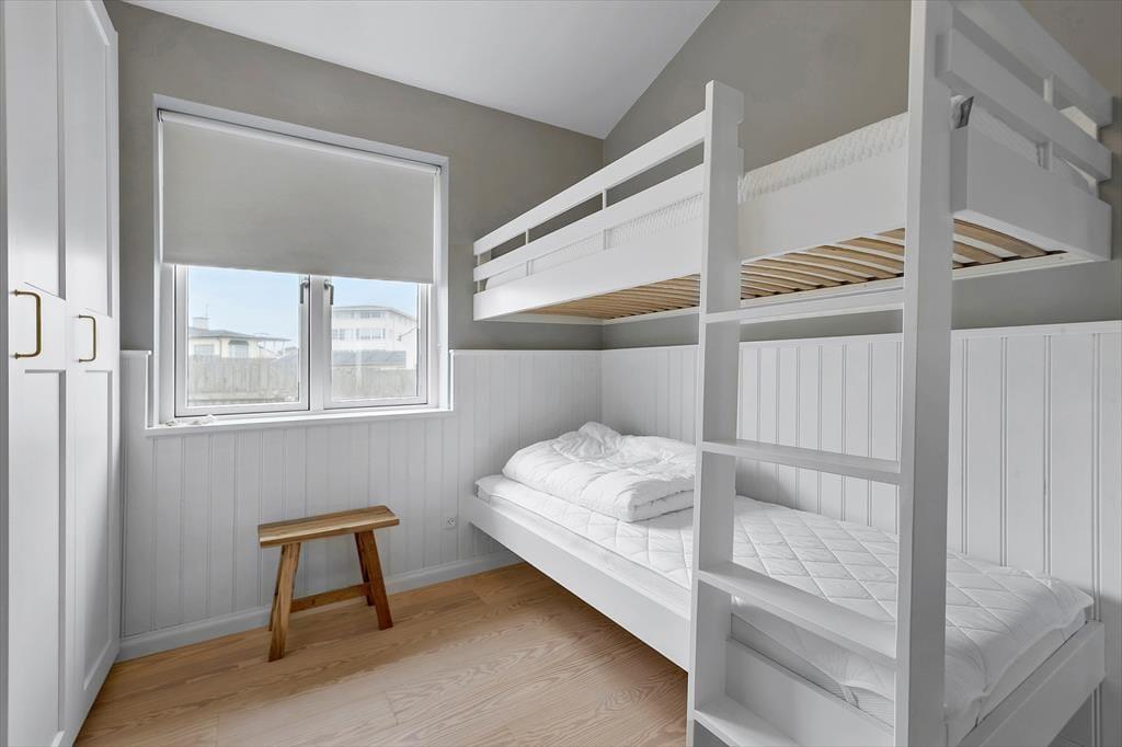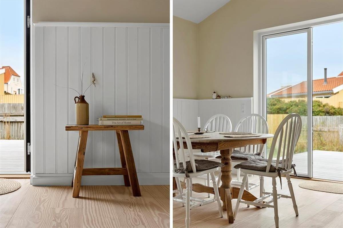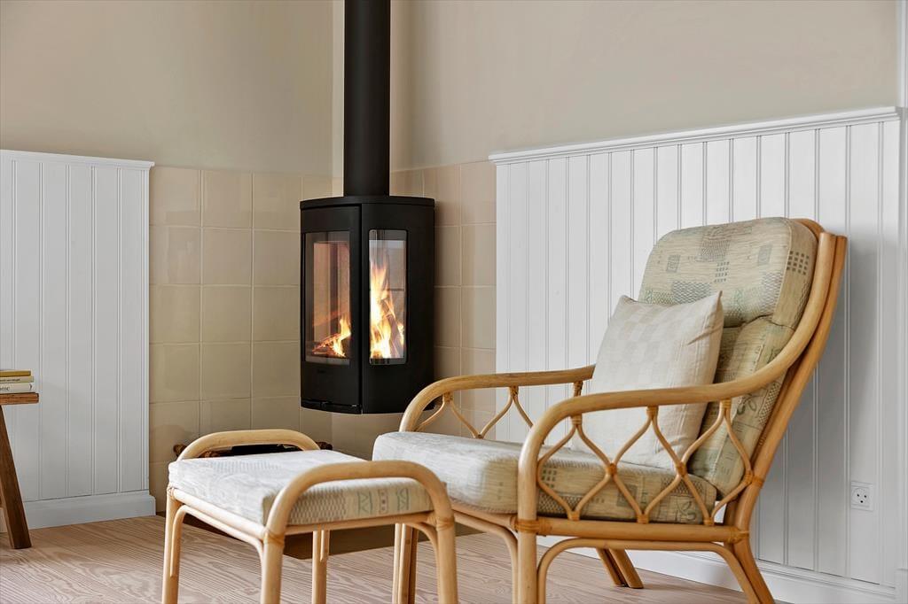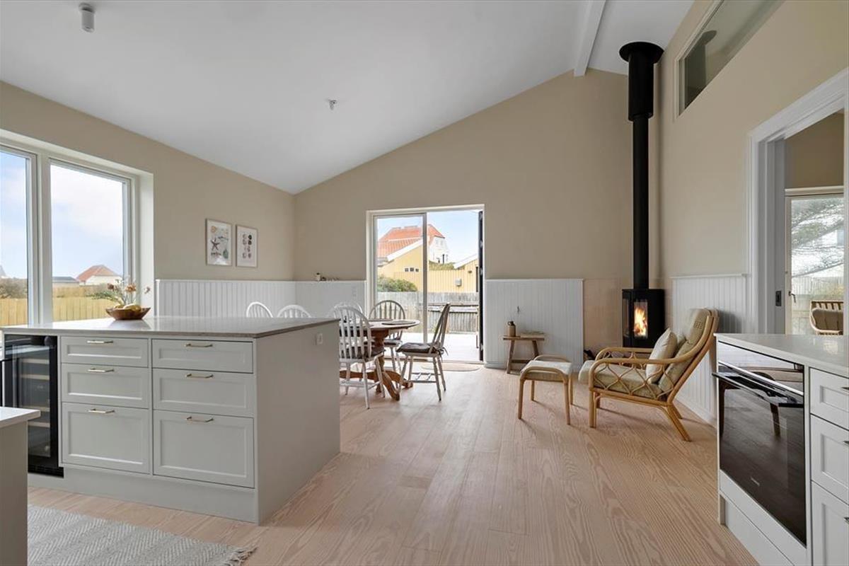 Schon beim Betreten spürst du die angenehme Atmosphäre, die das Haus ausstrahlt. Die hellen Materialien und das durchdachte Design machen den Aufenthalt zu einem Vergnügen, und im ganzen Haus sorgt die Fußbodenheizung für Komfort zu jeder Jahreszeit. Die Küche ist offen mit dem Wohnzimmer verbunden und schafft so einen hellen und großzügigen Wohnbereich, in dem Ferienmahlzeiten und gesellige Stunden ineinander übergehen. Hier kannst du mit lokalen Zutaten kochen, während die Gespräche am Esstisch weiterfließen. Wenn die Dunkelheit hereinbricht, lädt der Kaminofen mit seiner knisternden Wärme zu gemütlichen Abenden ein – perfekt nach einem erlebnisreichen Tag. Der Grundriss bietet drei Schlafzimmer und ein Badezimmer, sodass sich die ganze Familie wohlfühlen kann.
