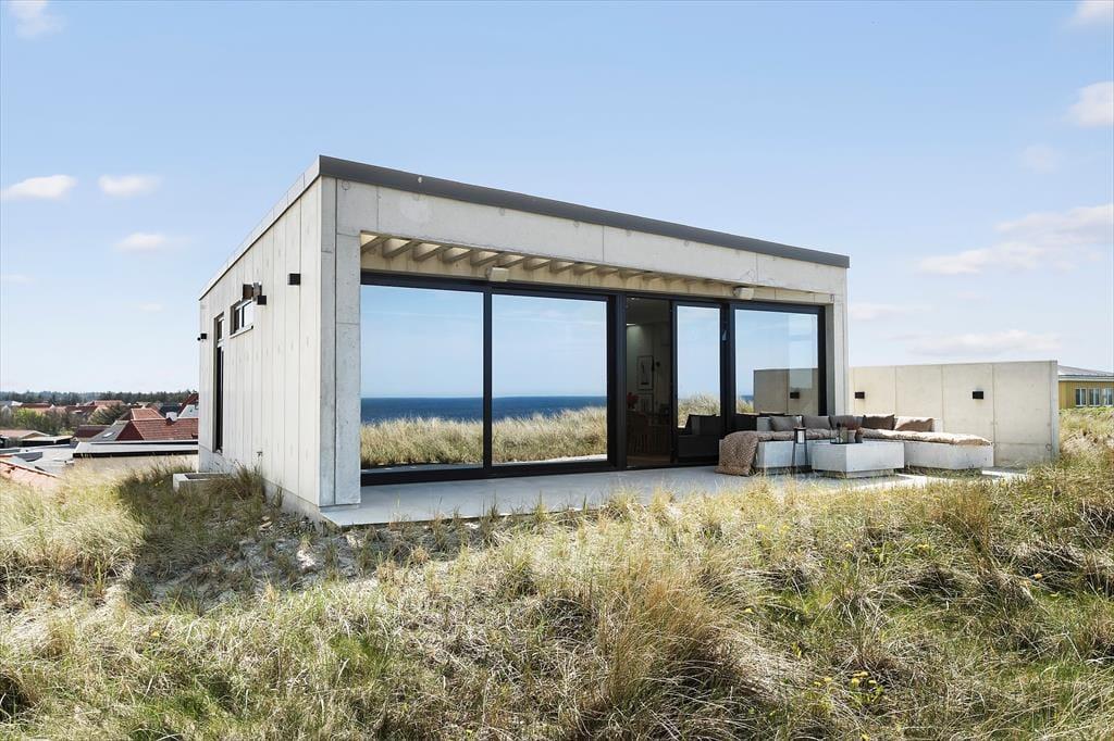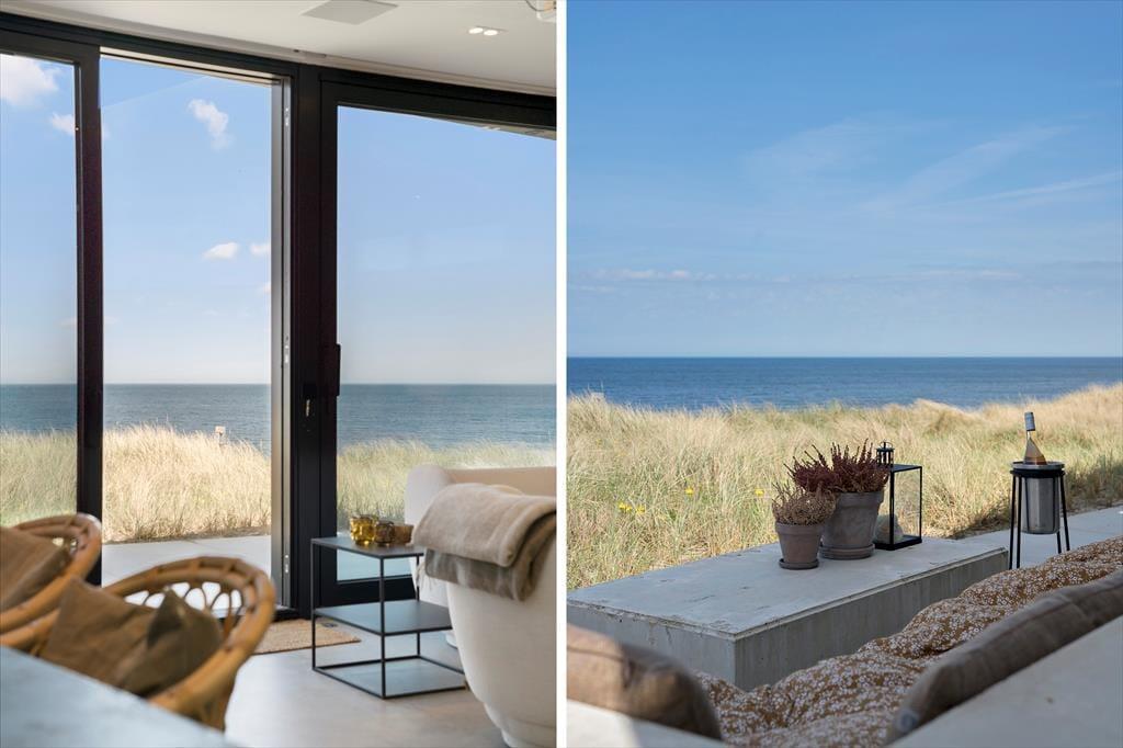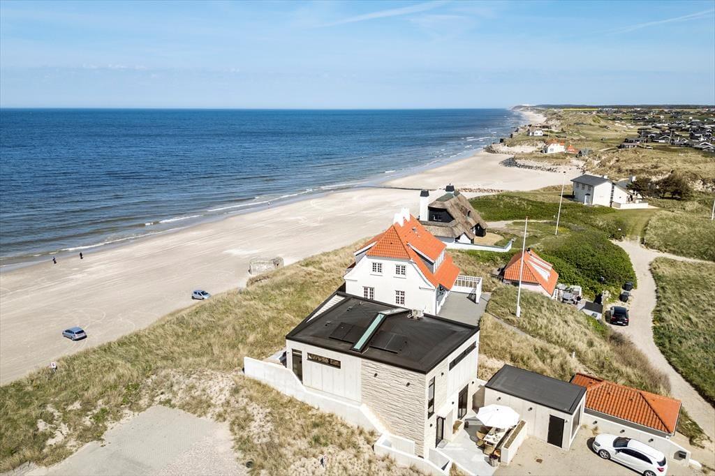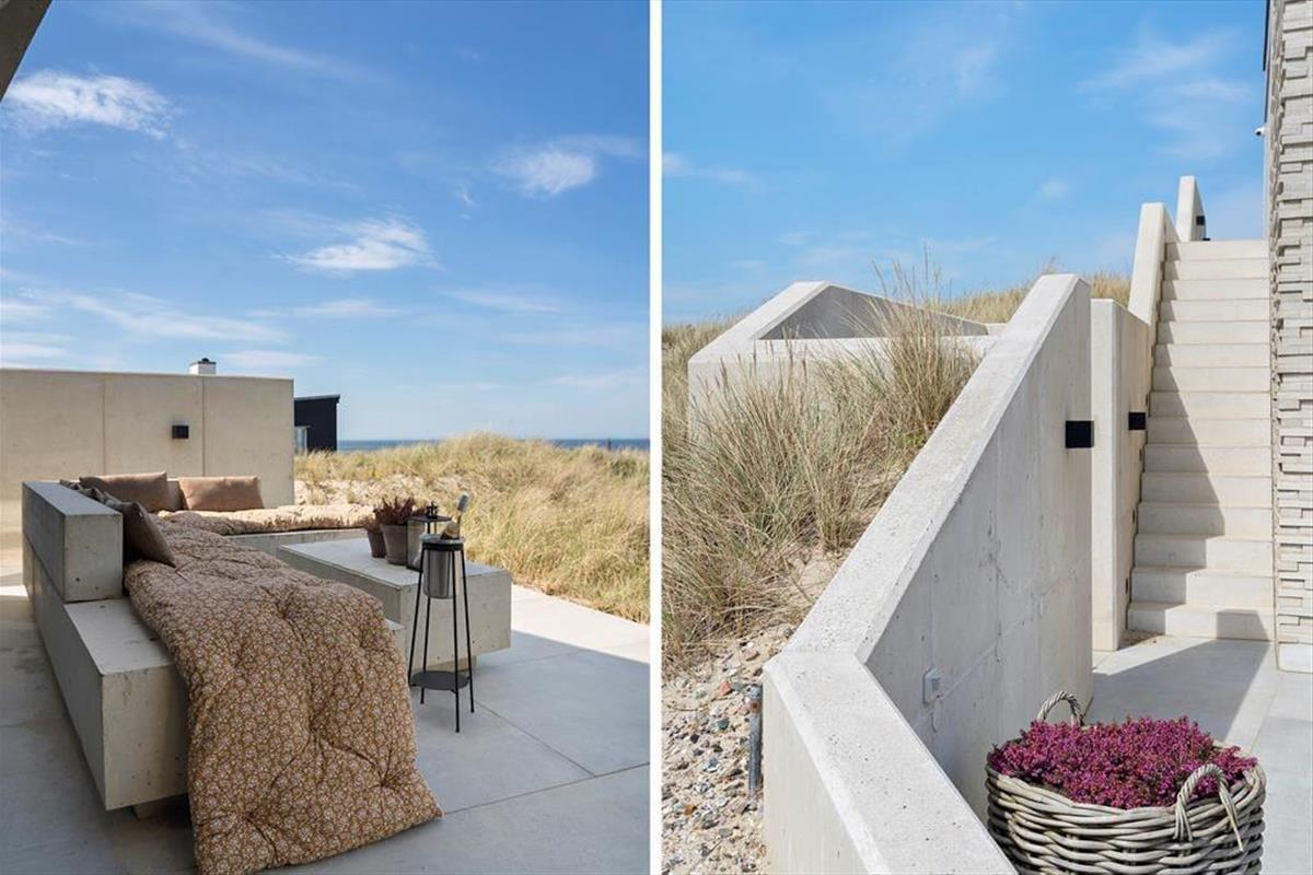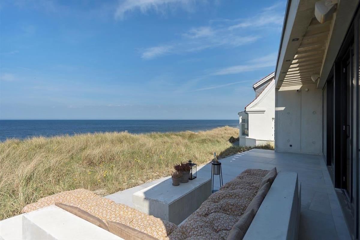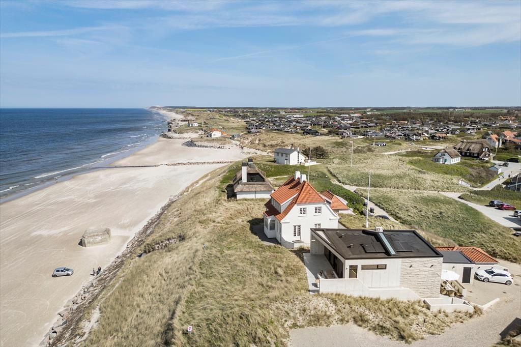 Das Ferienhaus wurde direkt in die Dünen gebaut. Mit seiner stilreinen Fassade aus weißem Beton harmoniert es wunderbar mit der Umgebung. Beachte unbedingt, wie sich das Meer und der grüne Strandhafer in den Panoramafenstern spiegeln - schöner geht es kaum! Dies ist allerdings nur eines der vielen Details die zeigen, dass bei diesem Objekt großer Wert darauf gelegt wurde, die Architektur mit der Natur zu vereinen. Im Inneren des Hauses eröffnen sich selbstverständlich ebenfalls reiche Möglichkeiten, die Landschaft zu bewundern. Dies gilt insbesondere für den Aufenthaltsbereich im Obergeschoss, bei dem sich ein riesiges Panoramafenster über die gesamte westliche Hausseite erstreckt. Alles, von der mahagonifarbenen Küche über die weiße Polstersitzgruppe bis zum schönen Essplatz, zeugt von hoher Qualität. Gleiches gilt selbstverständlich auch für die übrigen Räumlichkeiten. Verteilt auf zwei Etagen erwarten euch unter anderem drei Schlafräume und zwei Badezimmer. Eines der Bäder verwöhnt mit einer tollen Badewanne. Im gesamten Haus sorgt eine Fußbodenheizung für ein ganzjährig angenehmes Klima.