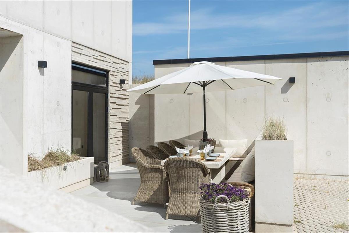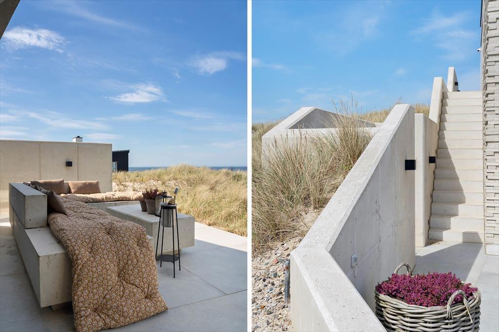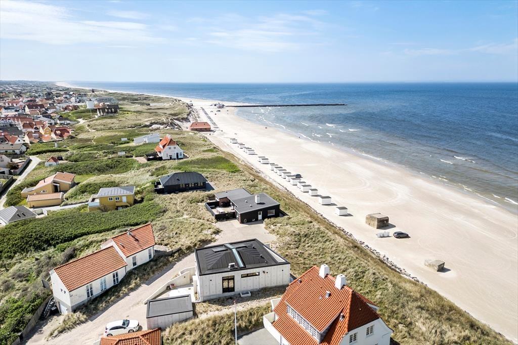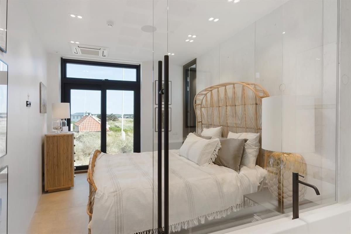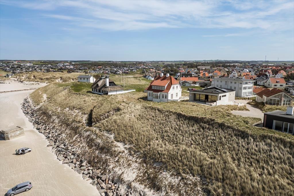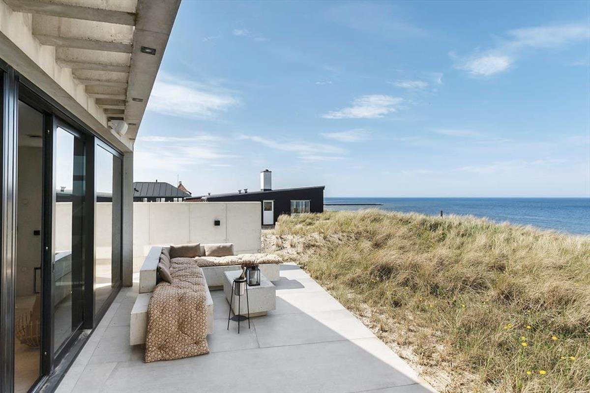 Das Ferienhaus wurde direkt in die Dünen gebaut. Mit seiner stilreinen Fassade aus weißem Beton harmoniert es wunderbar mit der Umgebung. Beachte unbedingt, wie sich das Meer und der grüne Strandhafer in den Panoramafenstern spiegeln - schöner geht es kaum! Dies ist allerdings nur eines der vielen Details die zeigen, dass bei diesem Objekt großer Wert darauf gelegt wurde, die Architektur mit der Natur zu vereinen. Im Inneren des Hauses eröffnen sich selbstverständlich ebenfalls reiche Möglichkeiten, die Landschaft zu bewundern. Dies gilt insbesondere für den Aufenthaltsbereich im Obergeschoss, bei dem sich ein riesiges Panoramafenster über die gesamte westliche Hausseite erstreckt. Alles, von der mahagonifarbenen Küche über die weiße Polstersitzgruppe bis zum schönen Essplatz, zeugt von hoher Qualität. Gleiches gilt selbstverständlich auch für die übrigen Räumlichkeiten. Verteilt auf zwei Etagen erwarten euch unter anderem drei Schlafräume und zwei Badezimmer. Eines der Bäder verwöhnt mit einer tollen Badewanne. Im gesamten Haus sorgt eine Fußbodenheizung für ein ganzjährig angenehmes Klima.