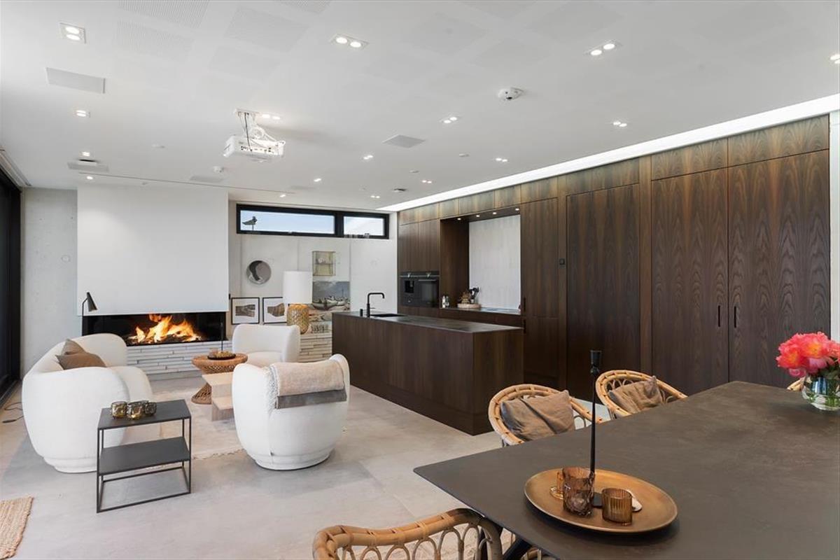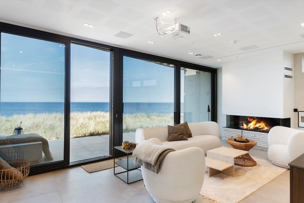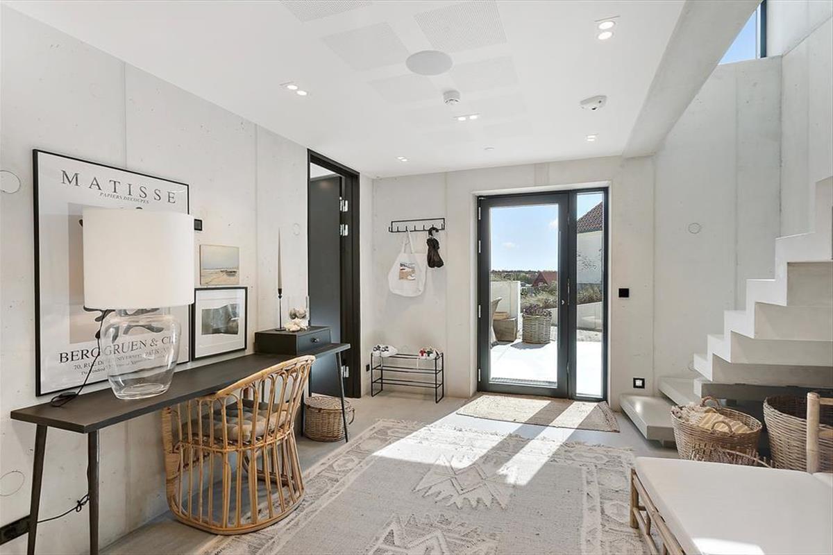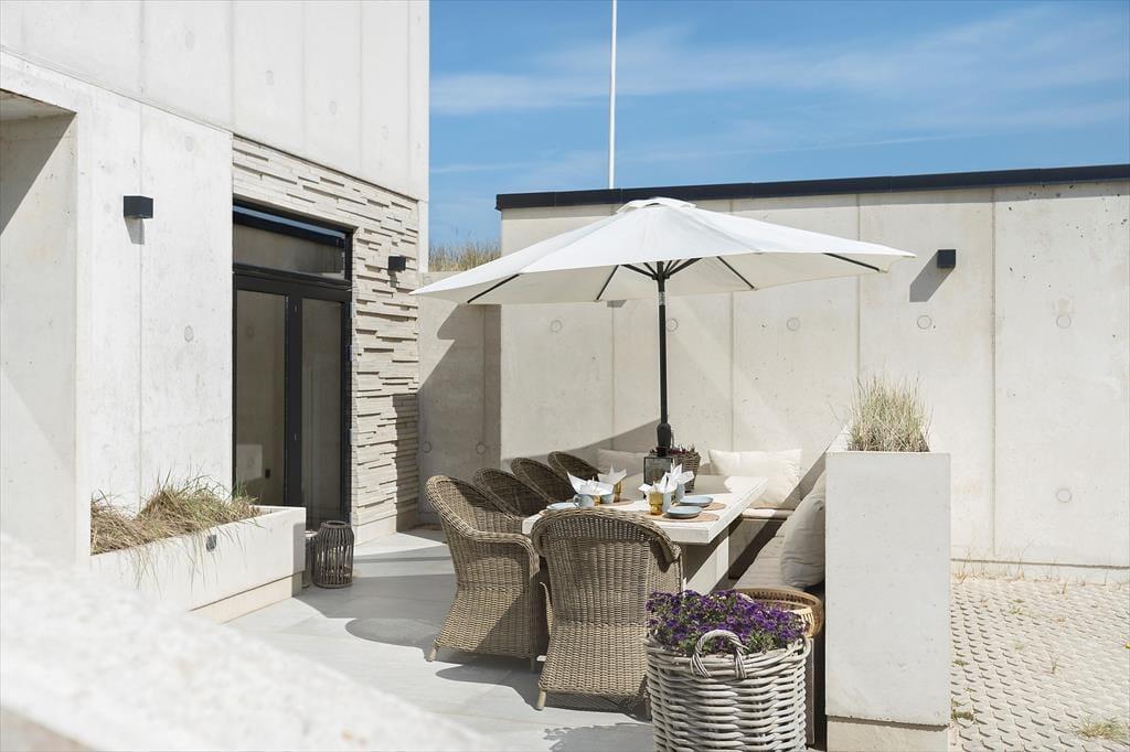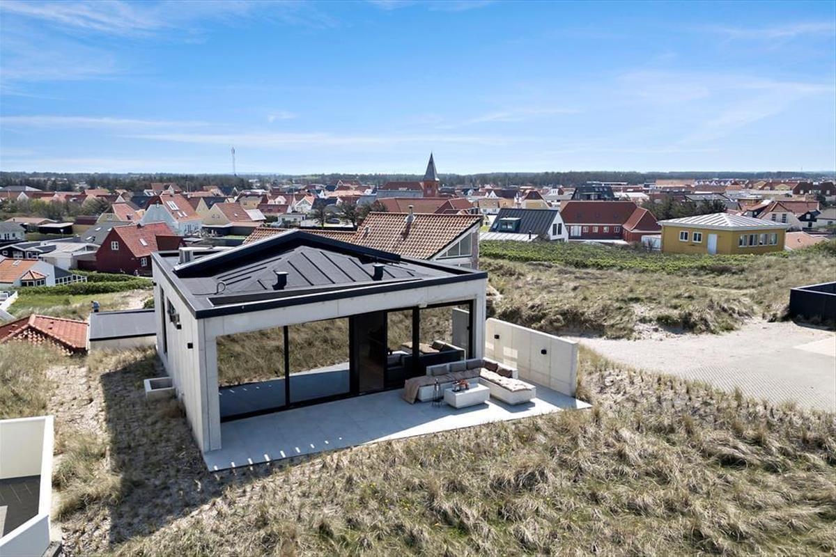 Das Ferienhaus wurde direkt in die Dünen gebaut. Mit seiner stilreinen Fassade aus weißem Beton harmoniert es wunderbar mit der Umgebung. Beachte unbedingt, wie sich das Meer und der grüne Strandhafer in den Panoramafenstern spiegeln - schöner geht es kaum! Dies ist allerdings nur eines der vielen Details die zeigen, dass bei diesem Objekt großer Wert darauf gelegt wurde, die Architektur mit der Natur zu vereinen. Im Inneren des Hauses eröffnen sich selbstverständlich ebenfalls reiche Möglichkeiten, die Landschaft zu bewundern. Dies gilt insbesondere für den Aufenthaltsbereich im Obergeschoss, bei dem sich ein riesiges Panoramafenster über die gesamte westliche Hausseite erstreckt. Alles, von der mahagonifarbenen Küche über die weiße Polstersitzgruppe bis zum schönen Essplatz, zeugt von hoher Qualität. Gleiches gilt selbstverständlich auch für die übrigen Räumlichkeiten. Verteilt auf zwei Etagen erwarten euch unter anderem drei Schlafräume und zwei Badezimmer. Eines der Bäder verwöhnt mit einer tollen Badewanne. Im gesamten Haus sorgt eine Fußbodenheizung für ein ganzjährig angenehmes Klima.