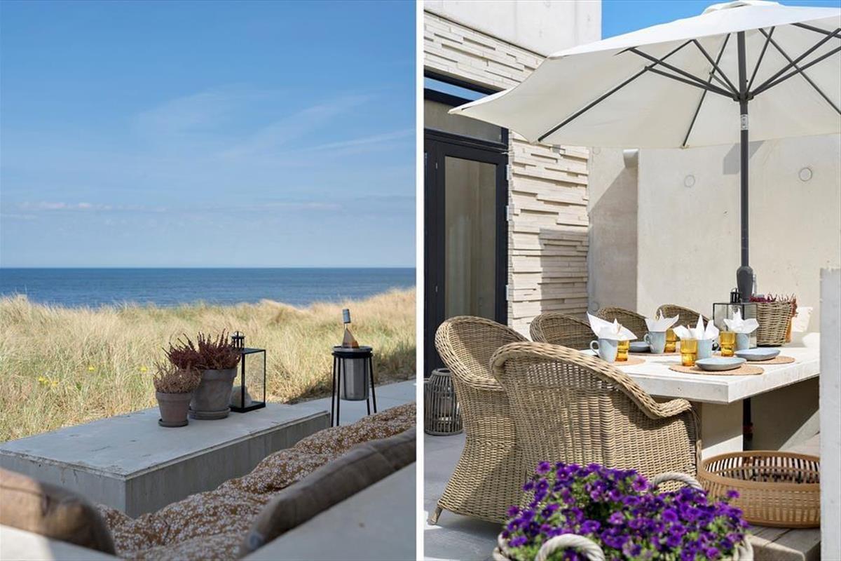 Mit Terrassen an beiden Seiten des Hauses findest du zu jeder Zeit einen passenden Aufenthaltsplatz. Das gen Südosten ausgerichtete Terrassenareal ist in den Morgenstunden wunderbar sonnig. Die Dünen und das Haus selber sorgen hier bei Westwind für Windschutz. Mit einer schier fantastischen Panoramaaussicht verzaubert hingegen die in nordwestliche Richtung weisende Terrasse, auf der du direkt vor dem wogenden Strandhafer sitzt und freien Ausblick auf Himmel und Meer genießt. Auf dieser Terrasse erwarten dich abends traumhaft schöne Sonnenuntergänge, die die Umgebung in rosa- und orangefarbene Töne hüllen.