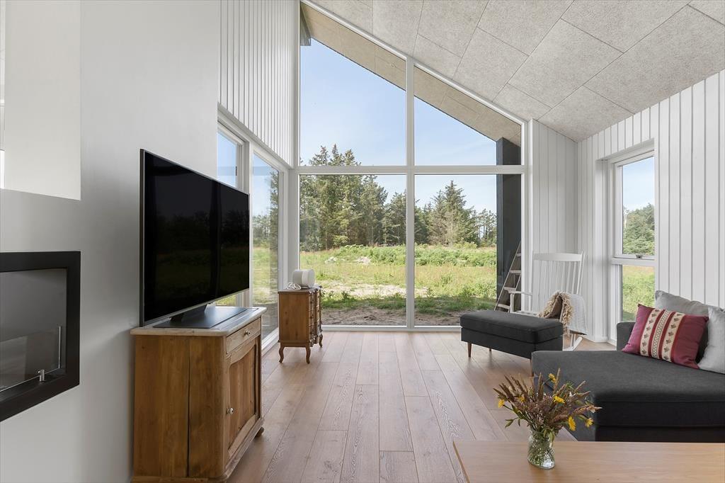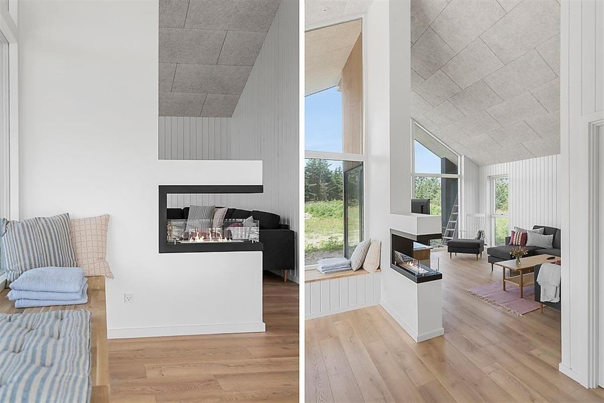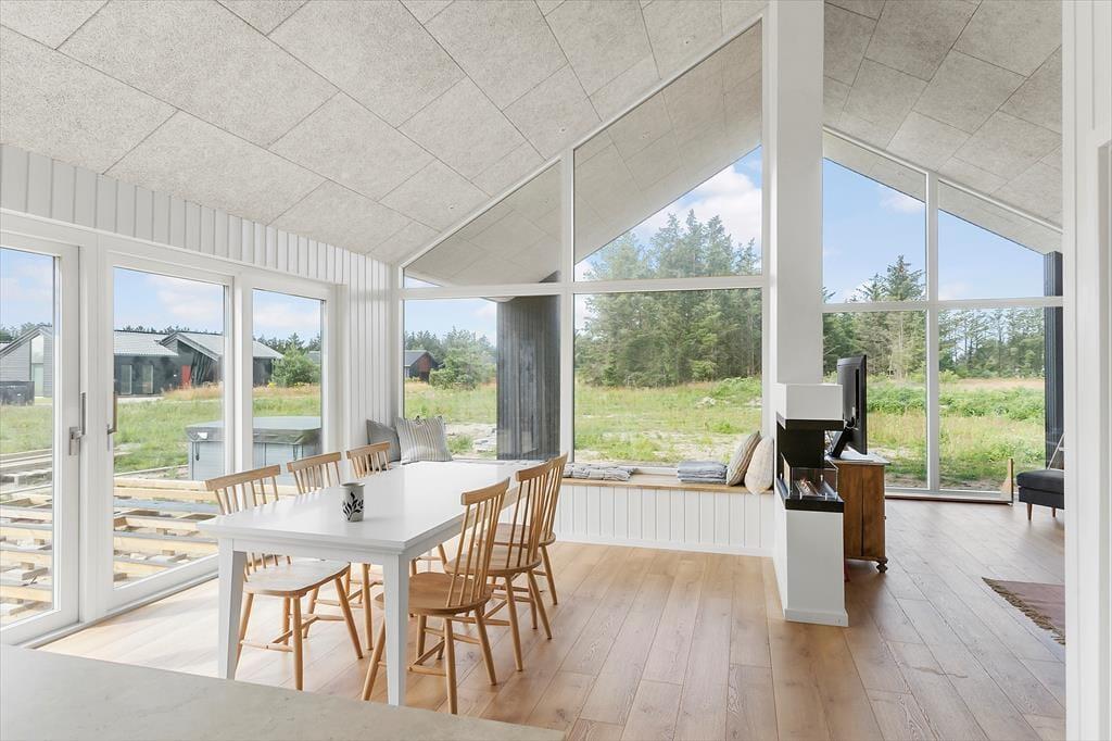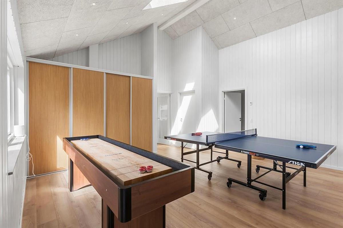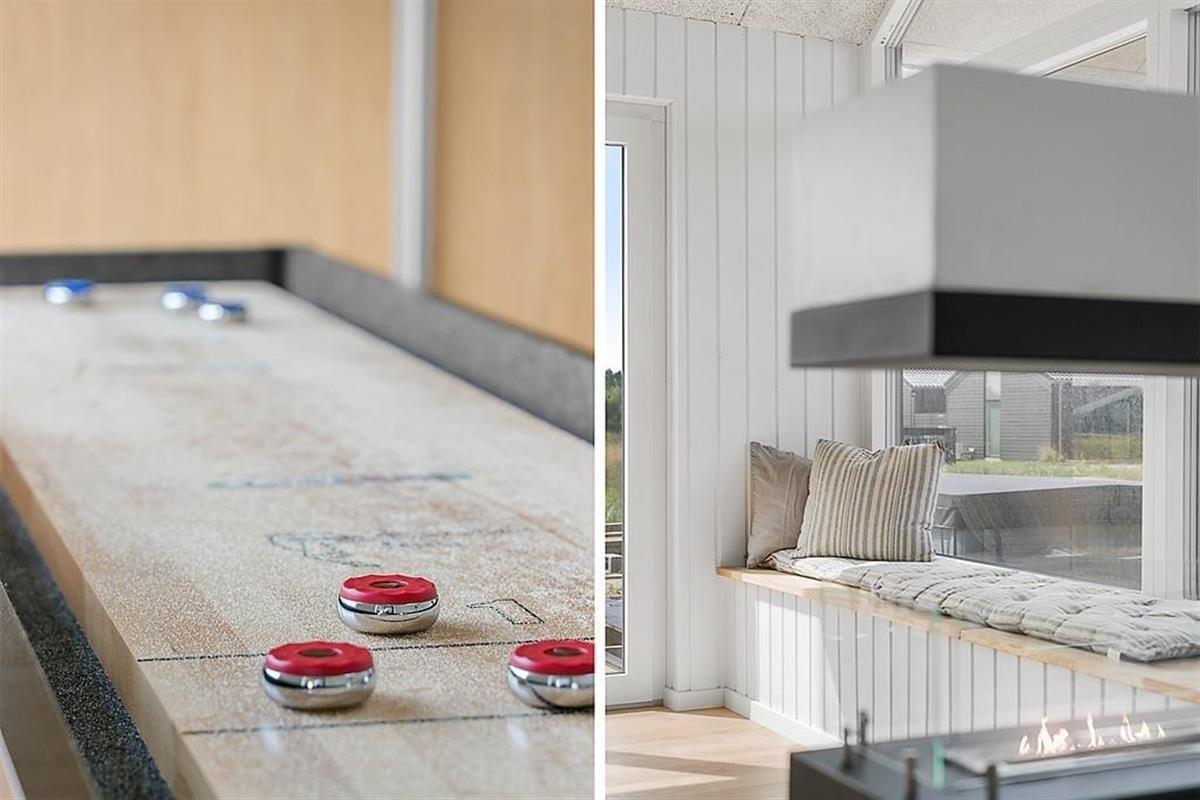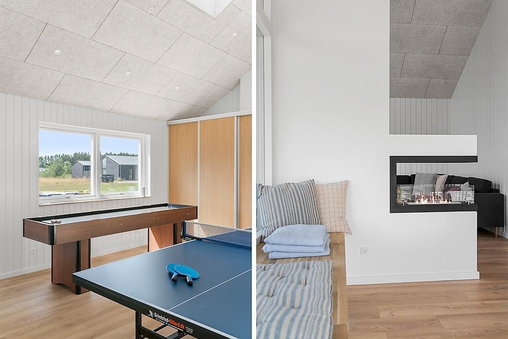 Beim Betreten dieses exklusiven Ferienhauses wirst du sofort die moderne und stilvolle Einrichtung bemerken, die Luxus und Komfort ausstrahlt. Das Haus ist mit einem offenen Grundriss gestaltet, in dem Küche und Wohnzimmer integriert sind, was eine geräumige und helle Atmosphäre schafft. Die offene Dachkonstruktion und die großen Fenster sorgen für ein fantastisches Lichtspiel, das die schönen Details des außergewöhnlichen Baus hervorhebt. Die Küche ist gut ausgestattet und lädt zu gemütlichem Kochen ein, während der Biokamin im Wohnzimmer an kühlen Abenden eine warme und gemütliche Stimmung verbreitet. Für zusätzliche Unterhaltung verfügt das Haus über einen Aktivitätsraum mit Shuffleboard und Tischtennis, ideal für lustige Momente mit der ganzen Familie.