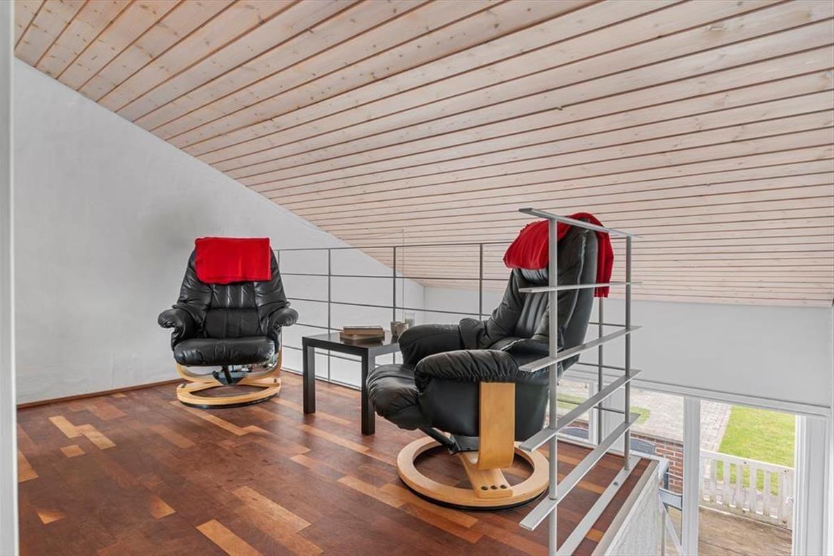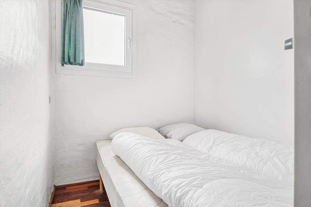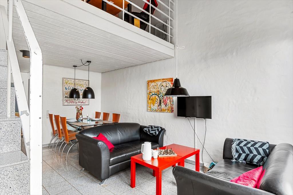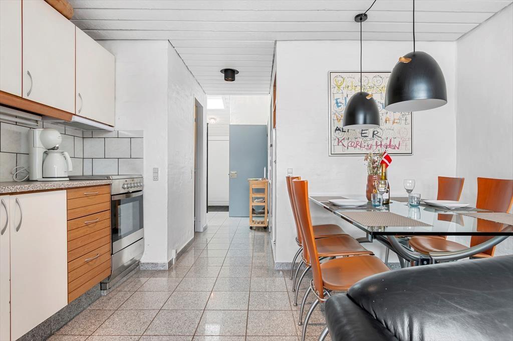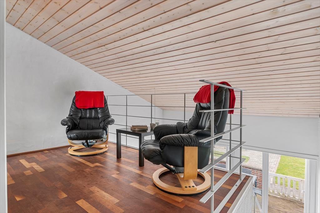 Wenn du so nah an sowohl dem Stadtzentrum als auch dem Strand von Løkken wohnst, können Badeausflüge, Shopping, Galeriebesuche und Surfen sicher schnell einen großen Teil der Zeit ausfüllen – aber es ist auch verlockend, einfach zuhause im Ferienhaus zu entspannen. Der Grundriss erstreckt sich über zwei Etagen, und zwei der Schlafzimmer befinden sich im ersten Stock, während das dritte im Erdgeschoss direkt beim Eingang liegt. Das Badezimmer ist aufgeteilt, sodass es ein separates Bad und WC gibt, und eine kleine, aber funktionale Küche ist in das Wohnzimmer integriert, sodass es einfach ist, schnell mehr Kaffee zu machen oder mit der Vorbereitung des Abendessens zu beginnen. Sowohl der Esstisch als auch der Sofabereich sind gemütliche Orte zum Versammeln, und wenn du eine ruhige Minute brauchst, kannst du dich mit einem guten Buch in einem Sessel auf dem Treppenabsatz im ersten Stock niederlassen.