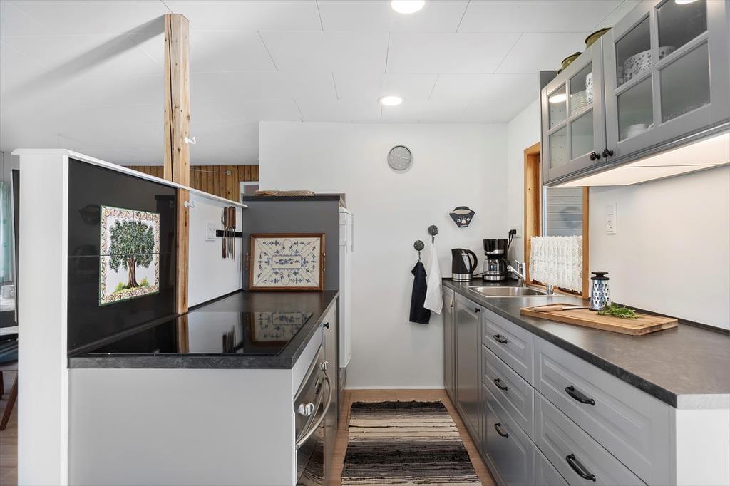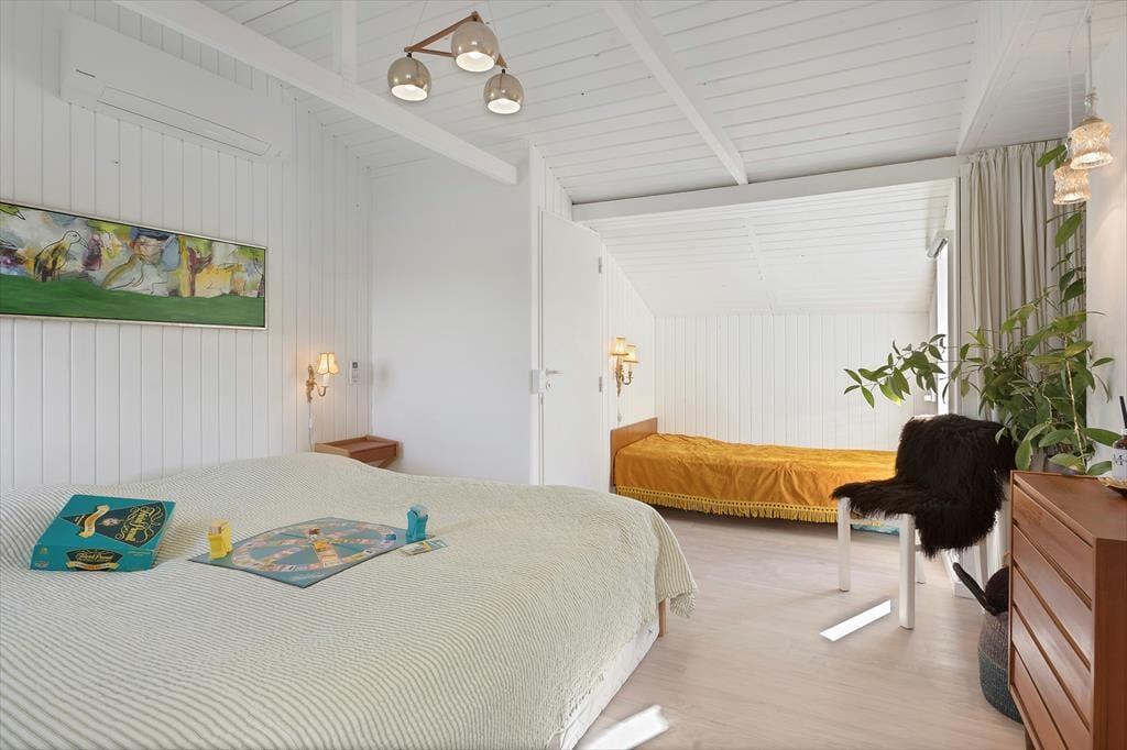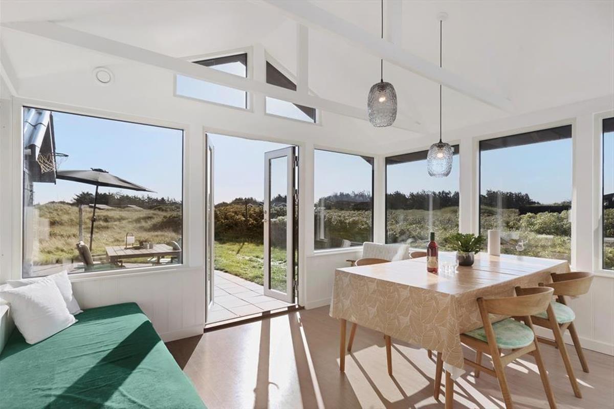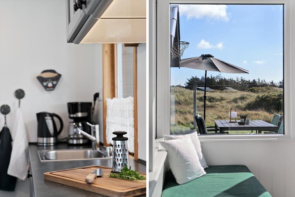 Das Ferienhaus besticht durch eine charmante und helle Einrichtung, in der gemütliche Ecken und praktische Lösungen dir das Entspannen und das Miteinander leicht machen. Im Haus befinden sich zwei gute Schlafzimmer und ein Badezimmer mit einer angenehmen Fußbodenheizung, die die Morgenstunden besonders komfortabel macht. Küche und Wohnzimmer sind zu einem offenen, einladenden Wohnbereich integriert, in dem große Fenster viel Licht hereinlassen und die Natur nach drinnen holen. Neben dem Wohnzimmer kannst du in einen gemütlichen Wintergarten treten, in dem ein Biokamin für Wärme und Atmosphäre sorgt – perfekt für ruhige Abende mit einer Tasse heißer Schokolade und einem guten Buch. Der Wintergarten verlängert die Saison und ist ideal, um im Frühling die letzten Sonnenstrahlen oder im Herbst die lauen Abende zu genießen. Das Haus verfügt zudem über einen praktischen Hauswirtschaftsraum mit Zugang von der Terrasse, sodass es einfach ist, den Sand nach einem Strandbesuch abzuwaschen. Das separate Gästehaus bietet ein eigenes Schlafzimmer und ein Gästebad, was zusätzliche Privatsphäre und Raum schafft, wenn du Gäste oder ältere Kinder im Urlaub dabeihast. Dies sorgt für eine perfekte Balance zwischen gemeinsamer Zeit und Rückzugsmöglichkeiten in die Ruhe.