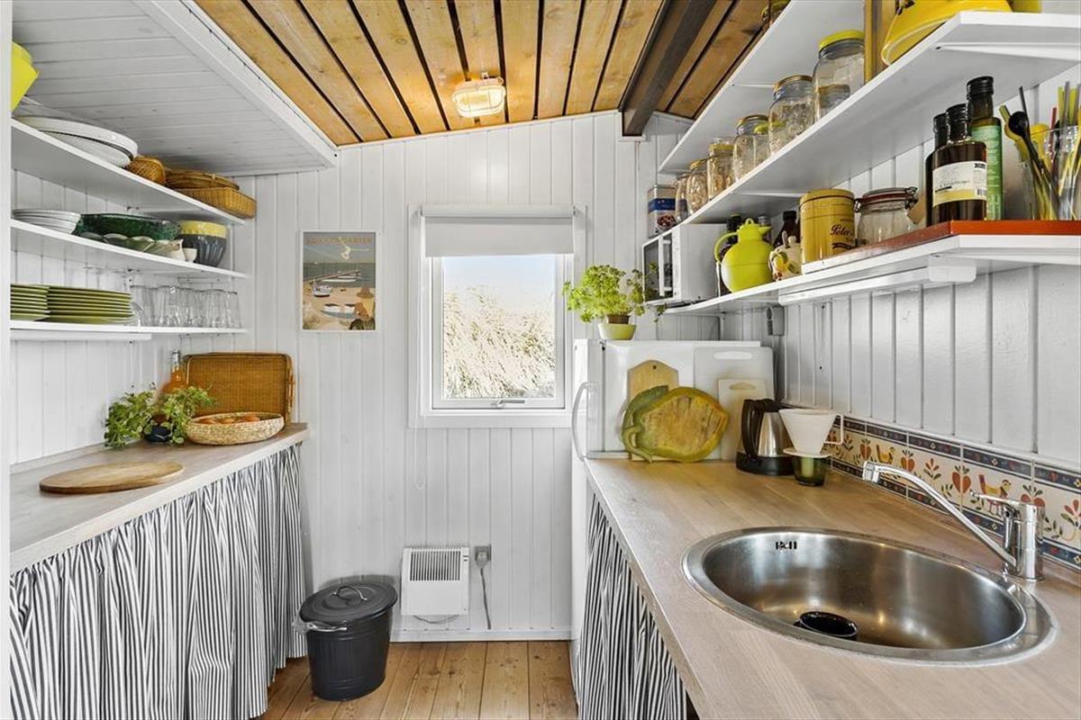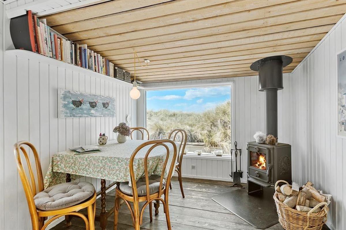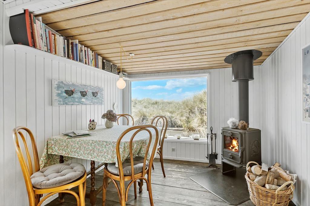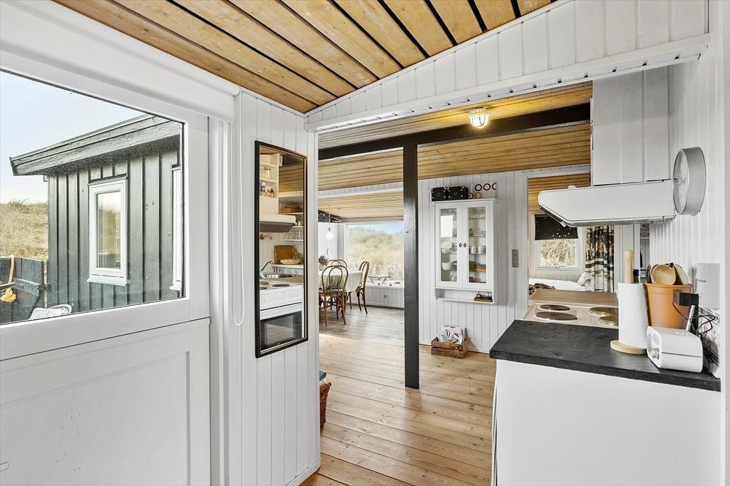 Dieses charmante Ferienhaus ist lichtdurchflutet und strahlt eine warme Atmosphäre aus, die zu gemütlichen Urlaubstagen einlädt. Das Wohnzimmer, mit seinen großen Fenstern und Blick auf die Dünen, ist der zentrale Treffpunkt des Hauses, wo du entspannte Abende verbringen kannst. Hier findest du auch einen Kaminofen, der an kühlen Tagen Wärme und Geborgenheit schenkt. Die Küche ist offen mit dem Wohnzimmer verbunden, so dass du köstliche Mahlzeiten zubereiten und gleichzeitig am Geschehen am Esstisch teilhaben kannst. Mit zwei gemütlichen Schlafzimmern bietet das Haus Platz für Familie oder Freunde, und das Badezimmer ist funktional und gepflegt. Die schlichte und einladende Einrichtung schafft die perfekte Grundlage, um dem Alltag zu entfliehen.