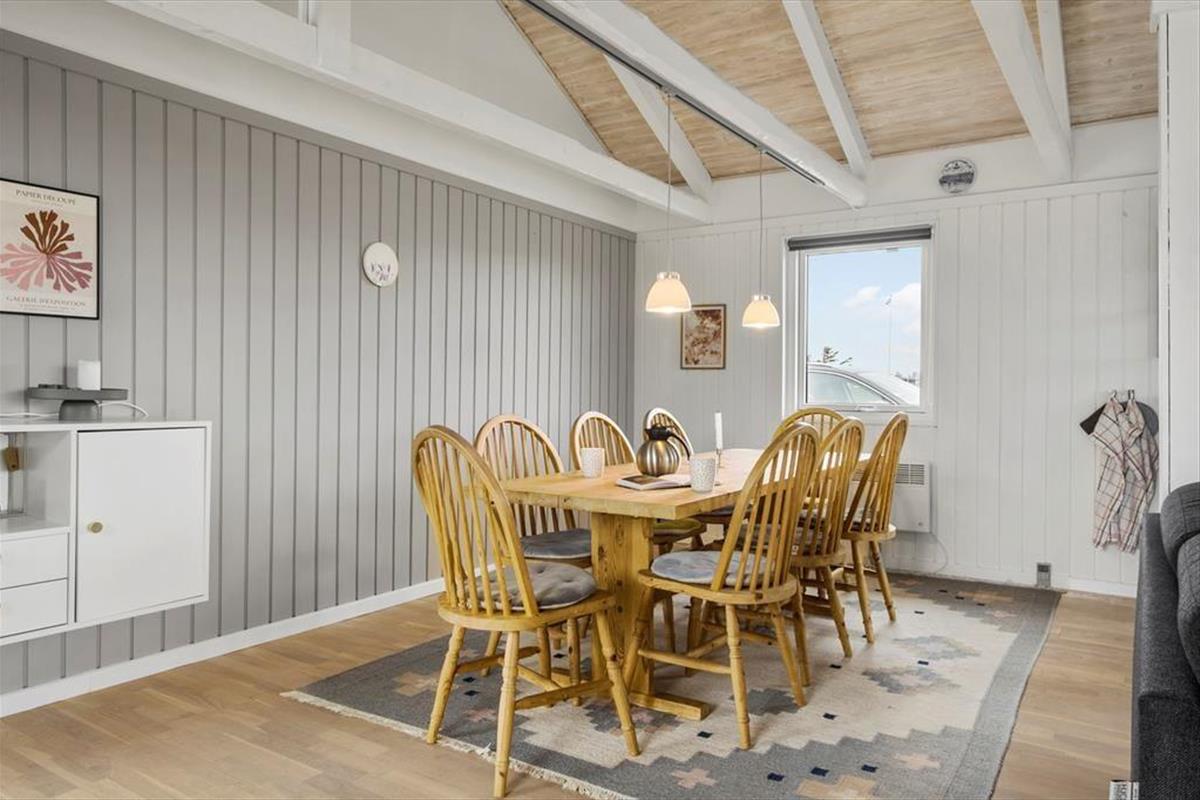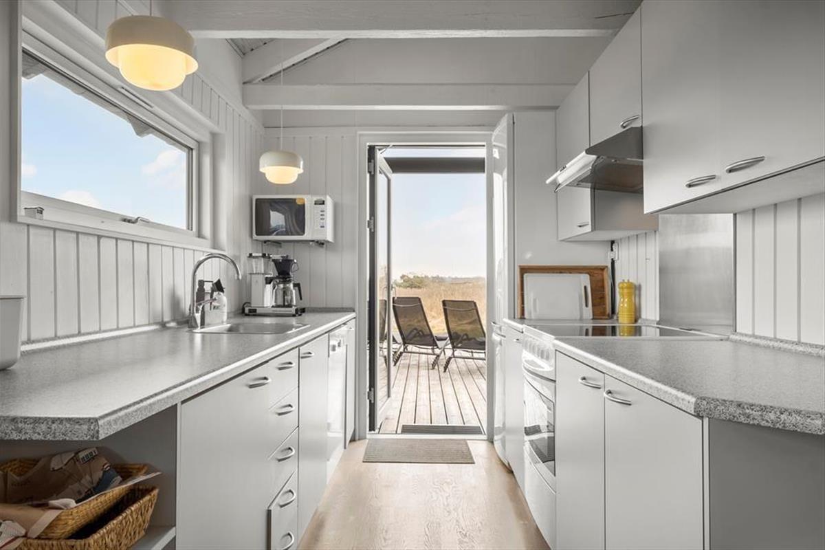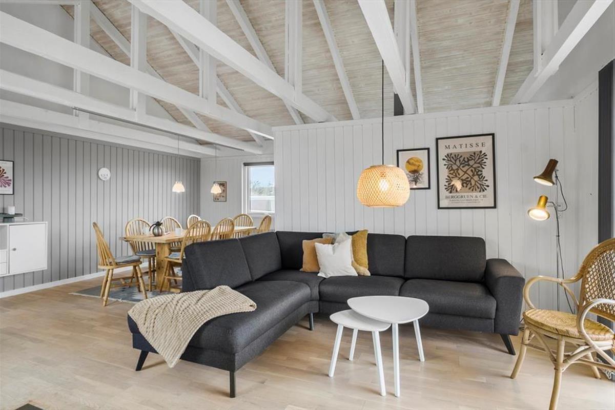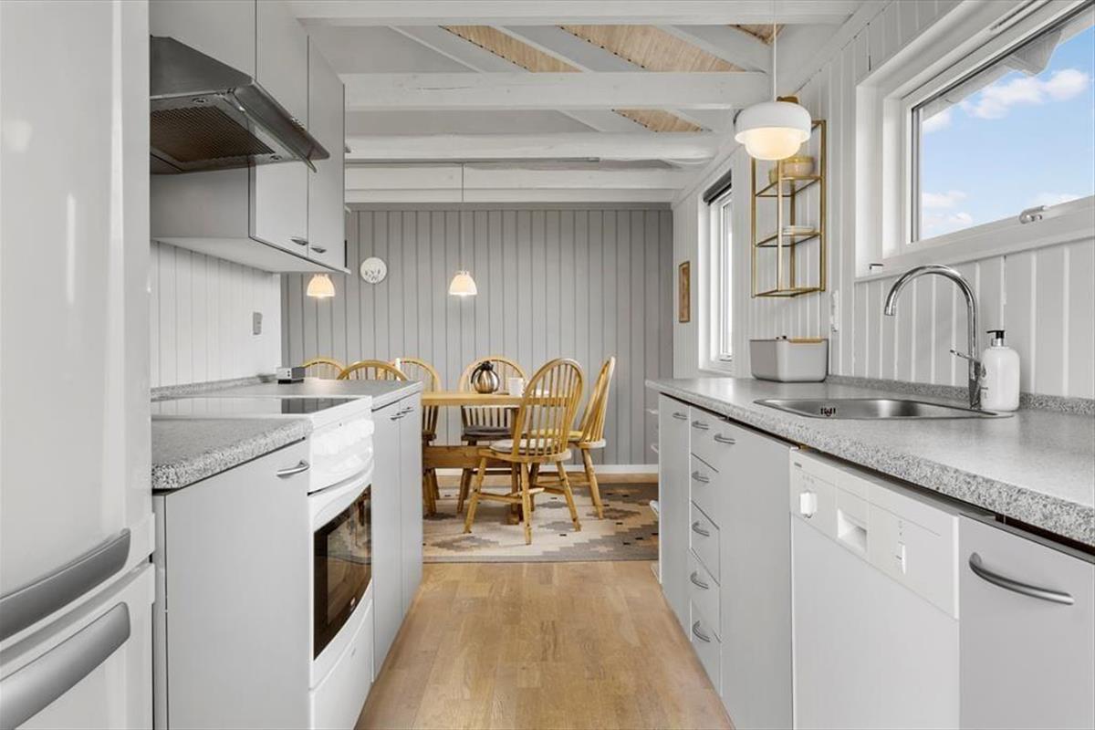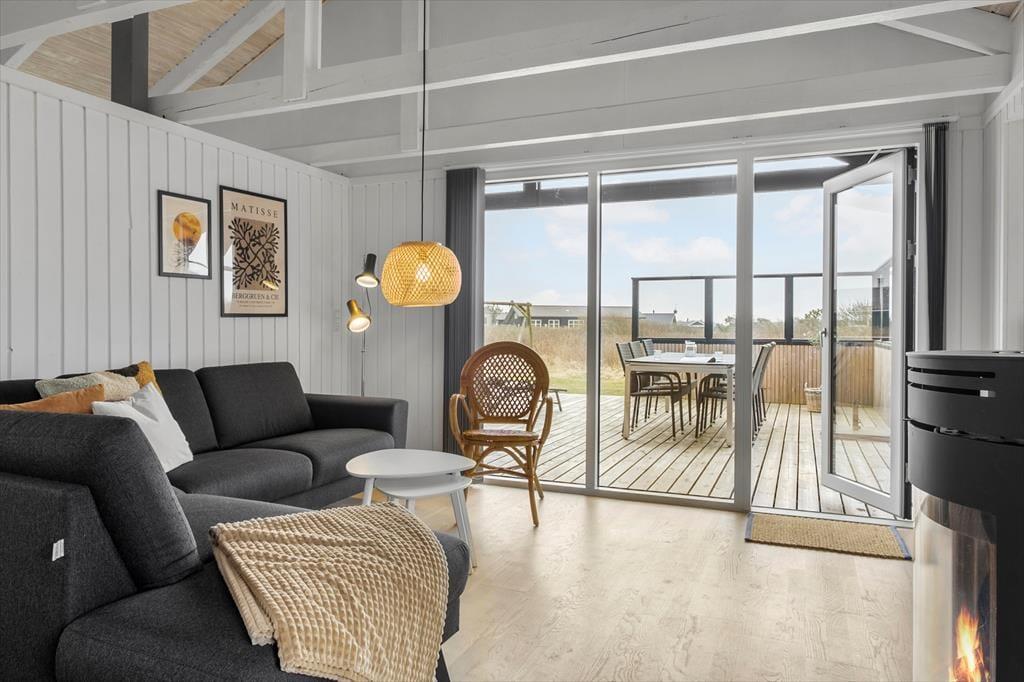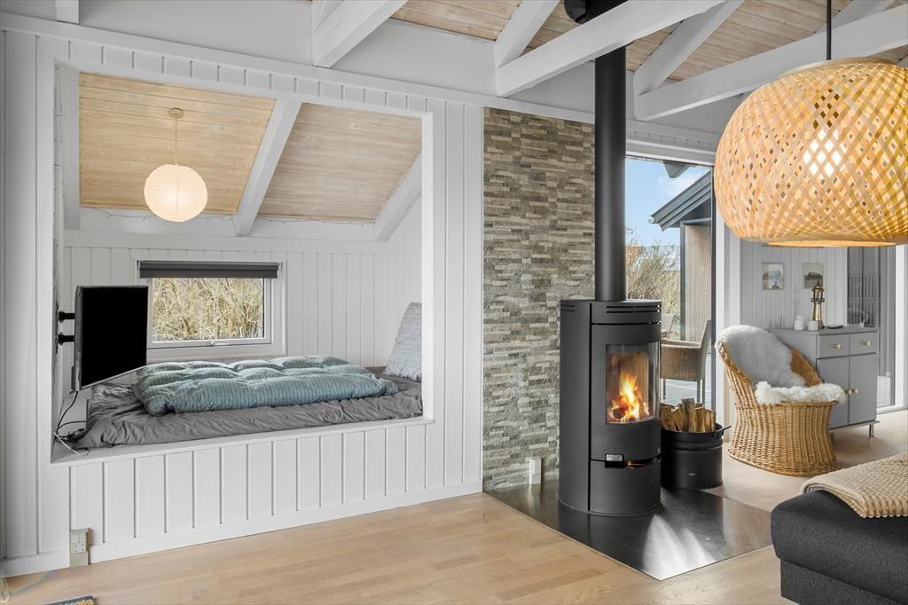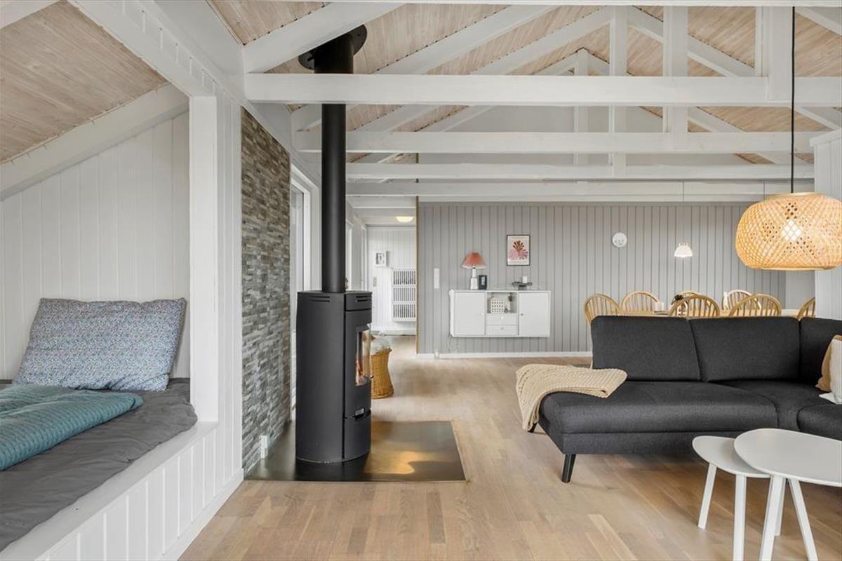 Im Inneren bietet das Ferienhaus eine helle und gemütliche Einrichtung, bei der die Atmosphäre entspannt ist und von klassischem dänischem Ferienhausflair geprägt wird. Hier findest du alles, was du brauchst, um dich zu entspannen – und vielleicht am wichtigsten: Platz für Nähe. Der offene Wohnbereich verbindet Wohnzimmer und Küche, sodass Kochen und gemütliche Stunden Hand in Hand gehen. Wenn der Duft von frisch gebrautem Kaffee sich verbreitet und die Kinder ein Puzzle am Esstisch legen, versteht man schnell, warum dieser Ort so besonders ist. Der Kaminofen sorgt für Wärme und Charme und setzt die richtige Stimmung, wenn die Dunkelheit hereinbricht. Das Haus wurde 2022 renoviert, sodass moderne Annehmlichkeiten mit authentischem Ferienhausflair kombiniert wurden.