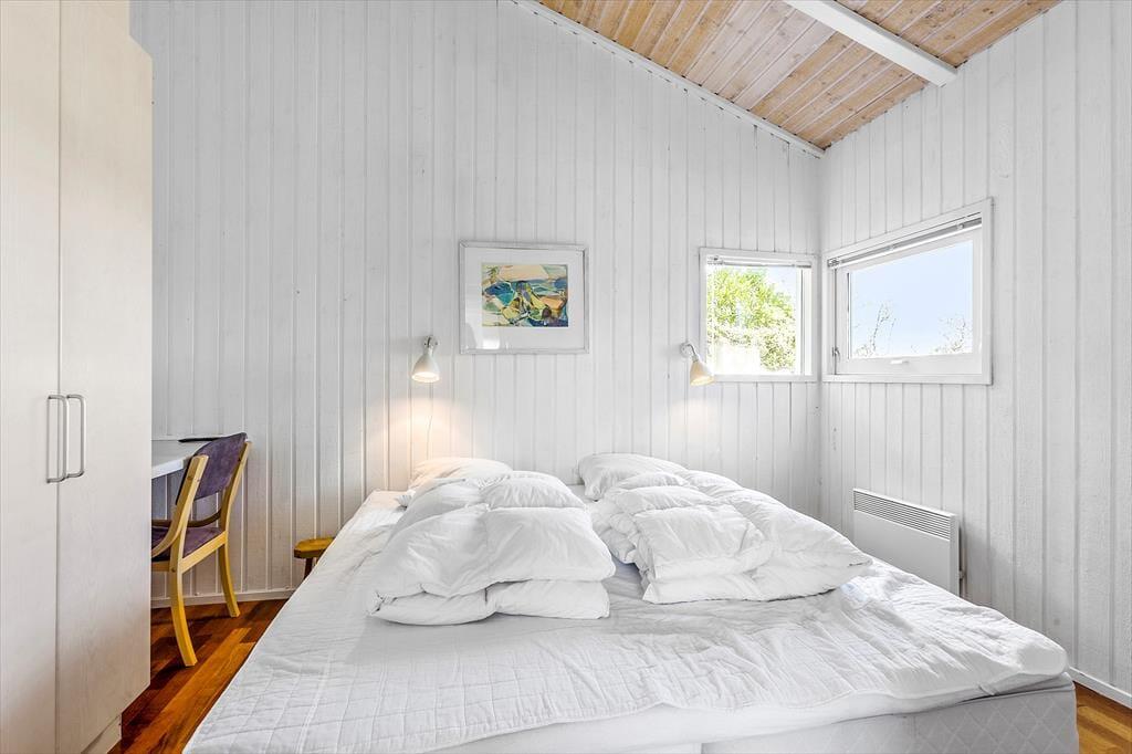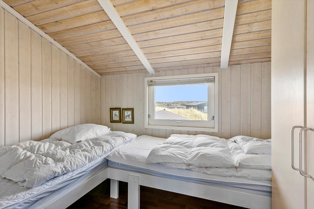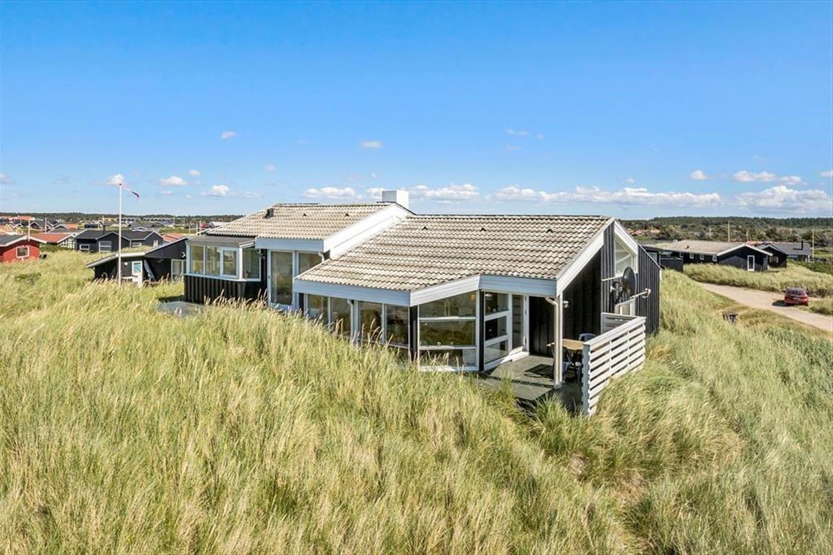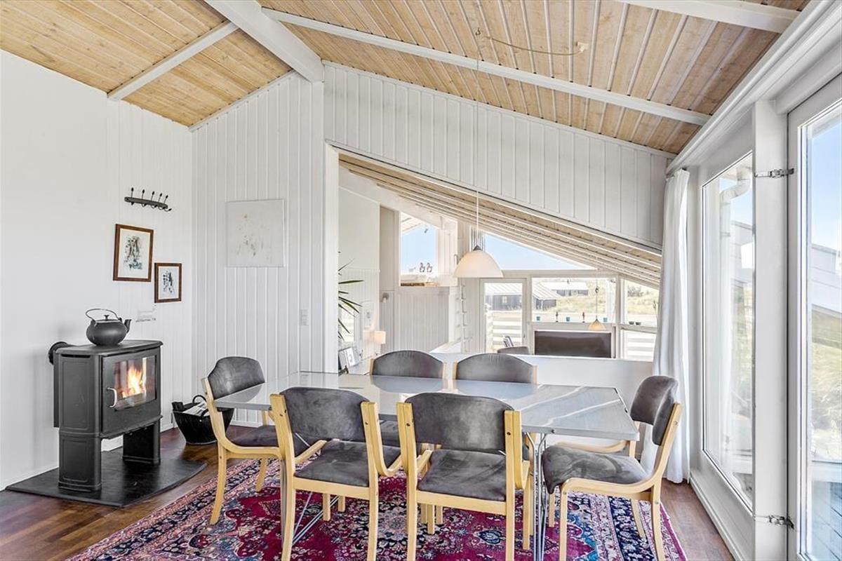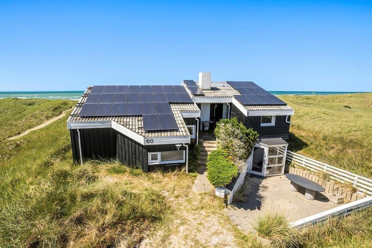 Das Ferienhaus bietet einen einzigartigen Blick auf das Wasser vom Esszimmer mit Kaminofen und der Küche. Das Haus hat zwei Badezimmer mit Fußbodenheizung, von denen eines mit einem Whirlpool und einer Sauna ausgestattet ist, während das andere eine Dusche, Toilette, einen Wäschetrockner und eine Waschmaschine hat. Zwei der Schlafzimmer sind mit Doppelbetten eingerichtet und ein Zimmer verfügt über zwei Einzelbetten. Vom gemütlichen, abgesenkten Wohnzimmer aus hat man einen Blick auf das Meer und Zugang zur Terrasse. Eine Leiter führt vom Wohnzimmer zu einem hellen und sehr gemütlichen Dachboden, der einen Blick auf die faszinierenden Dünen bietet.