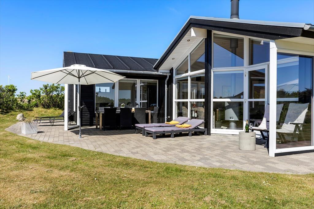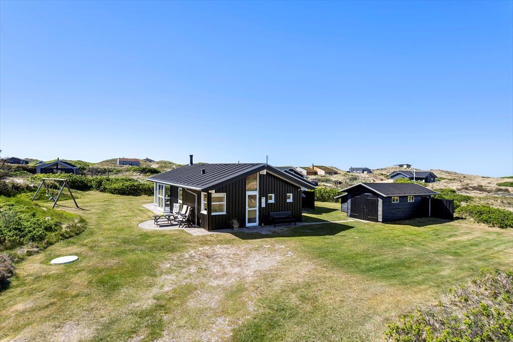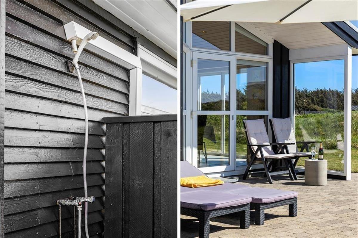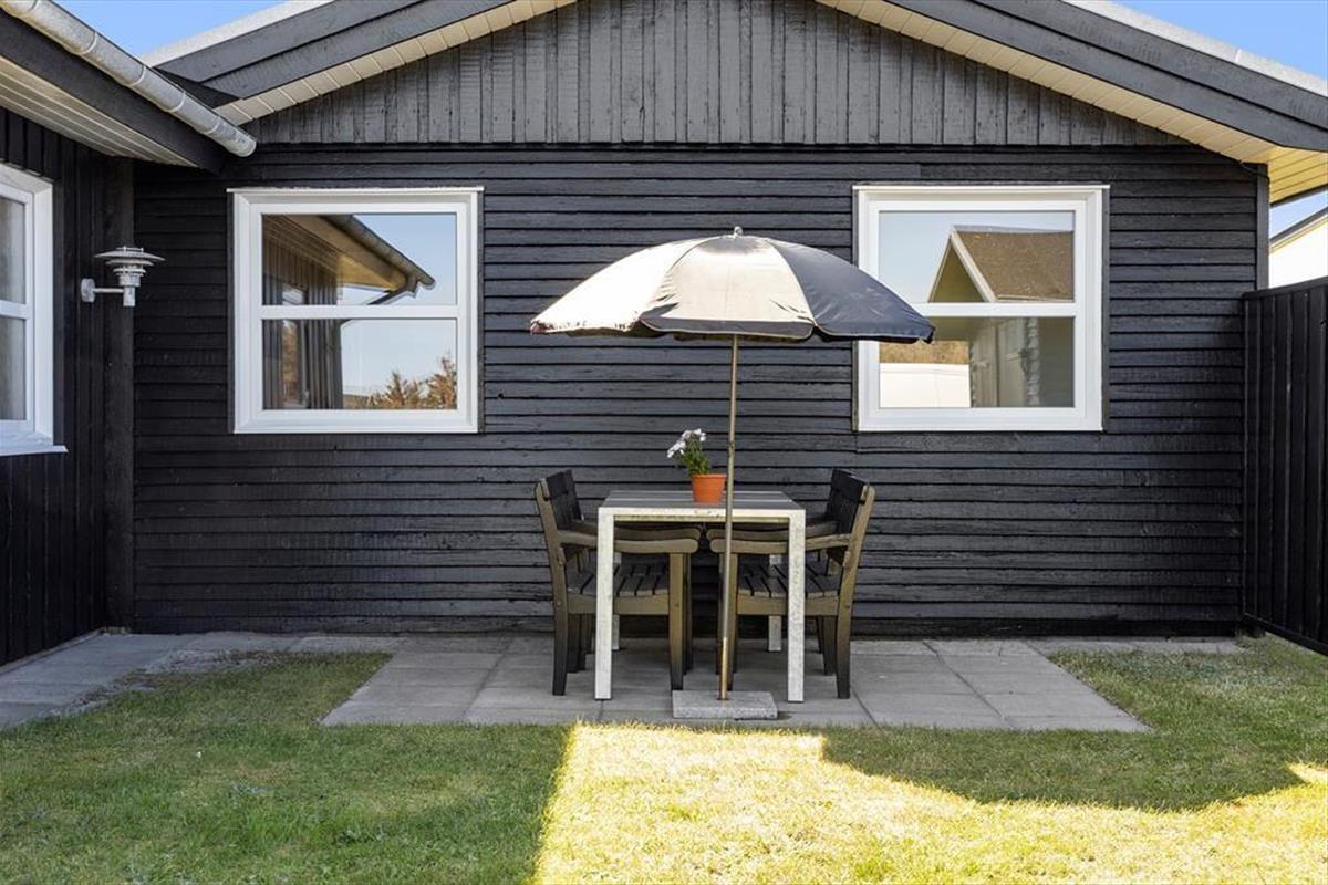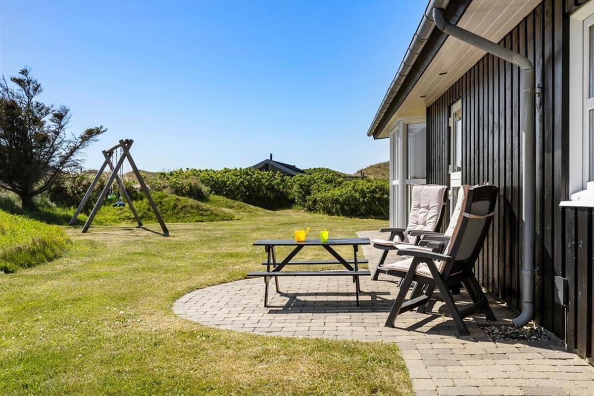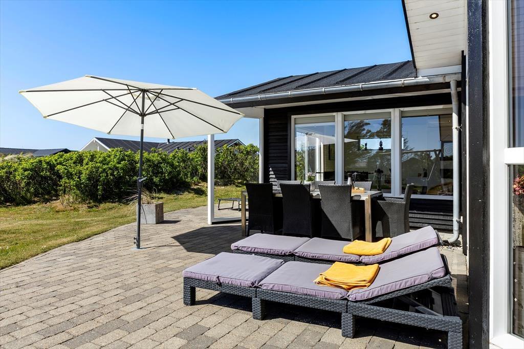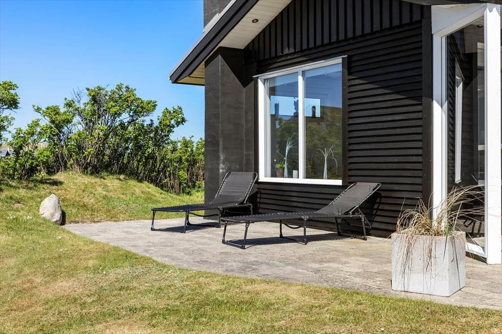 Das Haus befindet sich in ruhiger Lage, umgeben von der schönen Natur Løkkens. Hier kann man wunderbar zur Ruhe kommen und den dänischen Sommer in vollen Zügen genießen. Von Wohnzimmer und Küche aus gelangt man auf die große, geflieste Terrasse, und hinter dem Haus gibt es eine weitere, kleinere Terrasse mit gutem Windschutz. Eine Außendusche sorgt dafür, dass man den Sand der Nordsee bequem abspülen kann, bevor man das Haus betritt.