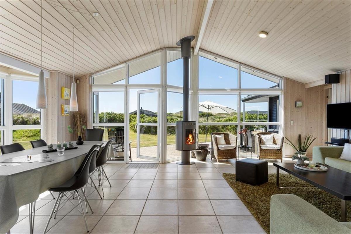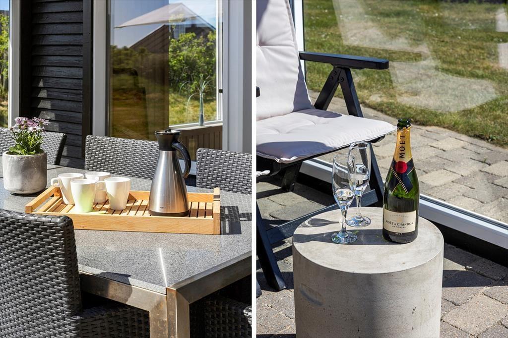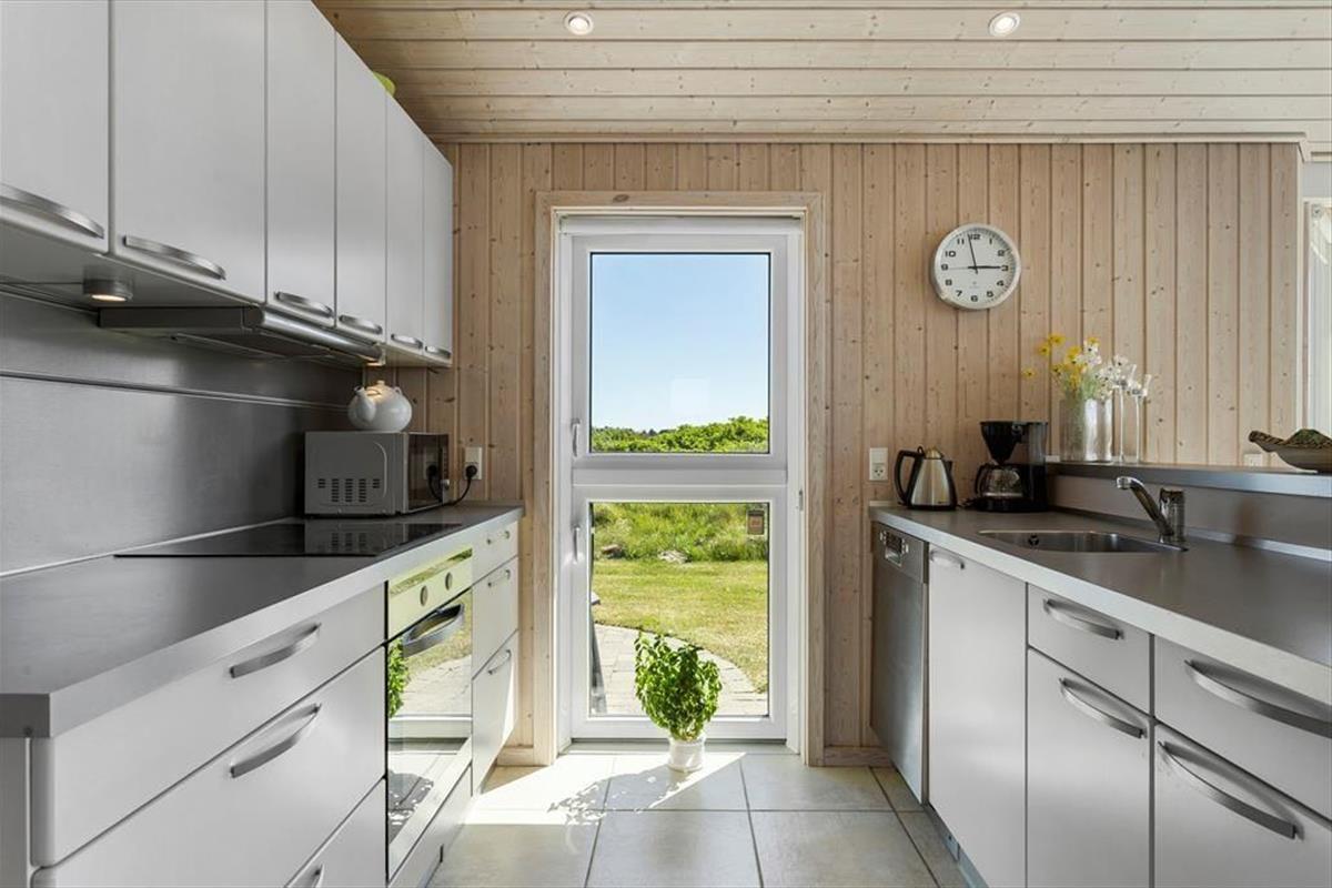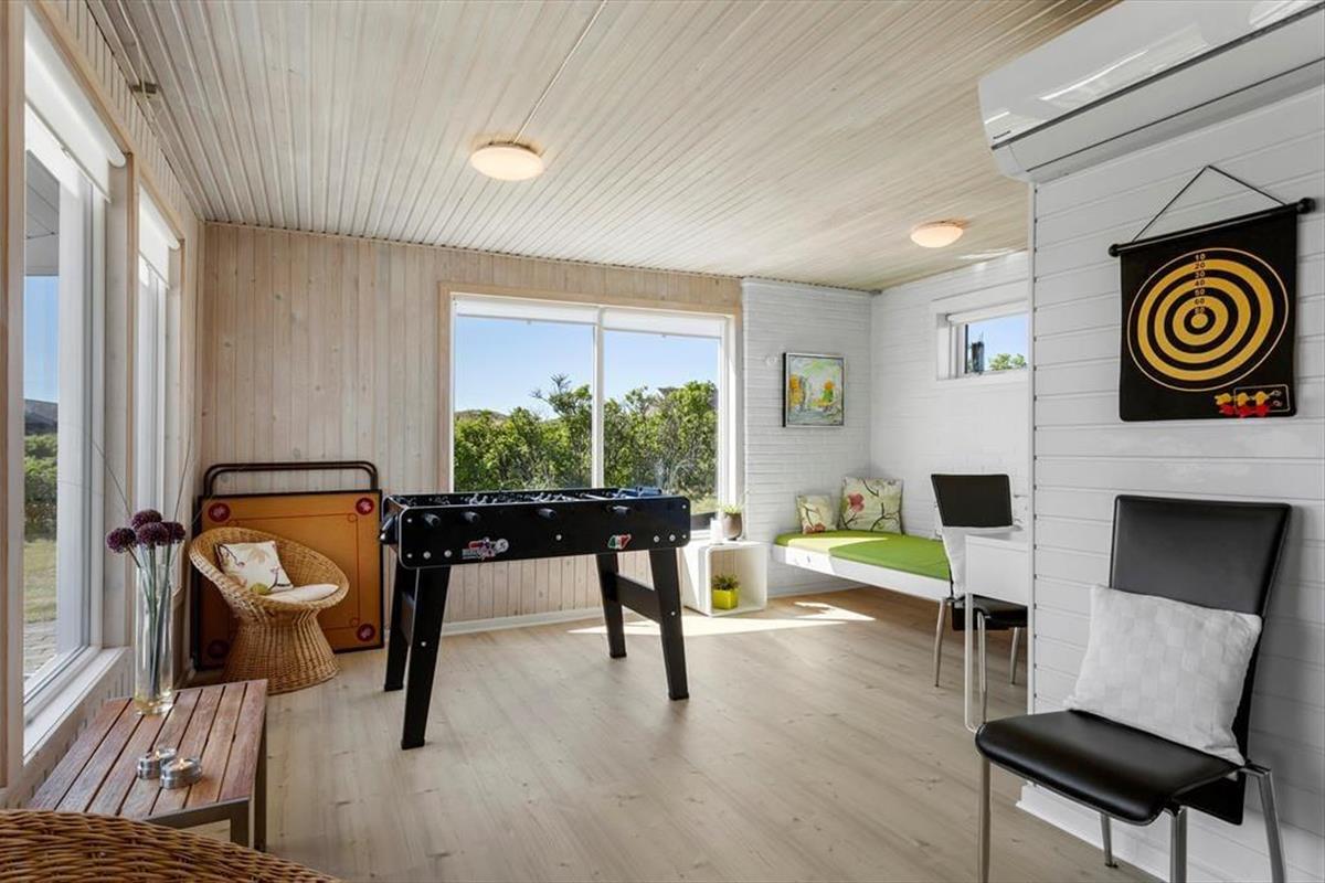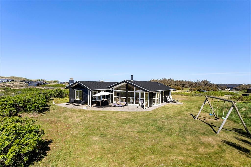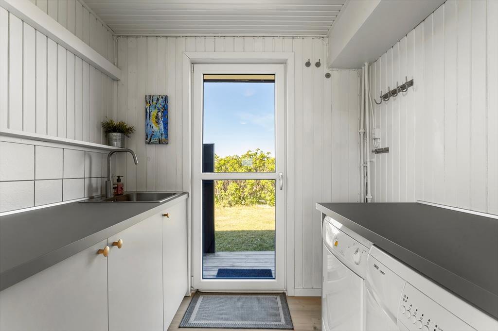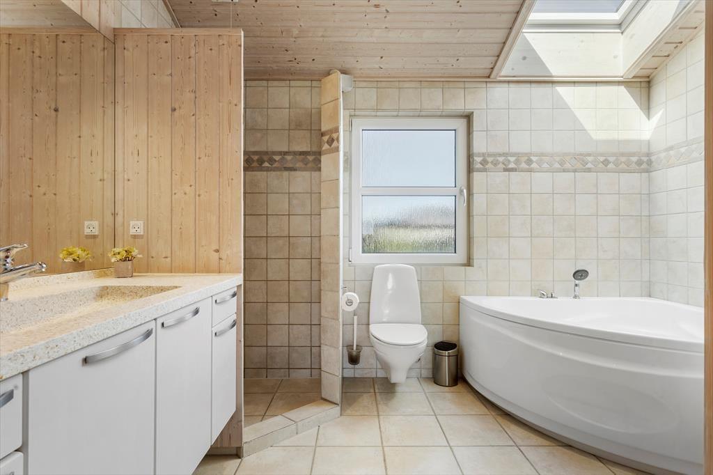Das Haus befindet sich in ruhiger Lage, umgeben von der schönen Natur Løkkens. Hier kann man wunderbar zur Ruhe kommen und den dänischen Sommer in vollen Zügen genießen. Von Wohnzimmer und Küche aus gelangt man auf die große, geflieste Terrasse, und hinter dem Haus gibt es eine weitere, kleinere Terrasse mit gutem Windschutz. Eine Außendusche sorgt dafür, dass man den Sand der Nordsee bequem abspülen kann, bevor man das Haus betritt.