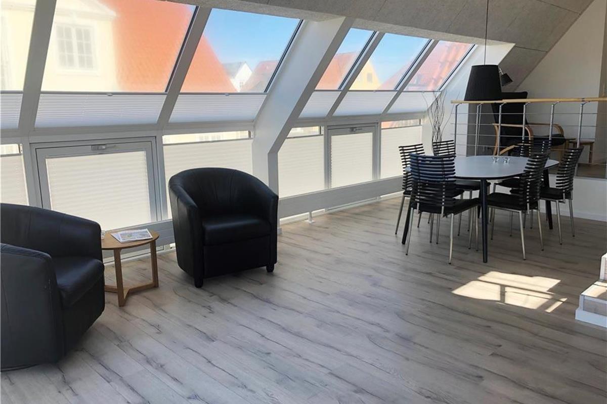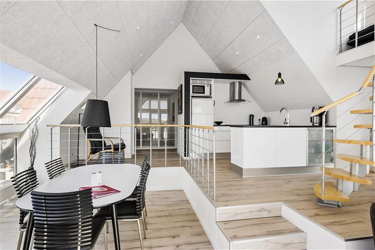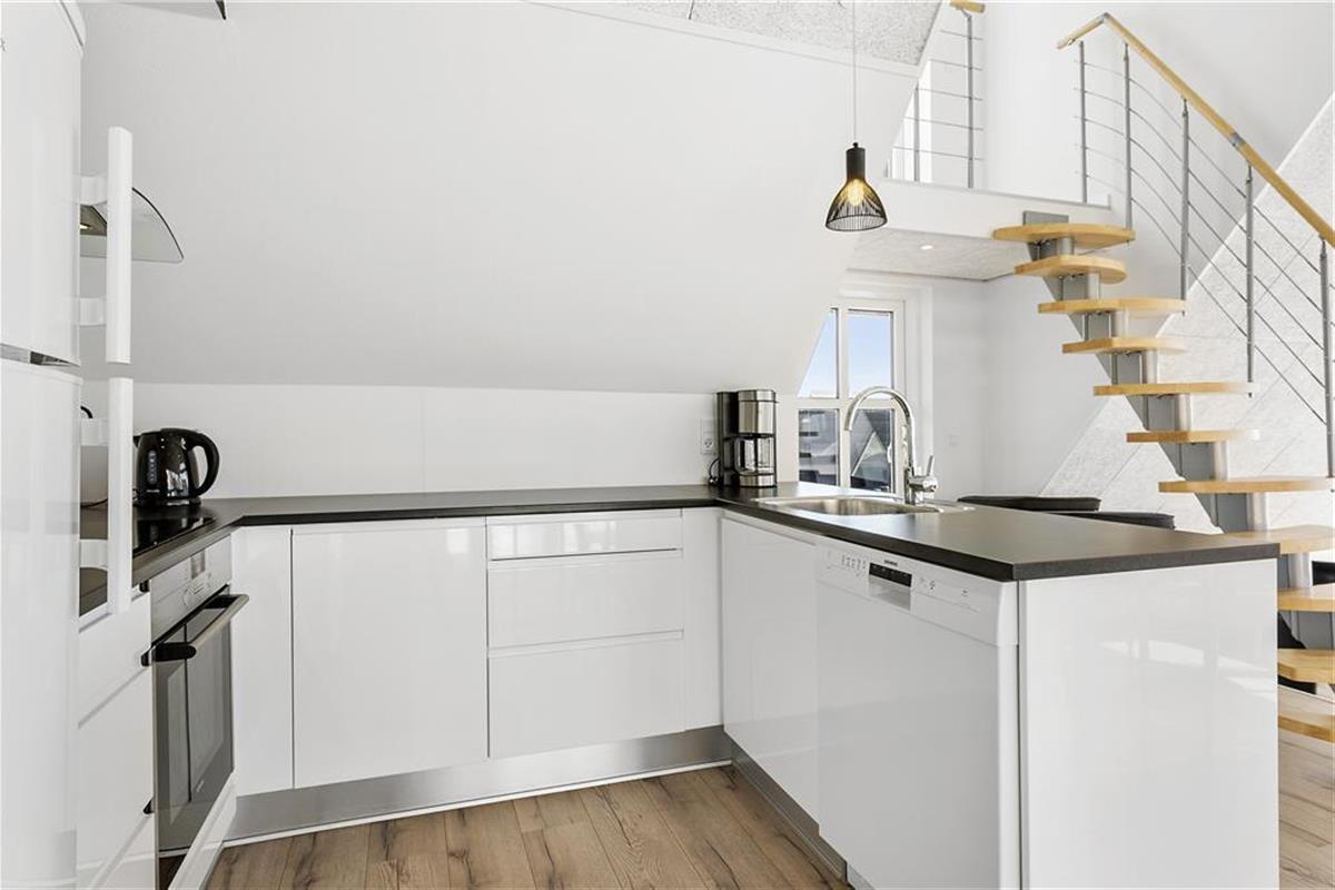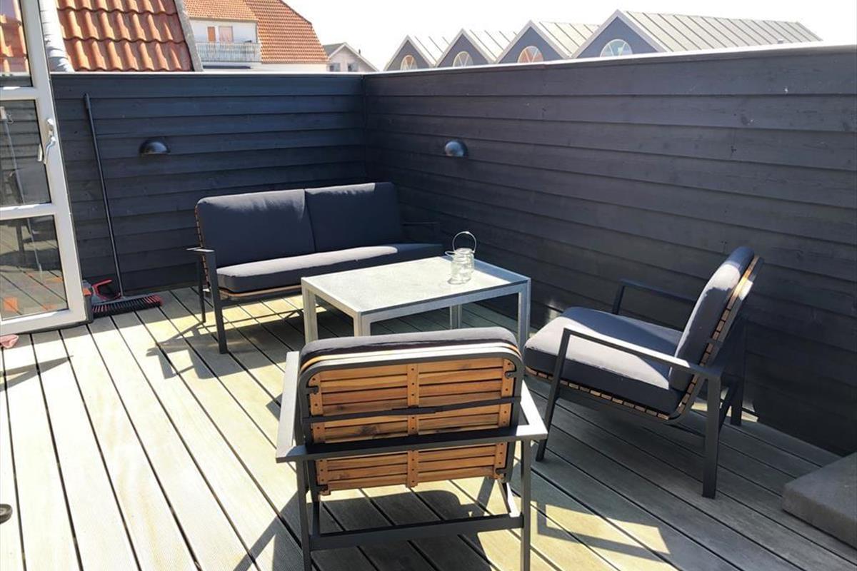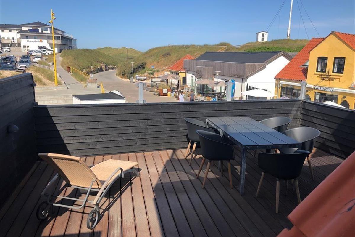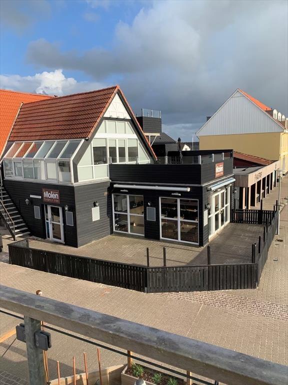 Zur Wohnung gehört eine große und wunderschöne Holzterrasse mit insgesamt 65 m². Sie verläuft rund um die Wohnung und hat Ausgänge sowohl aus der Küche als auch aus dem Wohnzimmer. Auf den versetzten Ebenen bietet sich ein Blick auf das Leben in Løkken nach Westen und Süden, und wenn man ganz ungestört von vorbeigehenden Personen sein möchte, kann man über die Treppe in der Küche auf dem geschlossenen Balkon sitzen, der durch eine Glaswand einen herrlichen Meerblick bietet. Man sollte jedoch beachten, dass es aufgrund der zentralen Lage tagsüber eine Menge vorbeigehender Menschen und Geräusche aus dem lebhaften Stadtleben geben kann. In der Nähe gibt es einen großen Parkplatz, auf dem das Auto abgestellt werden kann.