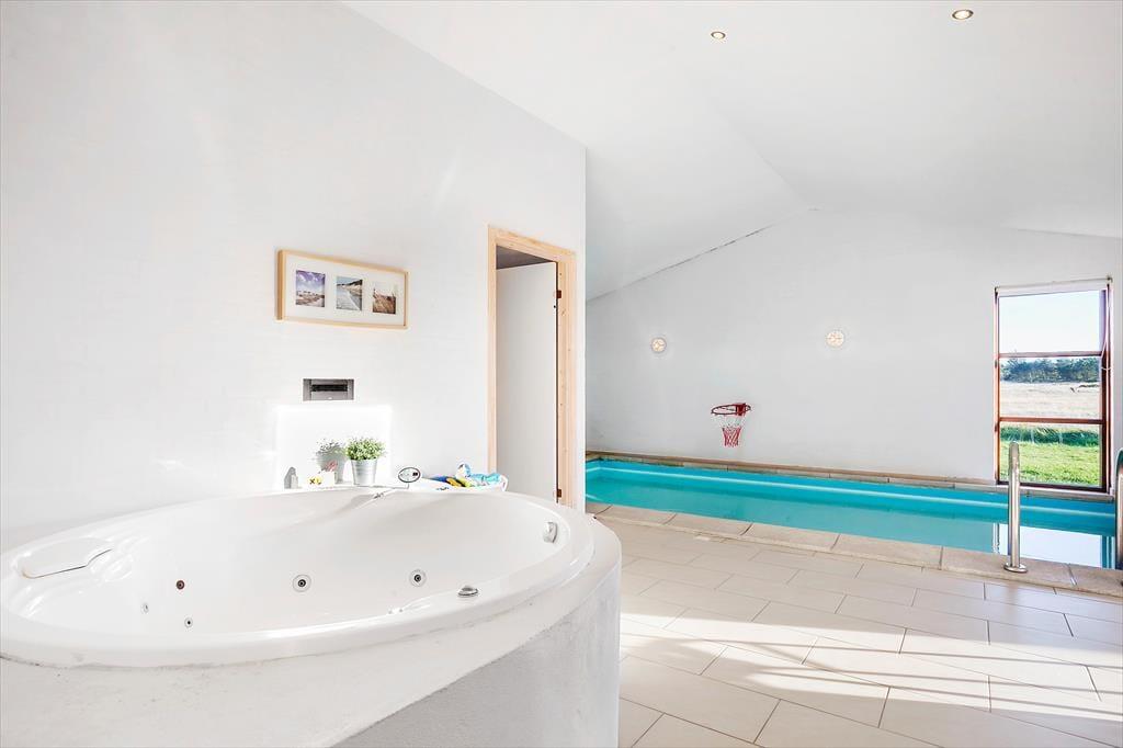 Der schöne, große Poolbereich mit einem 16 m² großen Pool lädt zu vielen Stunden Spaß und Freude ein. Nach dem Wasserspaß steht die Sauna zur Verfügung, und wenn ihr noch nicht genug Wasser hattet, wartet der Whirlpool, um eure müden Körper zu verwöhnen.