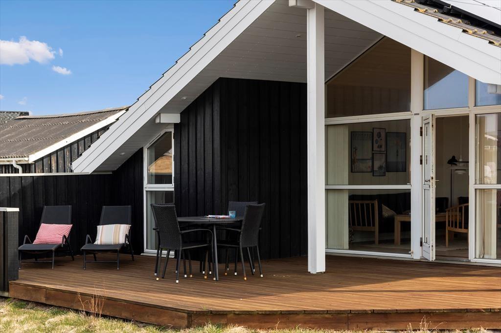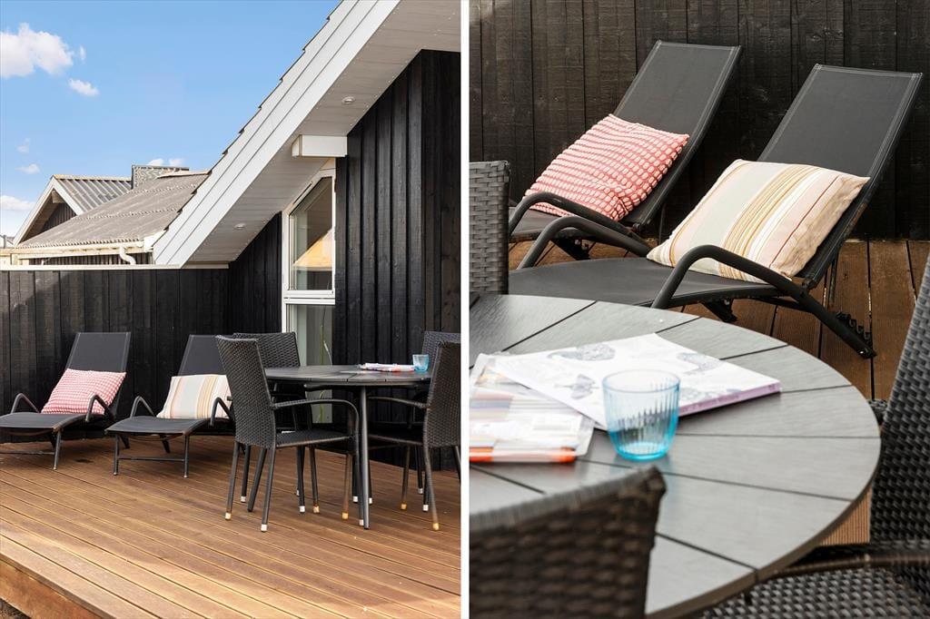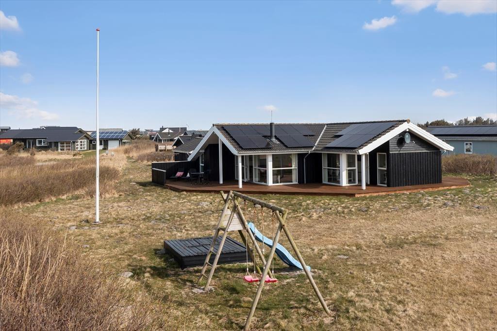 Das Ferienhaus liegt auf einem großen Rasengrundstück mit einer gepflegten Rasenfläche, die viel Platz zum Toben und Ballspielen bietet. Für die Kleinsten gibt es dort auch einen Sandkasten und eine Schaukel. Das Haus ist eingefasst von einer großen Holzterrasse, die dazu einlädt, den Grill anzuschmeißen und die schönen lauen Sommerabende zu genießen.