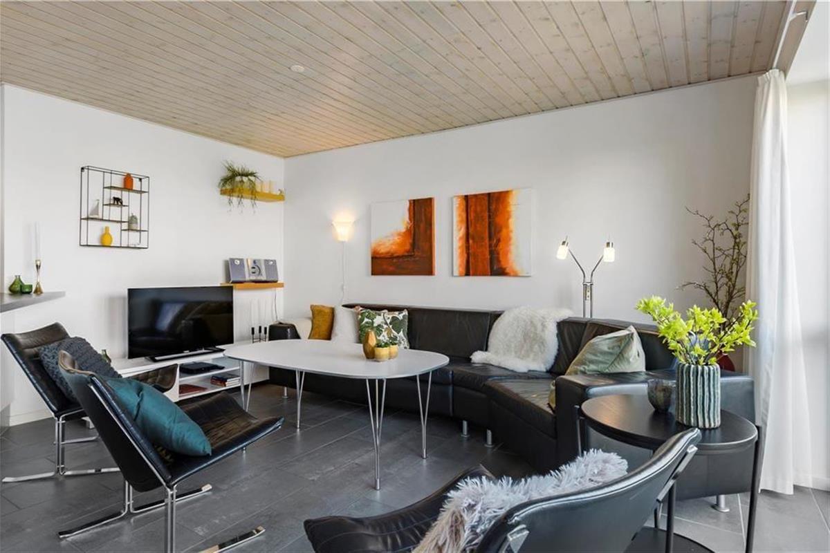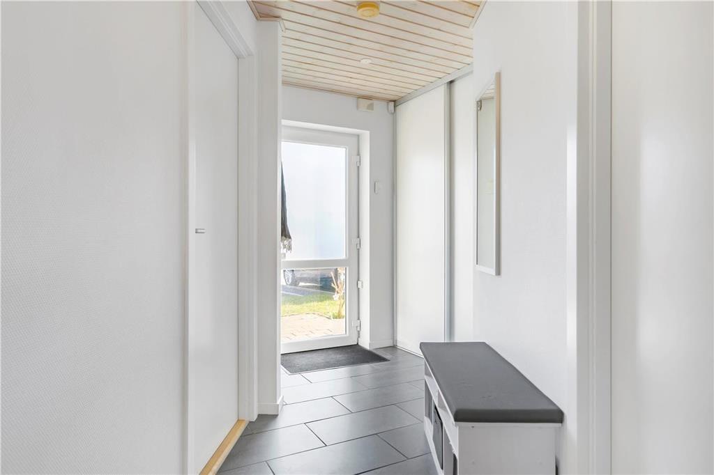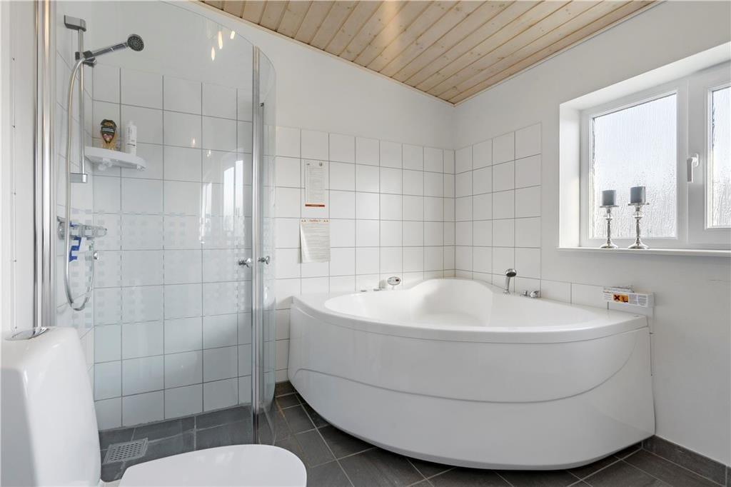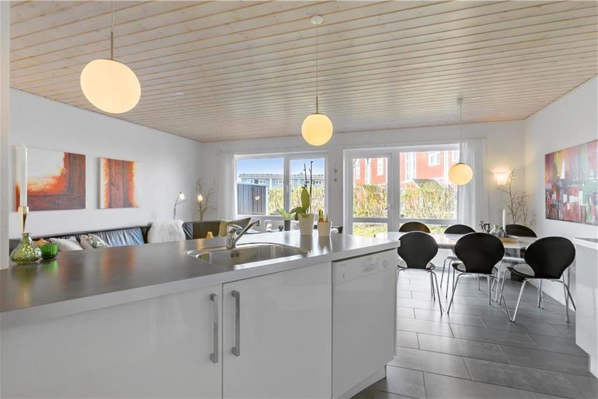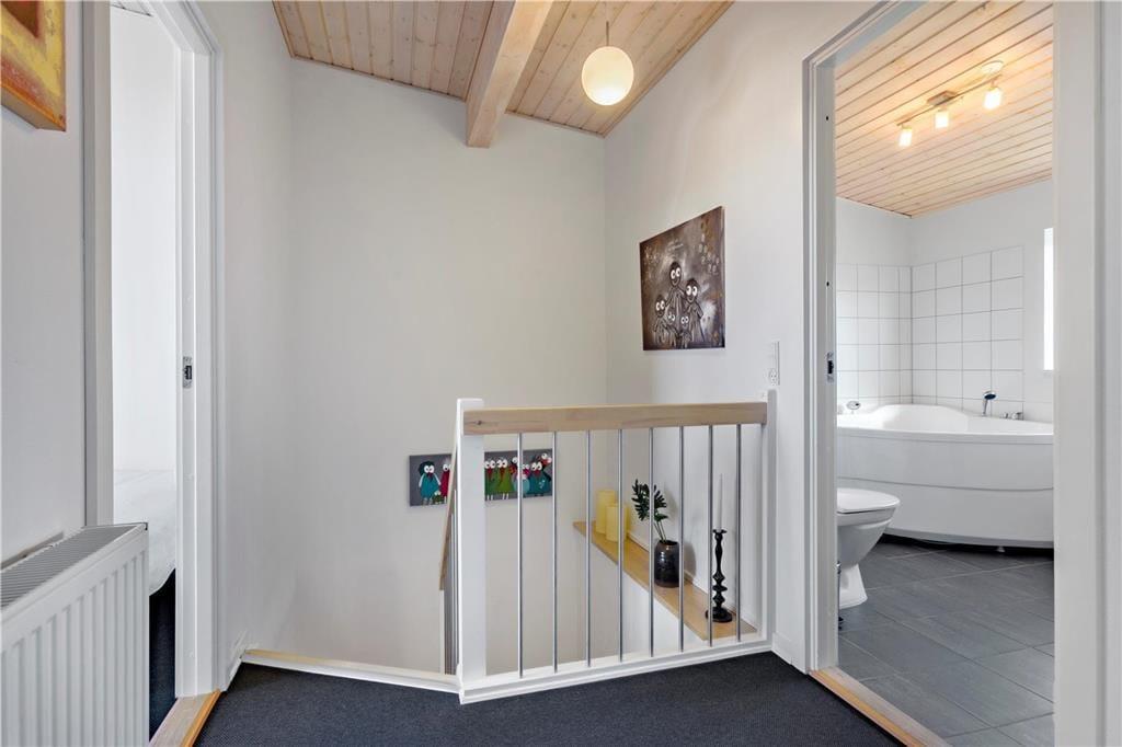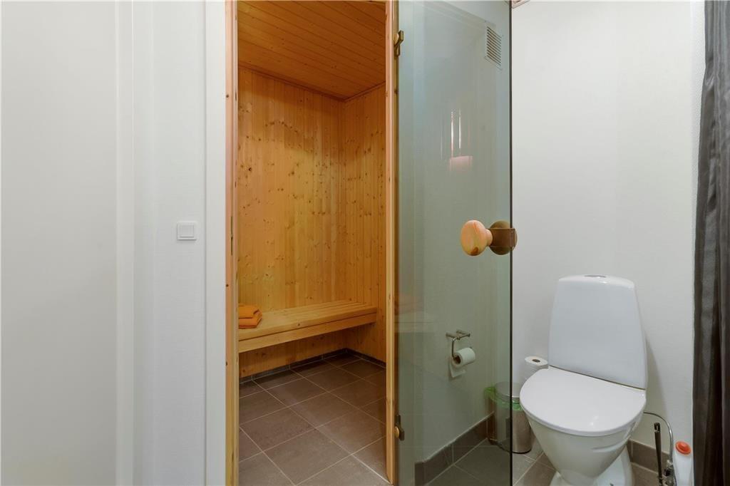Die Ferienwohnung liegt in einem Reihenhaus auf zwei Etagen und gehört zu dem Ferien-park, Nordenlys. Im Erdgeschoss befindet sich eins der vier Schlafzimmer des Hauses, eins der Badezimmer mit Sauna und der schöne und stilvoll eingerichtete Wohnbereich mit Wohnküche, von wo man Zugang zu der Steinterrasse hat. Auf der oberen Etage befinden sich die 3 anderen Schlafzimmer. Von zwei der Schlafzimmer hat man Zugang zu dem grossen teilweise überdachten Balkon. Das grosse Badezimmer verfügt über WC, Dusche und Whirlpool.