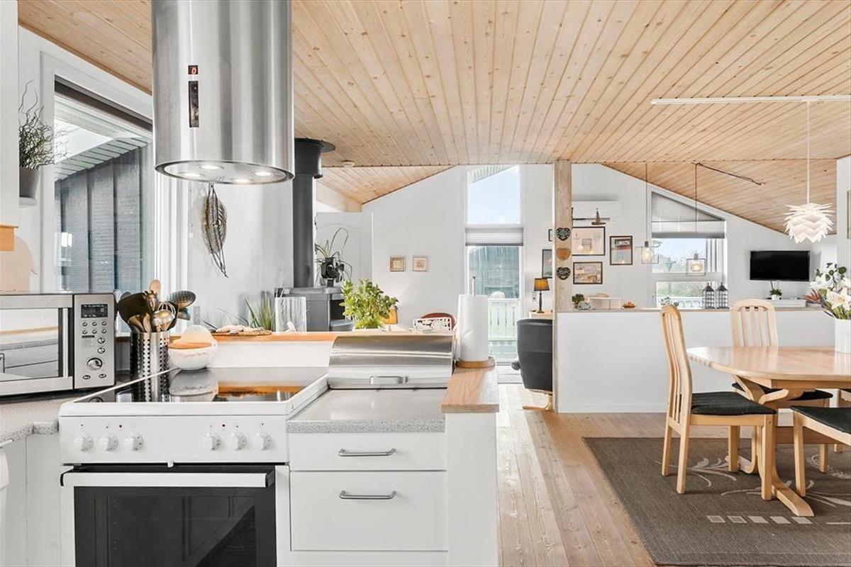 Für eine große Familie oder zwei gemeinsam reisende Familien ist in diesem gepflegten Ferienhaus ausreichend Platz. Es gibt vier Schlafräume mit acht Betten und ein Badezimmer mit Duschkabine, Whirlpool und Sauna. Für Kinder sind Babybett und Hochstuhl vorhanden. Die Küche und der Essbereich sind offen kombiniert, das Wohnzimmer mit TV ist durch eine halbhohe Mauer und eine Stufe tiefer davon abgegrenzt. Ein gut ausgestattetes Ferienhaus mit Waschmaschine, Wäschetrockner, Geschirrspüler, Kamin und WLAN. Eine angenehme Kombination von moderner Einrichtung und der Möglichkeit, sich in aller Gemütlichkeit zu entspannen. Im Sommer lassen sich die Terrassentüren im Wohnzimmer, Essbereich und Badezimmer öffnen, um frische Luft hinein zu lassen.