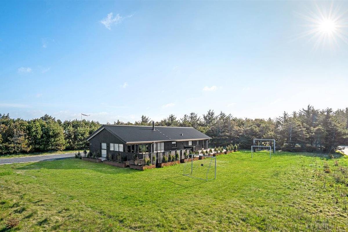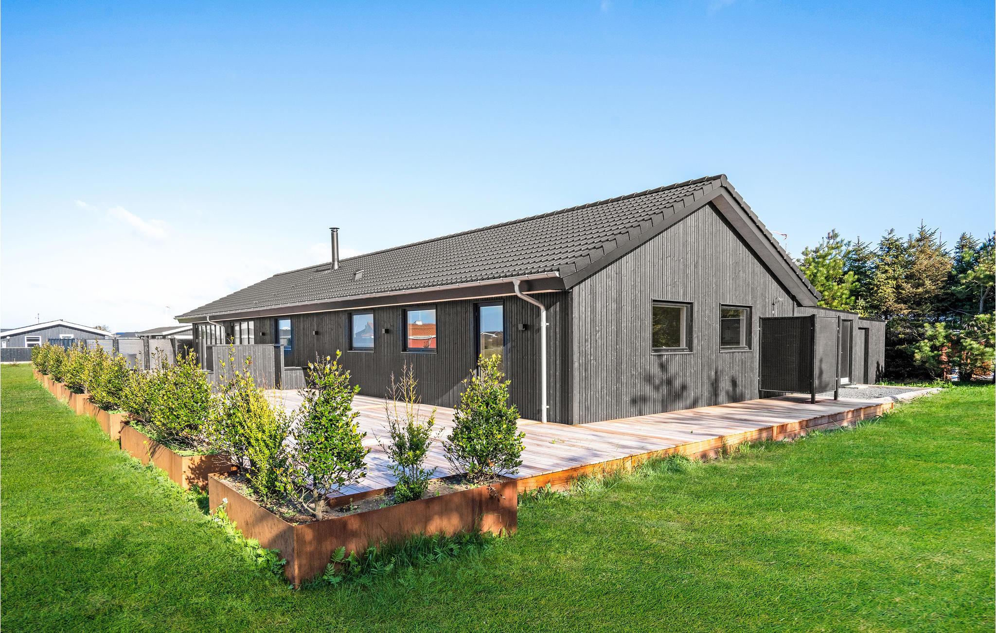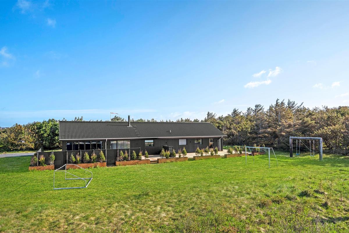 Modern houten vakantiehuis met sauna, dichtbij het zandstrand en voorzien van ruime tuin en speeltoestellen.