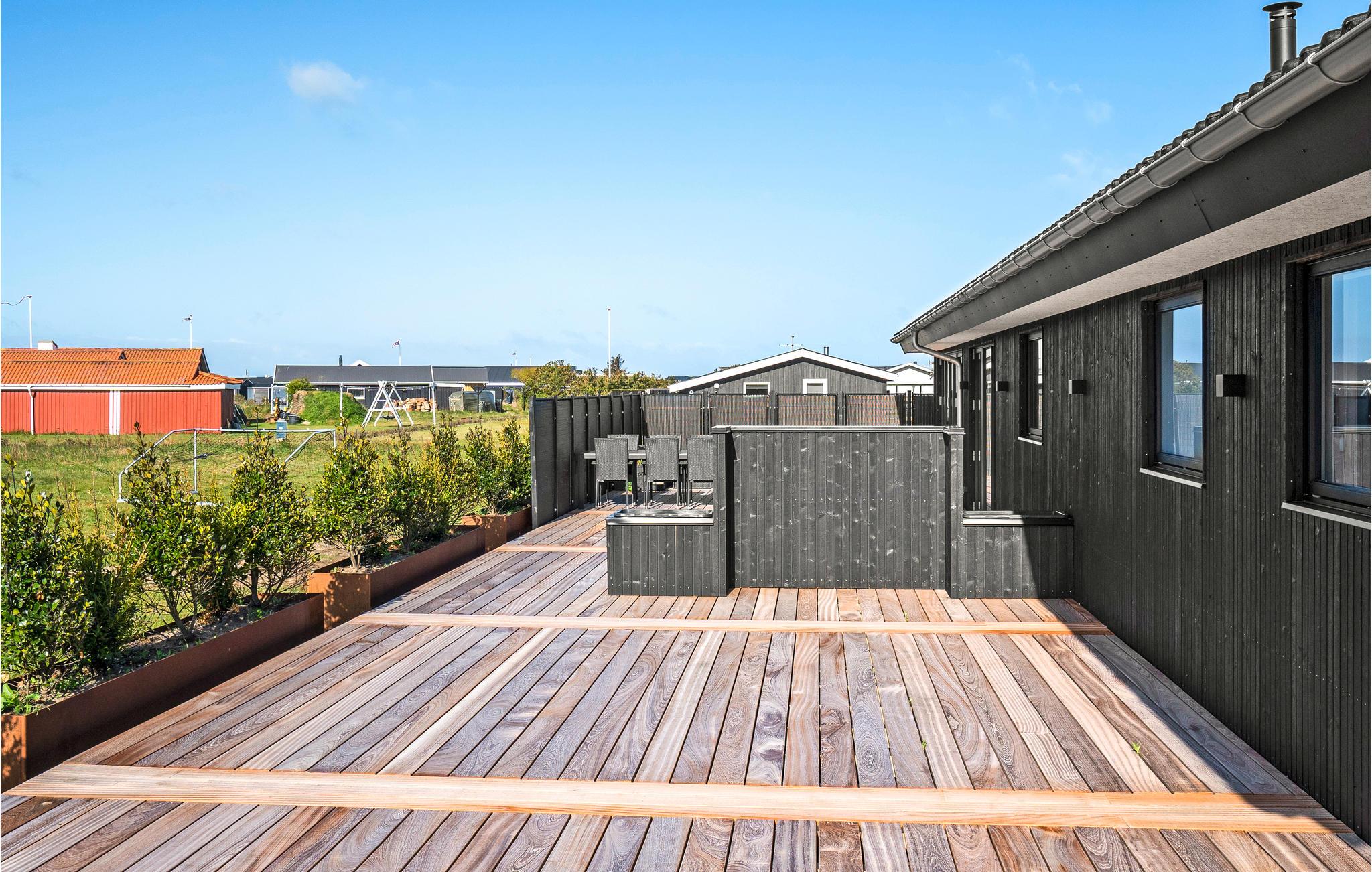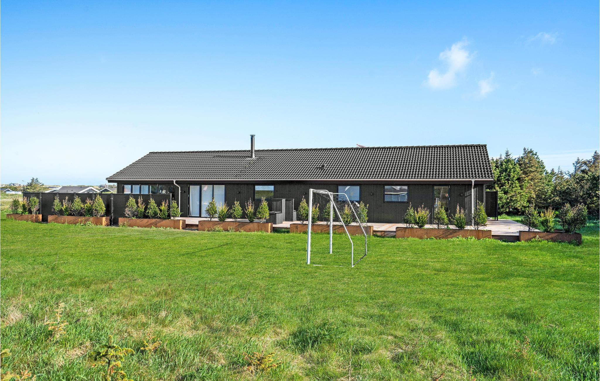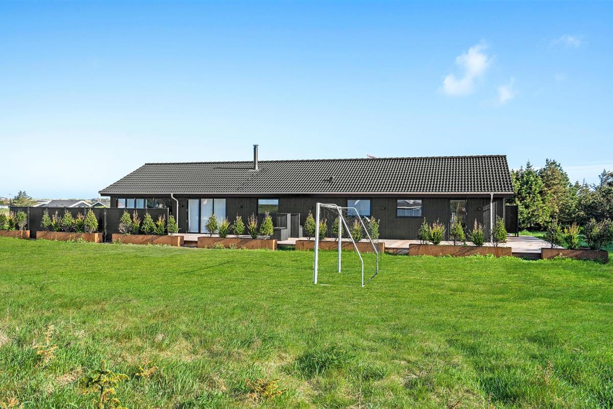 Modern houten vakantiehuis met sauna, dichtbij het zandstrand en voorzien van ruime tuin en speeltoestellen.