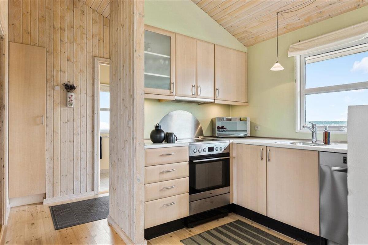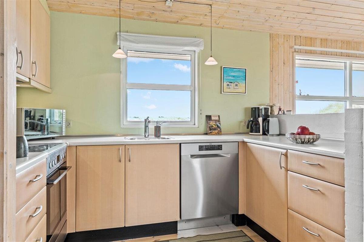 Beleef ontspannen dagen in je charmante vakantiehuis in het duinlandschap van Løkken. Deze gezellige accommodatie biedt alles wat je nodig hebt voor een ontspannen vakantie met het gezin. De moderne, lichte keuken nodigt uit om te koken en biedt een prachtig uitzicht op de omliggende natuur. Het woon- en eetgedeelte met zijn grote ramen laat veel licht binnen en creëert een uitnodigende sfeer. Breng je vrije tijd door op de comfortabele stoelen, speel samen spelletjes of geniet van stimulerende gesprekken bij de houtkachel.