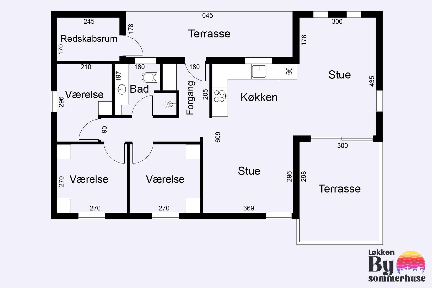 The cottage has three bedrooms, each with double beds. There is a single bathroom and a bright and open kitchen/dining area connected to the living room. The house has a size of 88 square meters, and the plot itself is 400 square meters.