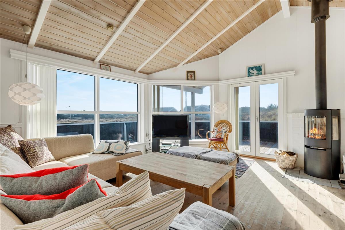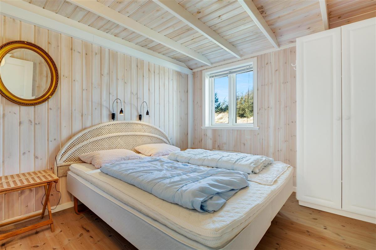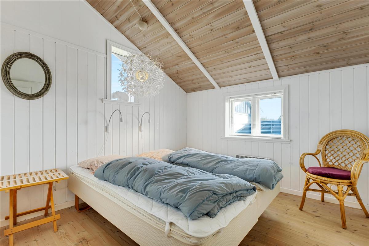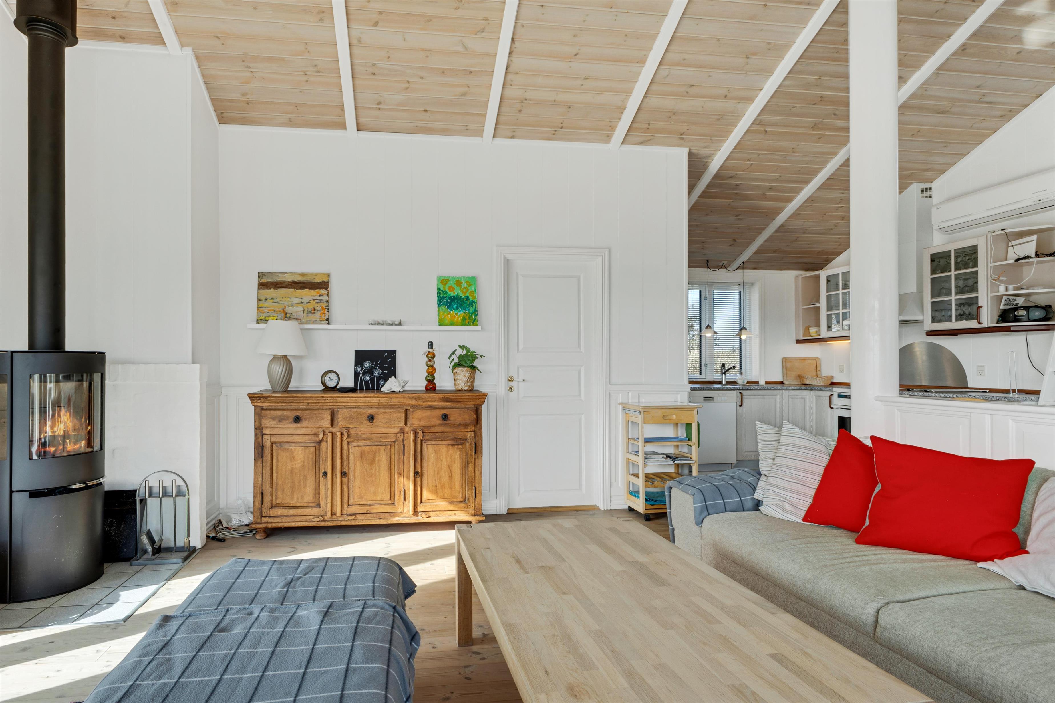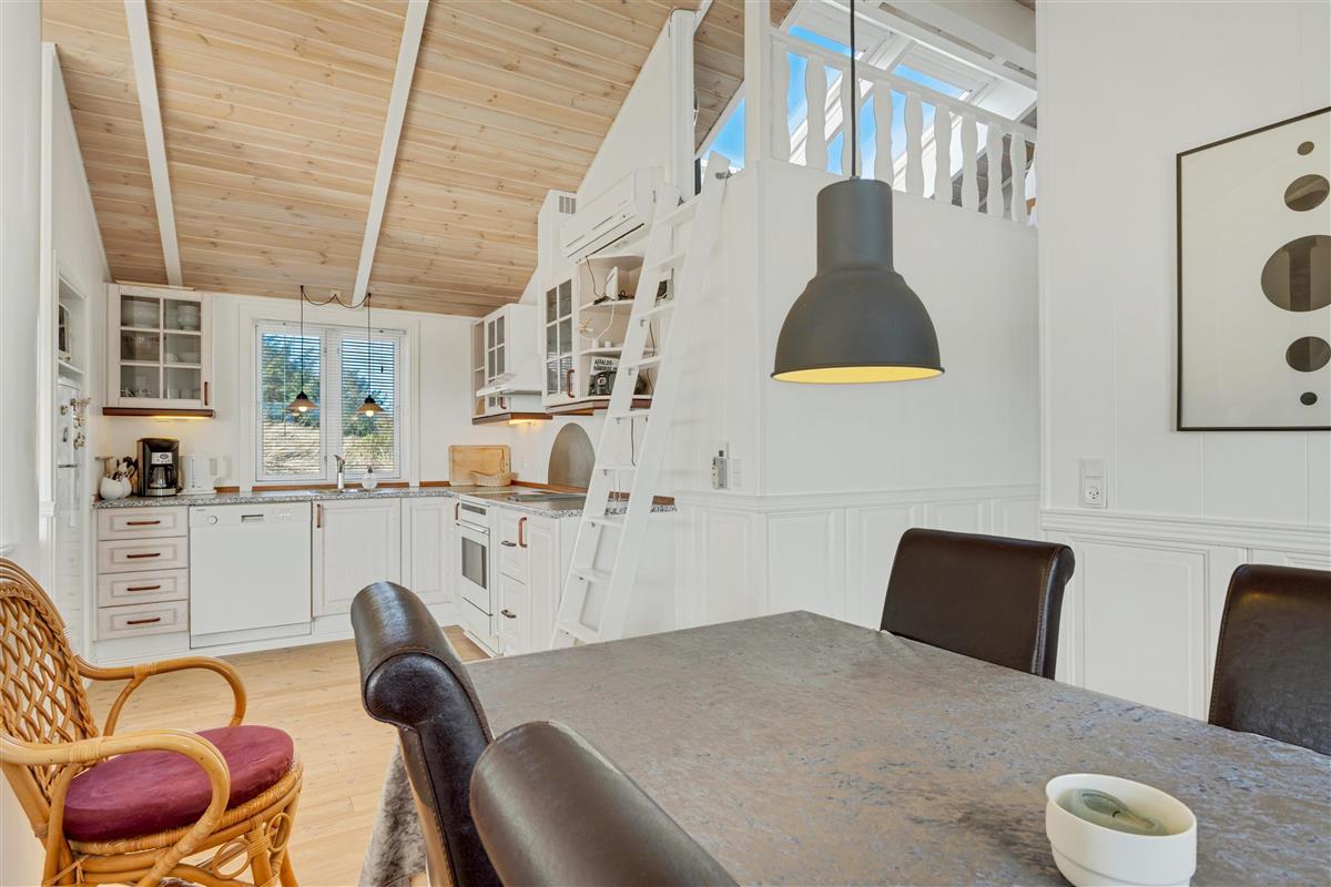 In the house, there are two bathrooms - one of which is with sauna and spa - three bedrooms, and a large, bright kitchen and dining area. Here, there is a genuine holiday home atmosphere with a cozy dining area, panels on the walls, and a lovely sofa area with a fireplace and a view of the beautiful nature outside. There is a loft where the kids can retreat and enjoy the sound of the living room's laughter and the crackling of the fireplace. A really lovely holiday home that invites many hours of vacation relaxation.