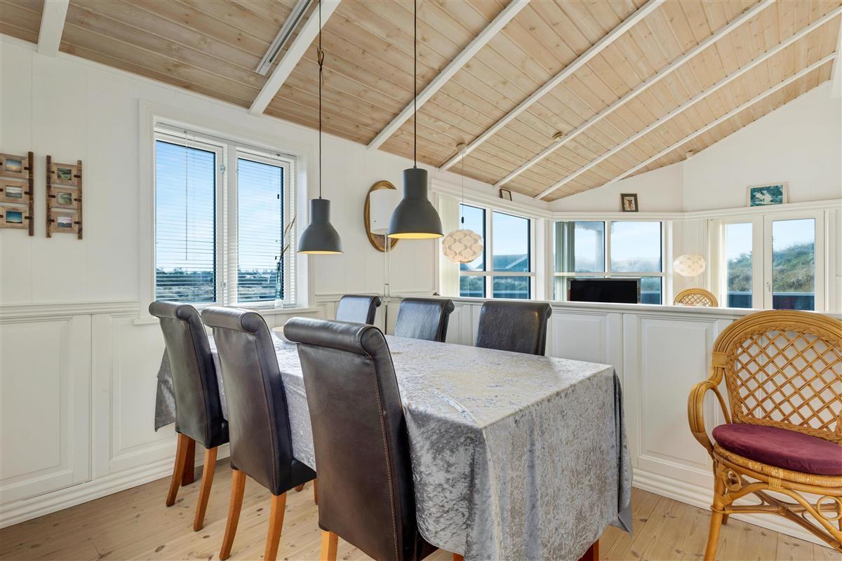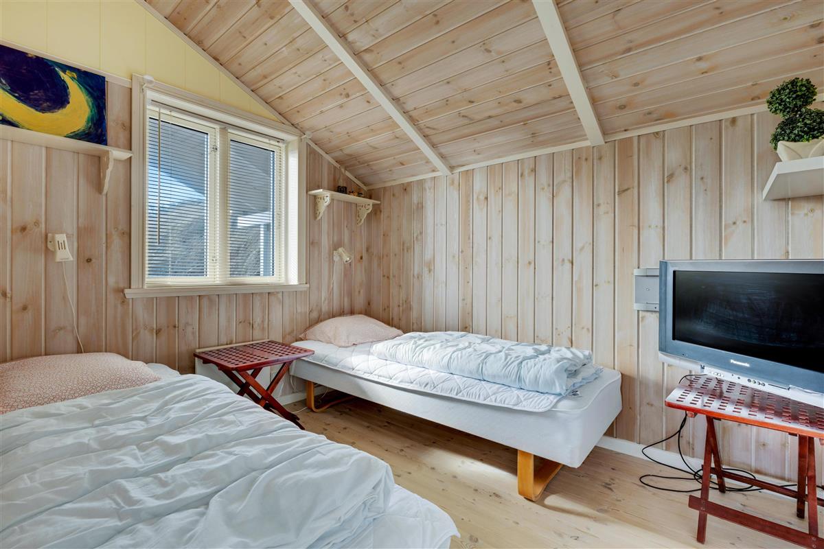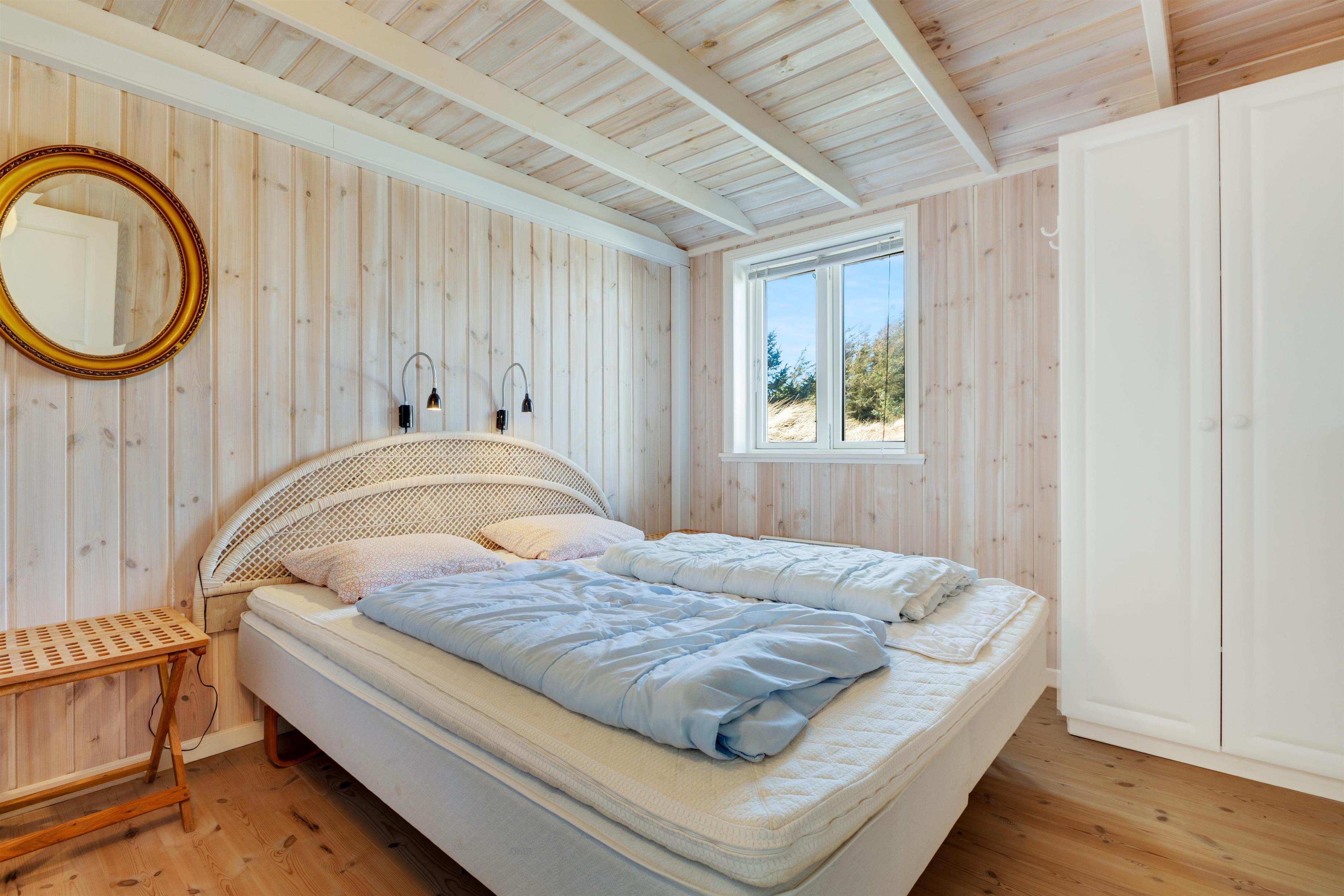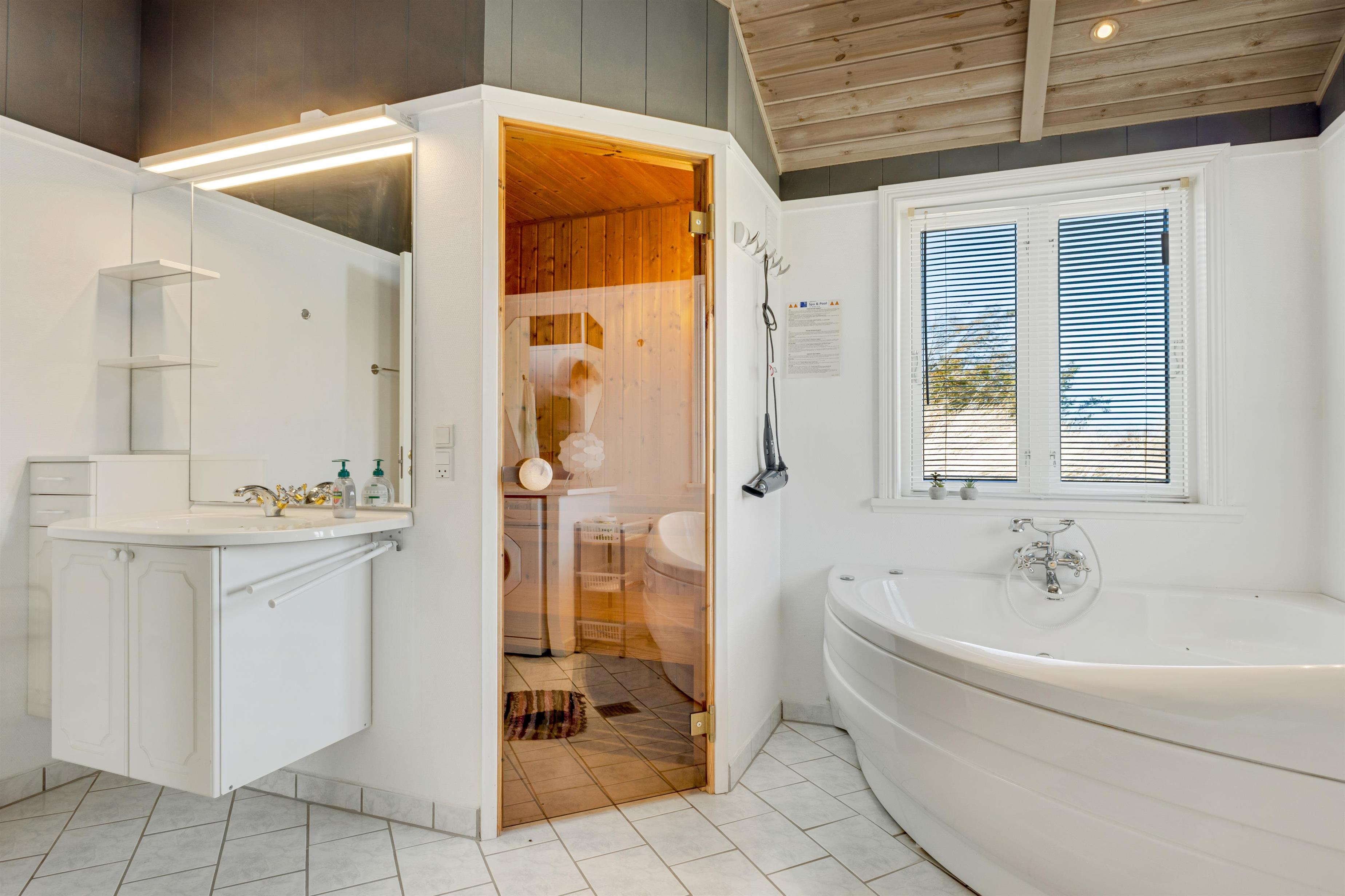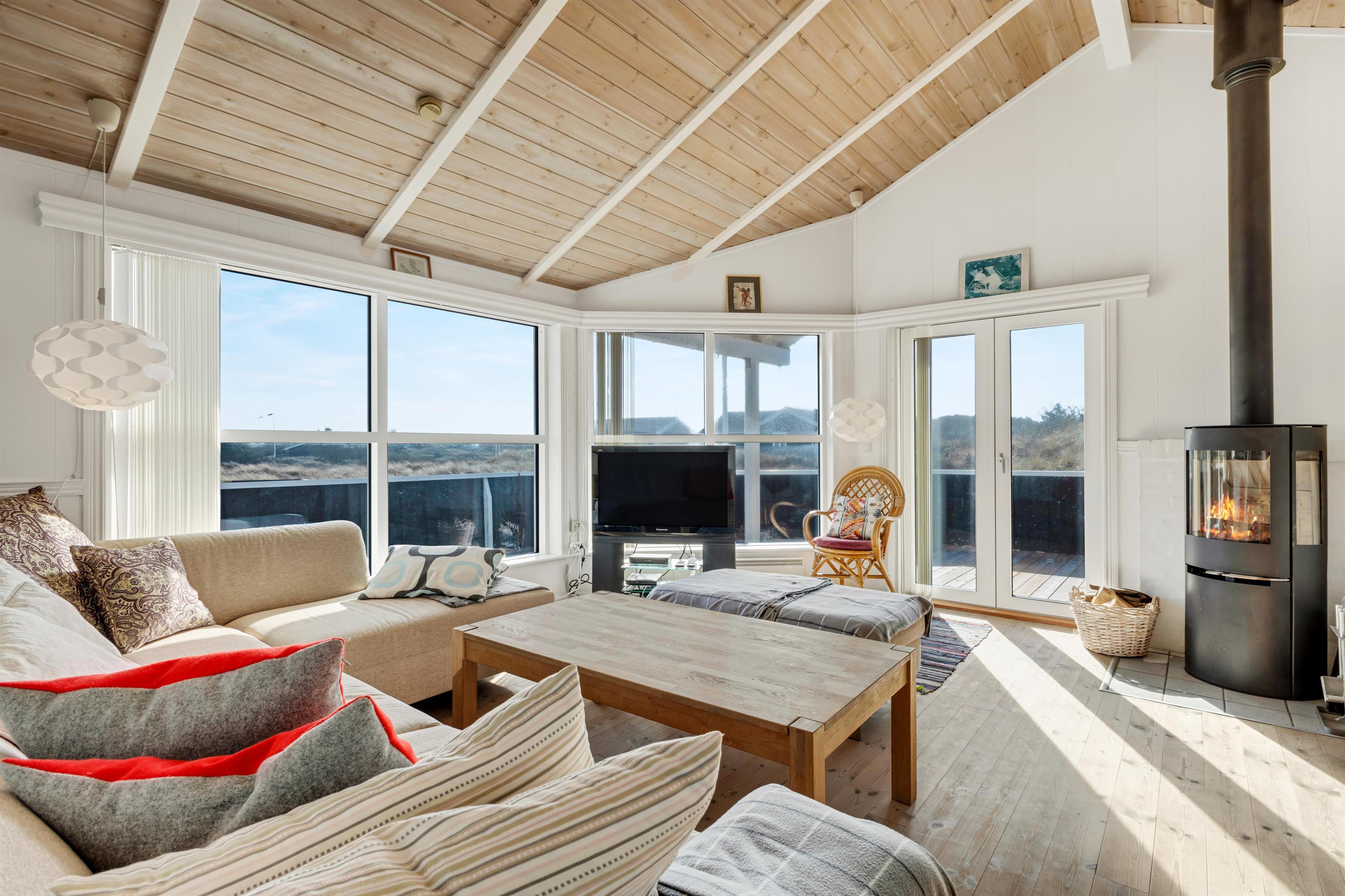 In the house, there are two bathrooms - one of which is with sauna and spa - three bedrooms, and a large, bright kitchen and dining area. Here, there is a genuine holiday home atmosphere with a cozy dining area, panels on the walls, and a lovely sofa area with a fireplace and a view of the beautiful nature outside. There is a loft where the kids can retreat and enjoy the sound of the living room's laughter and the crackling of the fireplace. A really lovely holiday home that invites many hours of vacation relaxation.