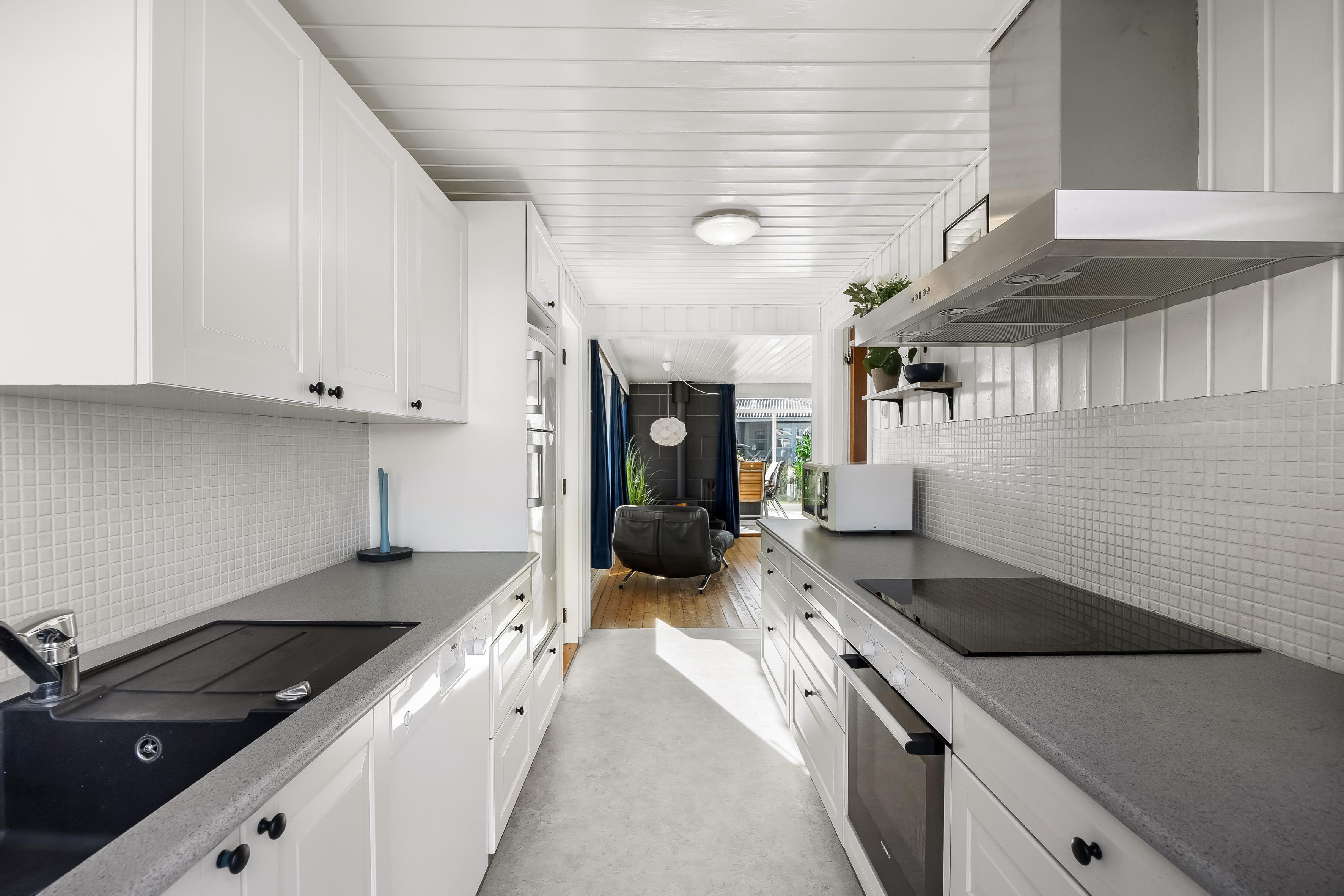 The house has a warm and personal atmosphere where functionality and comfort go hand in hand. The central living area includes a lounge and dining space with a wood-burning stove and large windows that let in light and warmth. A heated garden room provides extra space with views of the landscape – perfect for relaxing in any weather.